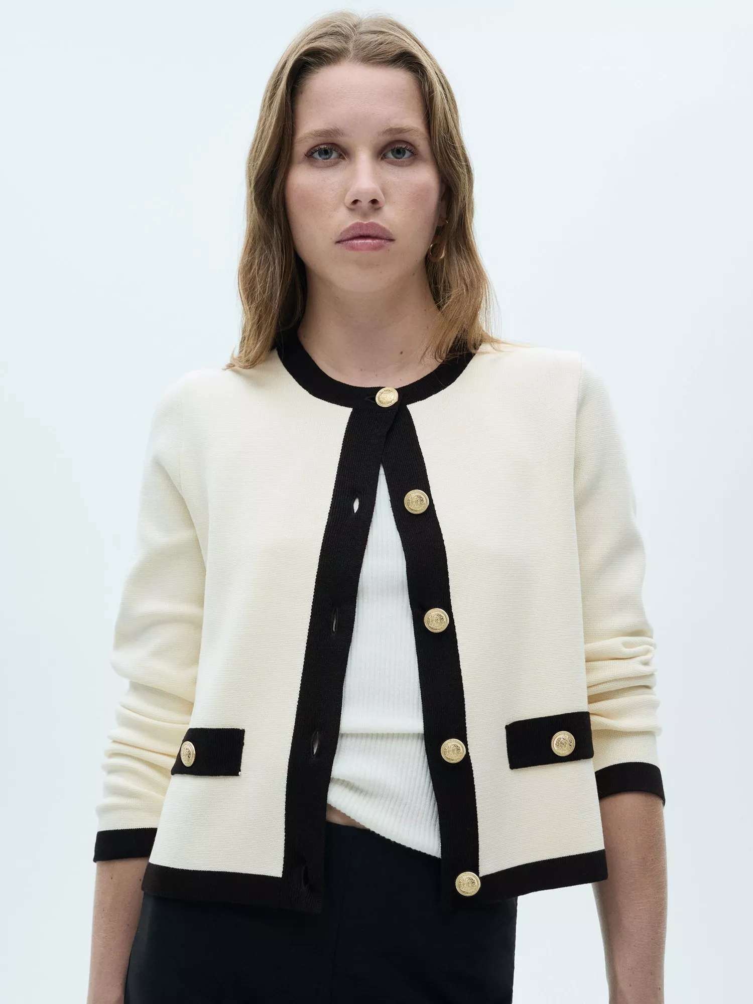 Framed with a classic round neckline, this lightweight jacket from Mango is elevated with a contrast trim and gold-toned button detailing.