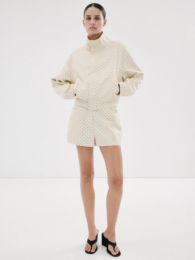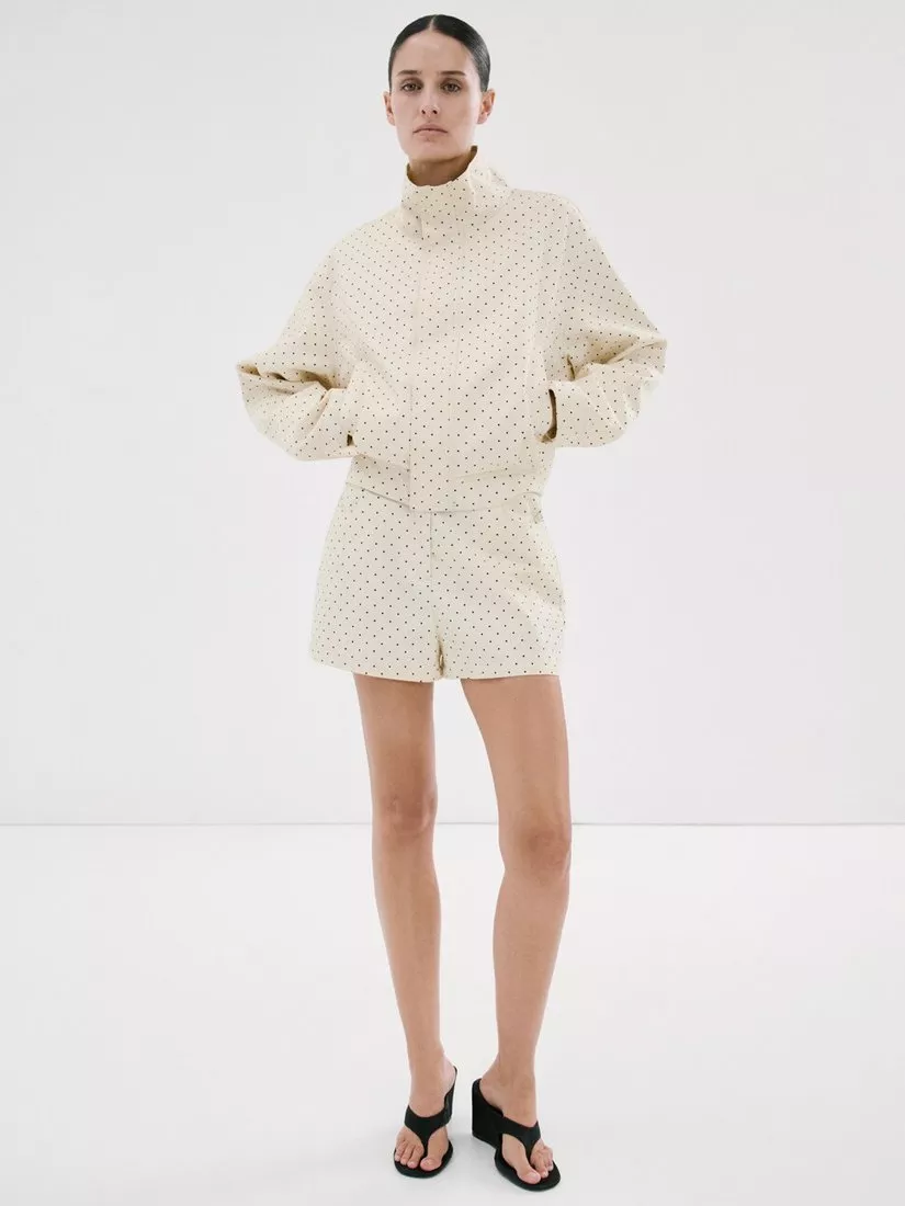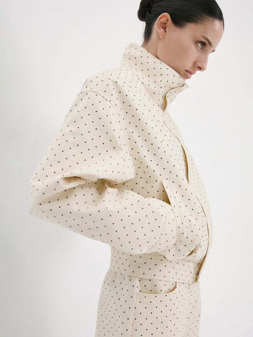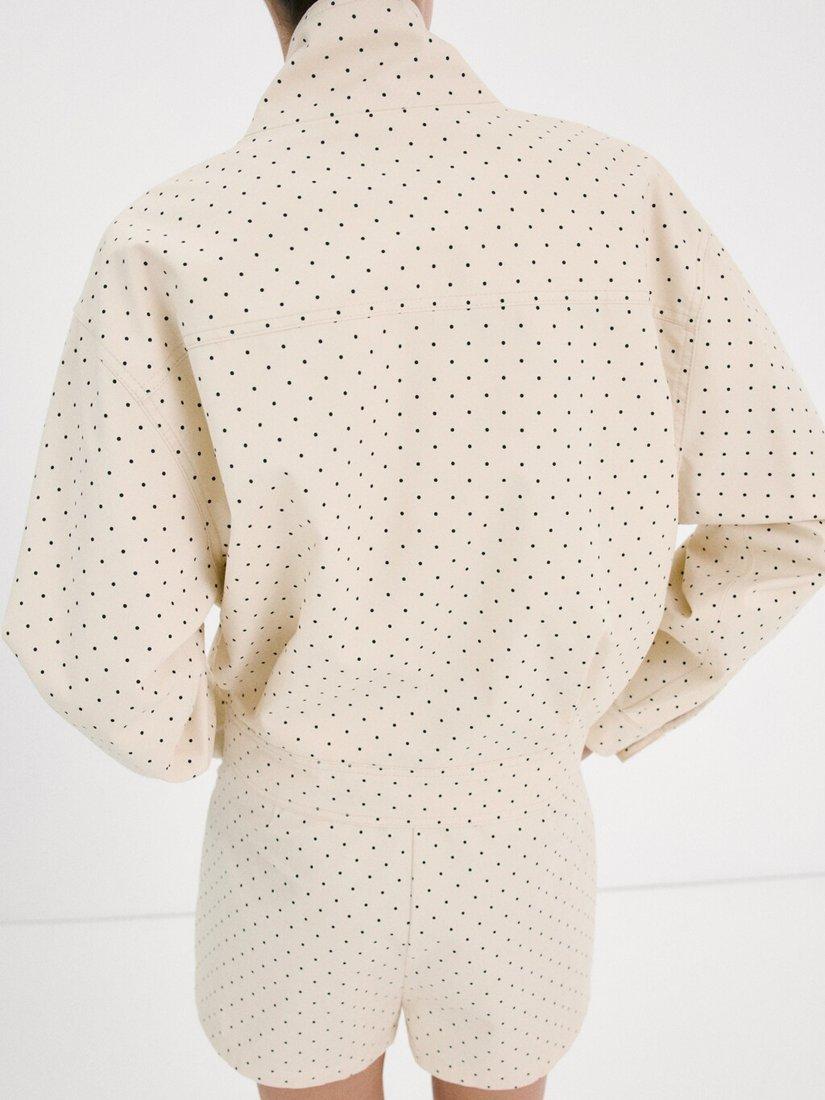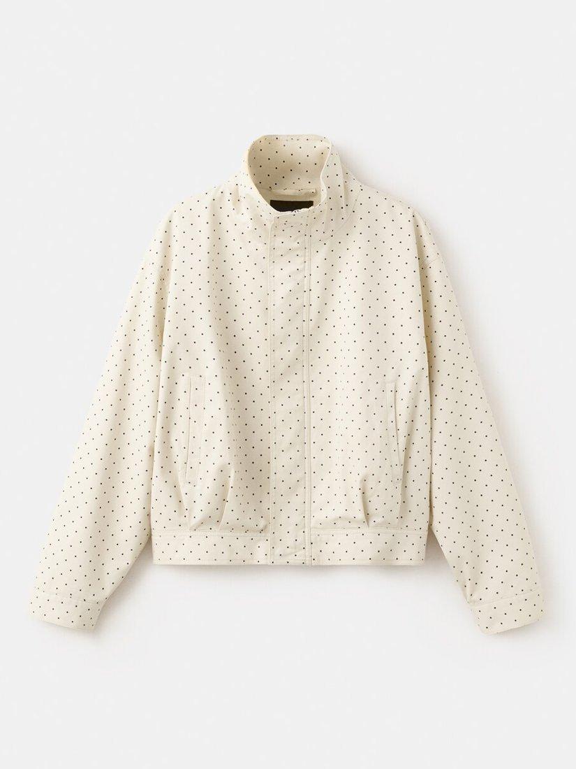 A bomber jacket in pure cotton with a funnel neck and playful polka dot pattern, offering comfort and style for everyday layering. Subtle details and a classic zip fastening make this a versatile choice for daytime plans.