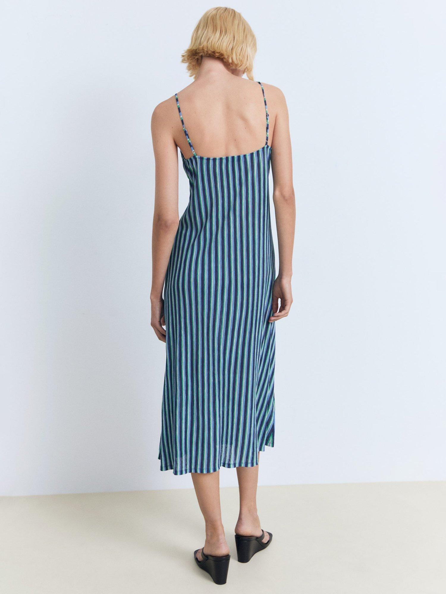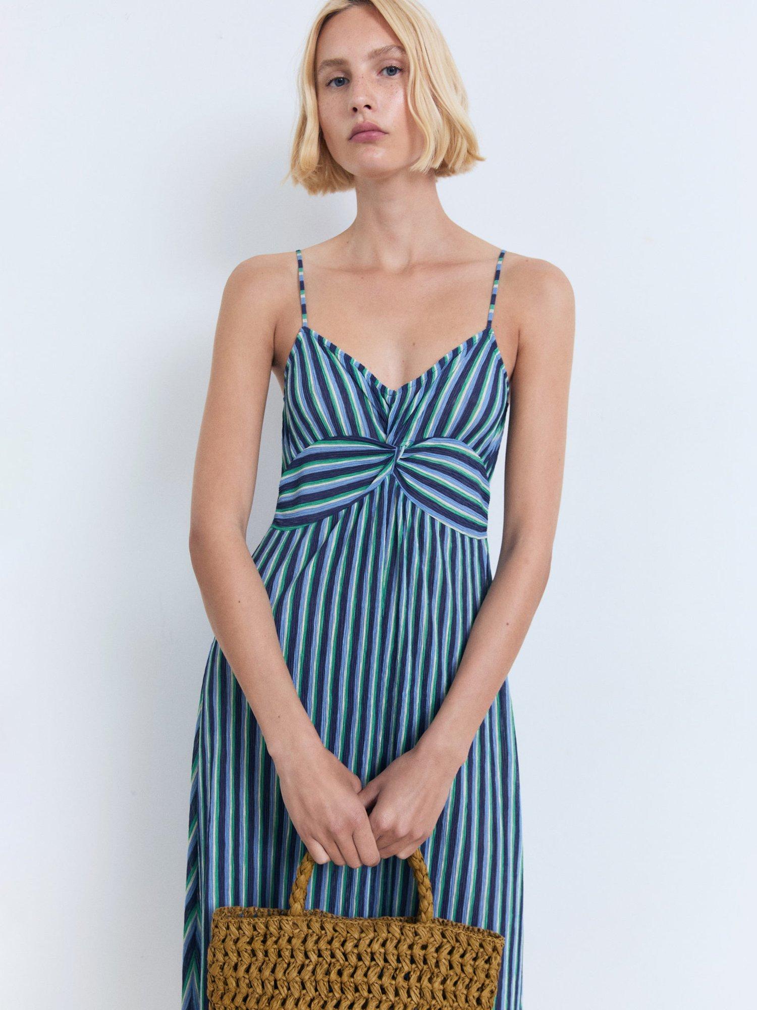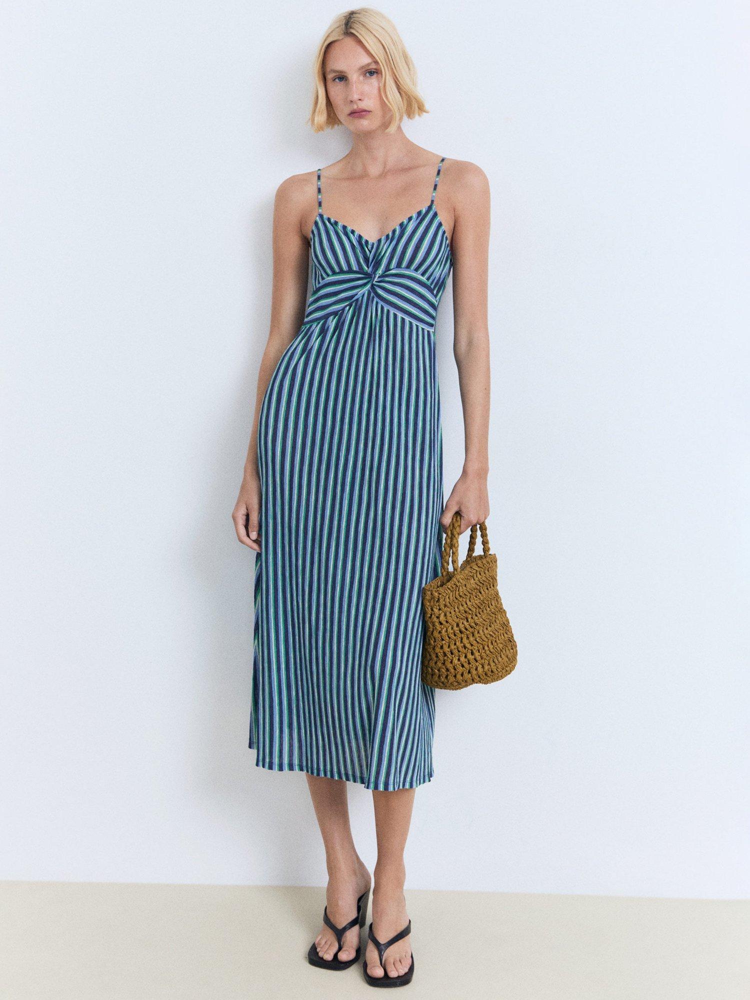 Flattering in all the right places, this slip-on midi dress from Mango features a soft v-neckline with a gathered detail, adjustable thin straps and all-over stripes.