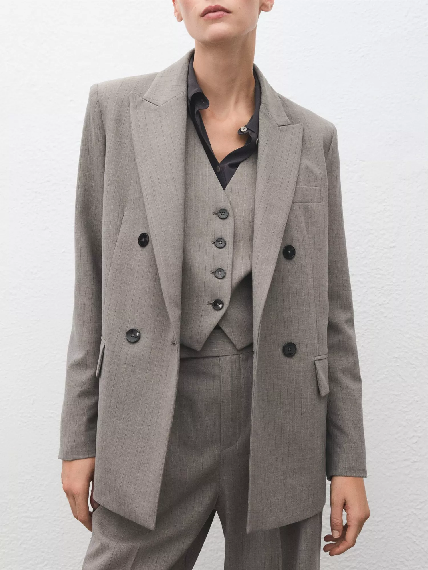 This single-breasted blazer makes an impression, bringing sharp pinstripes and flexibility to your wardrobe. Its sleek V-neck cut and neat button fastening suit your routine, whether you are managing meetings or joining special celebrations.