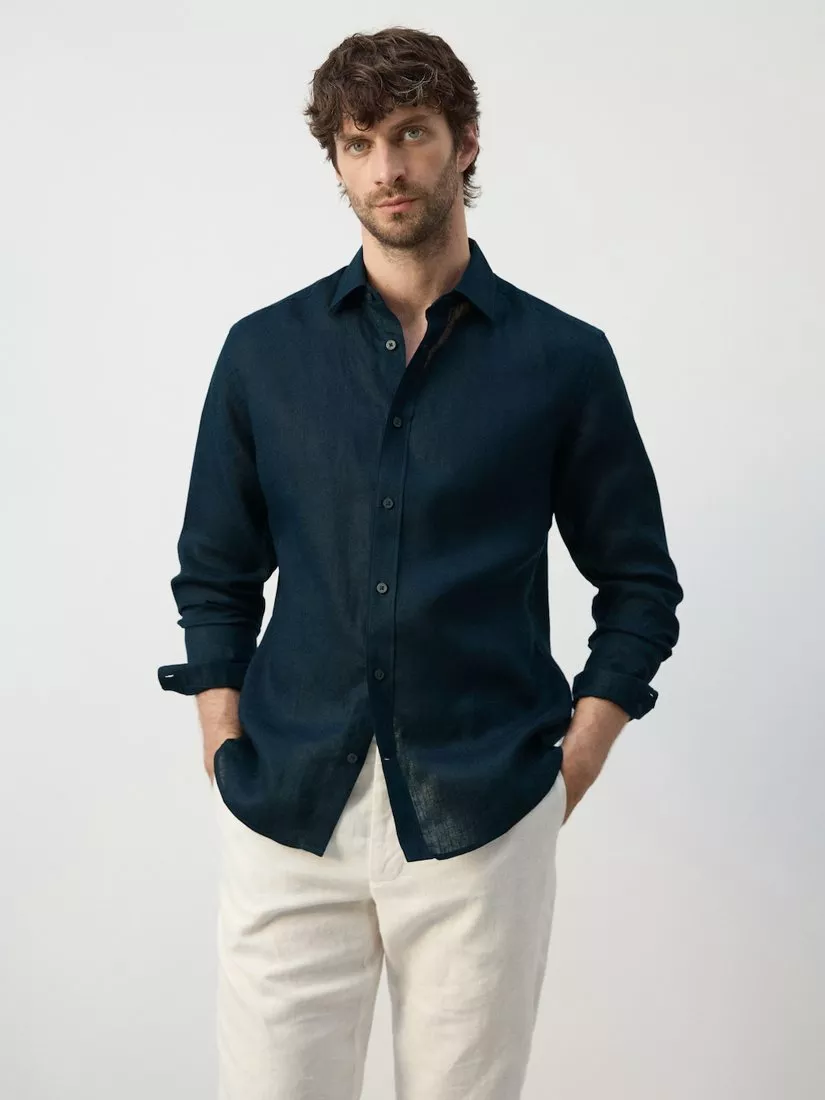 This long-sleeve shirt is made from linen, offering a crisp finish and breathable comfort for day-to-evening wear. Designed with a classic collar and regular cut, it brings relaxed structure to smart or casual looks in any season.