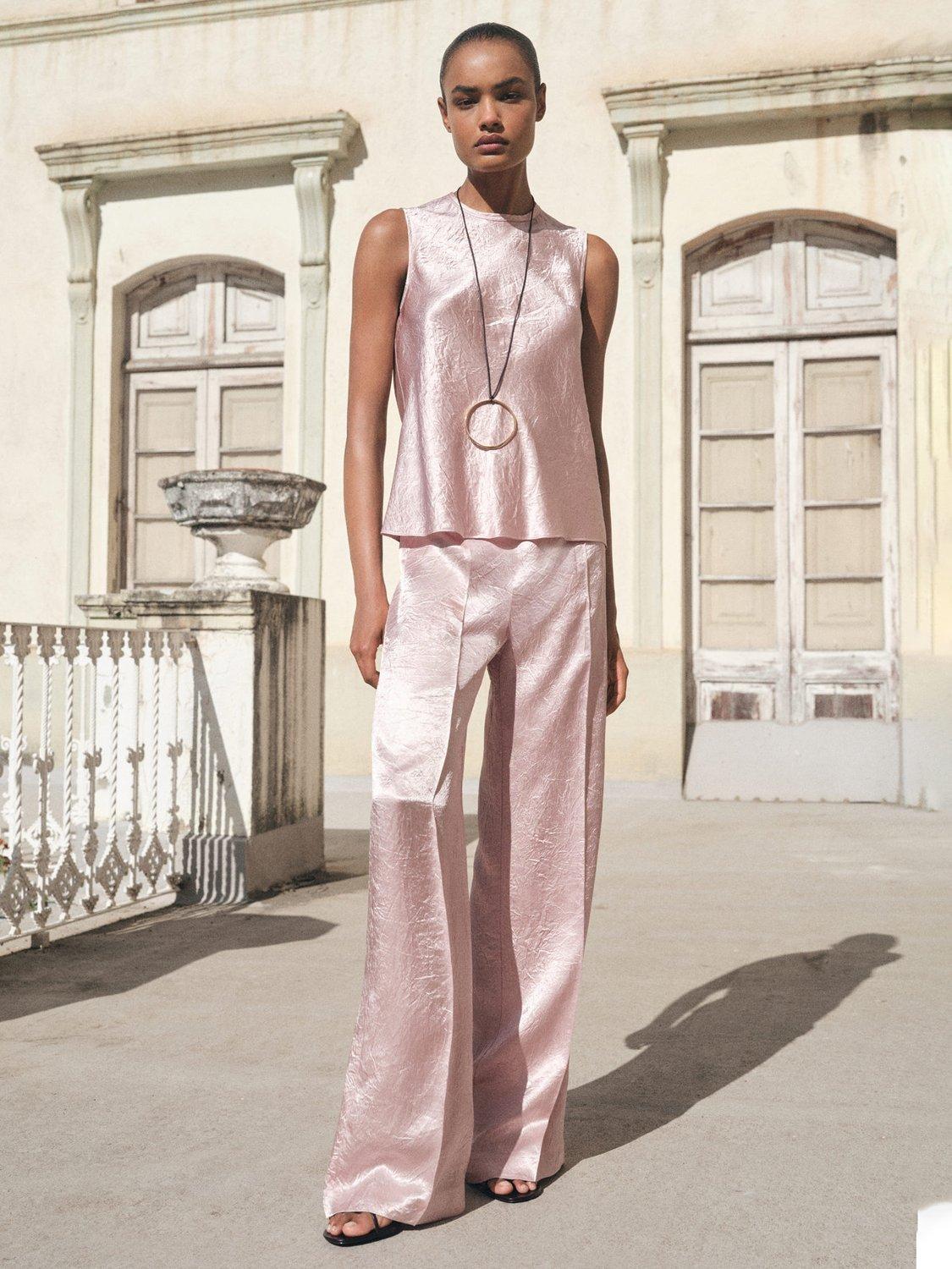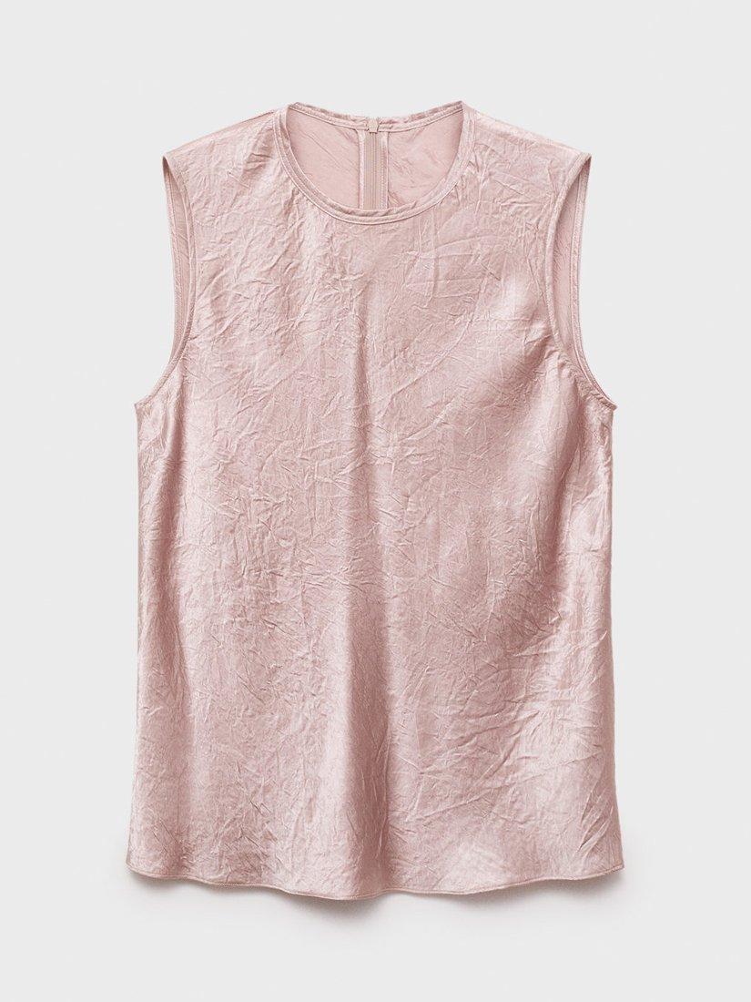 A crinkle-effect satin sleeveless blouse. Its soft round neck and clean design create endless styling possibilities, whether you are dressing for work or weekends.