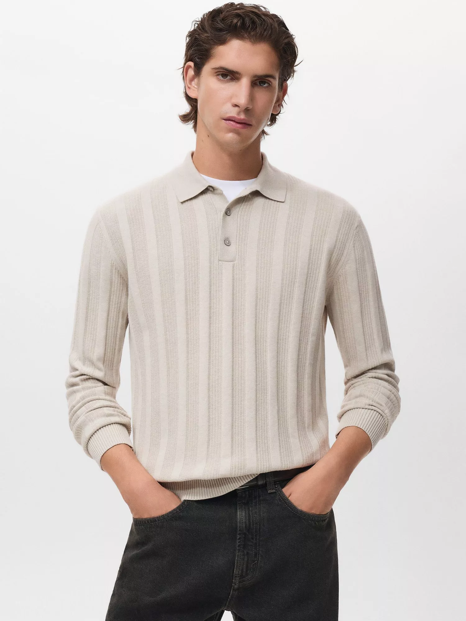 This long sleeve polo top combines comfort and flair for your day-to-day plans. Its clever ribbed stripe design adds a fresh edge to your routine, pairing effortlessly with jeans, chinos and joggers.