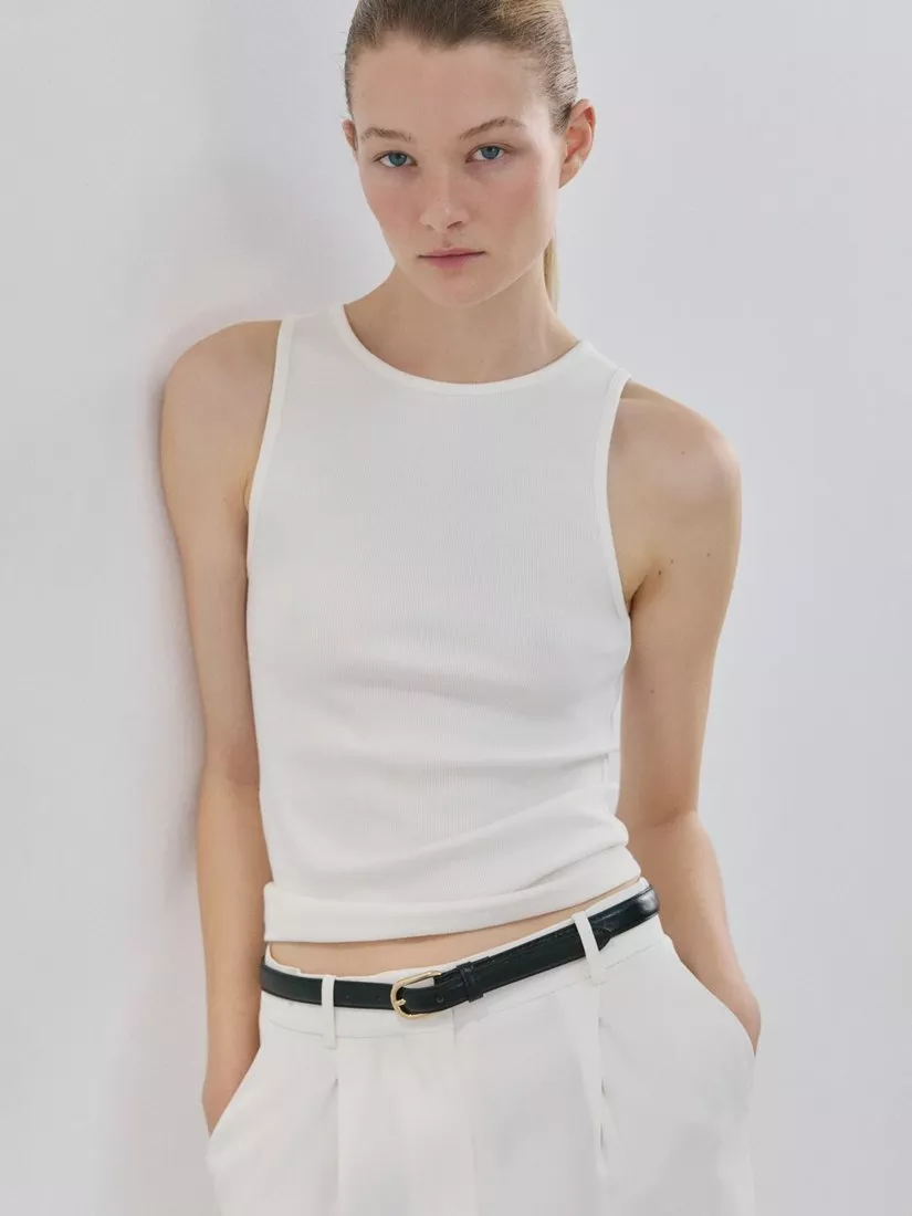 This sleeveless tank top features a neat crew neckline and a comfortable stretch fit, making it a versatile foundation for day-to-day layering or wearing solo during warmer months.