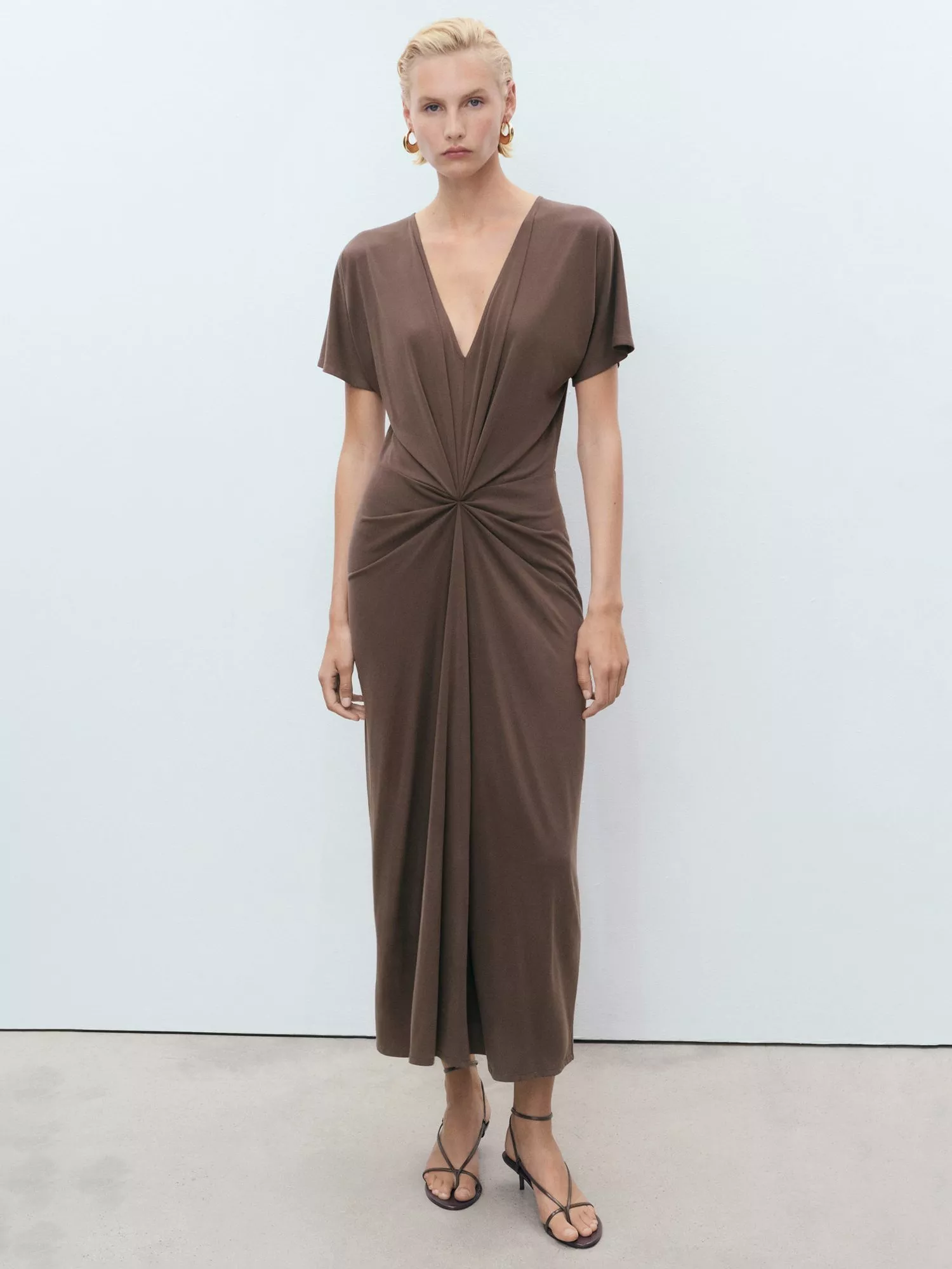 Built on movement, framed by folds, this short sleeve midi dress from Mango features a V-neckline and a twist waist detail for a stunning shape.