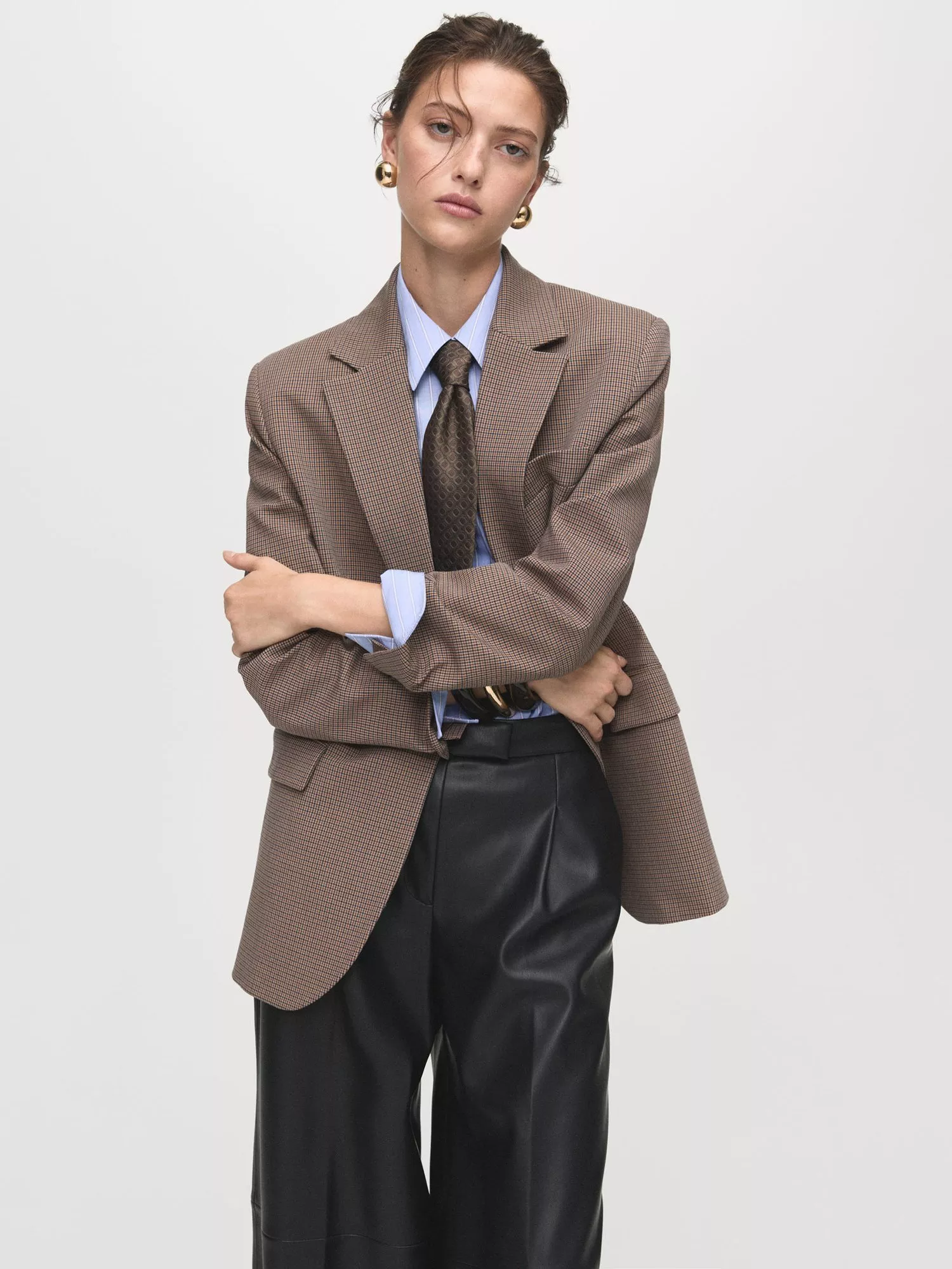 A pair of balanced straight leg trousers from Mango, made in faux leather. They are designed to sit mid rise with an elasticated waist and regular length hems.