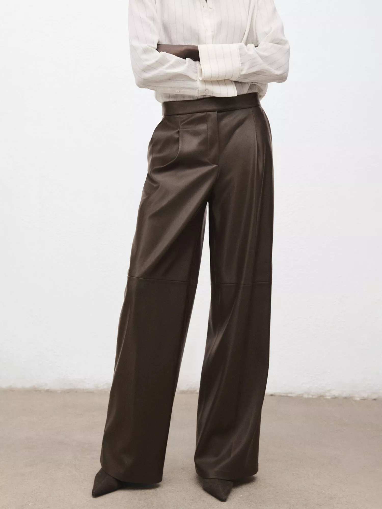 A pair of balanced straight leg trousers from Mango, made in faux leather. They are designed to sit mid rise with an elasticated waist and regular length hems.
