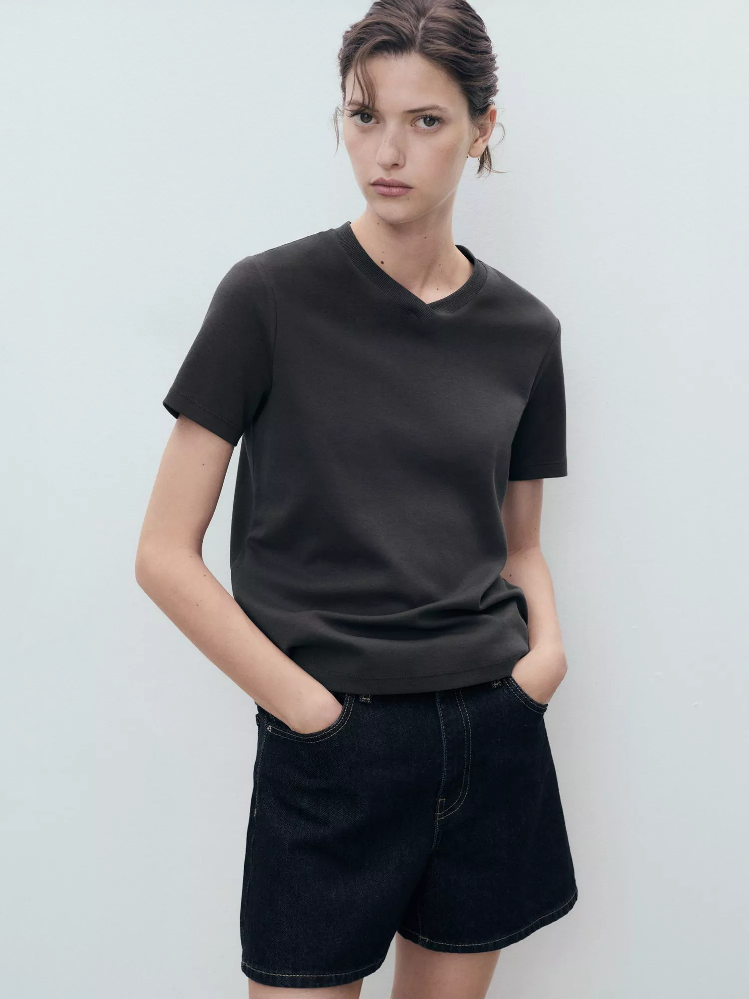 An everyday jersey top by Mango, made from soft and breathable cotton. With a V-neck and short sleeves, it comes in an easily styled plain colouring. One you'll reach for again and again.