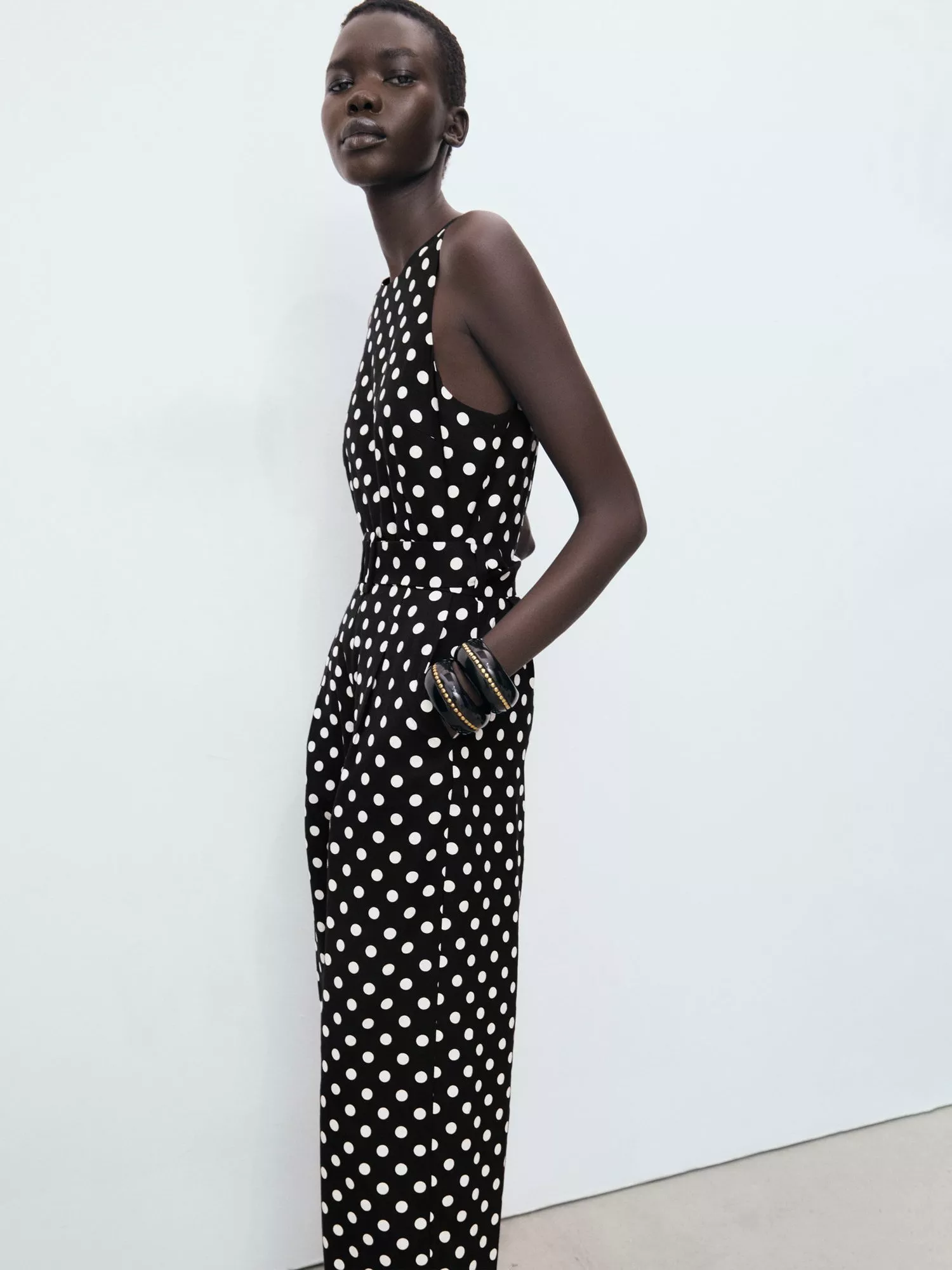 Cleanly cut with a round neck, this sleeveless playsuit from Mango comes in a breathable linen blend. Decked with lively polka dots.
