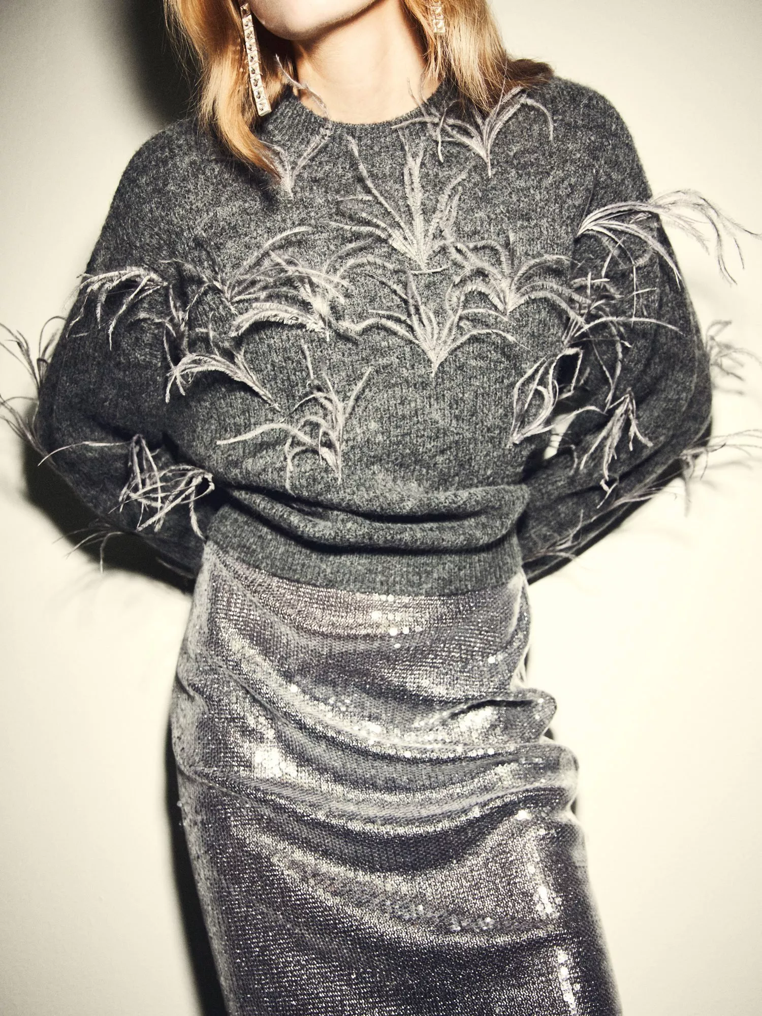 This round neck jumper adds a twist to your day, thanks to its feather trim and medium weight knit.