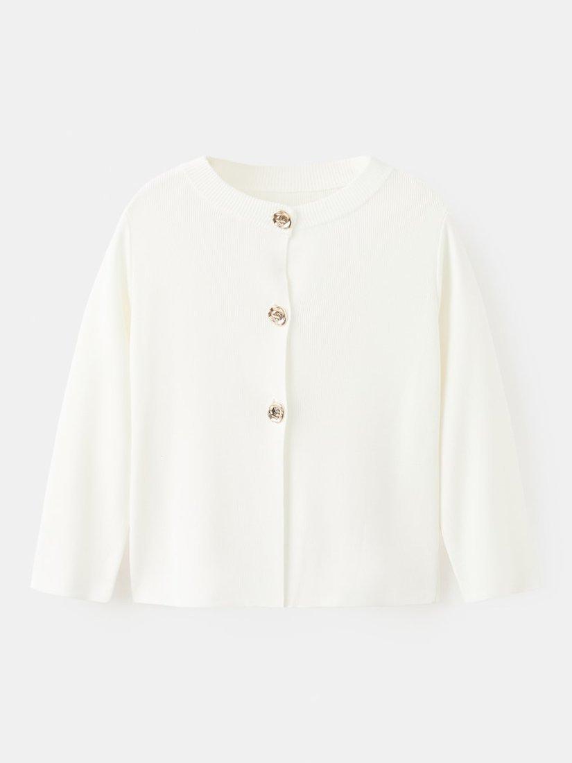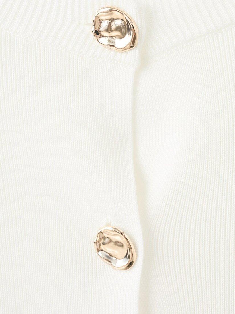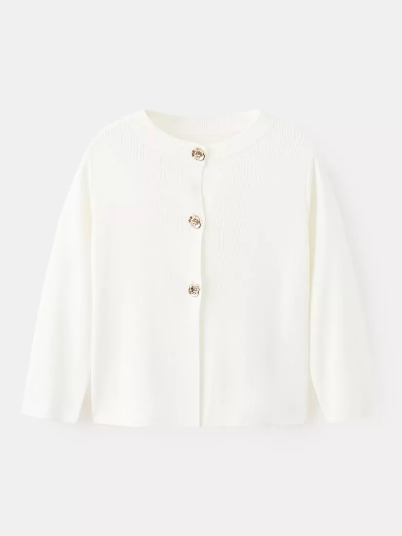Sleek cardigan with jewel buttons, fluid drape, and a clean round neckline. Soft sculptural silhouette for sophisticated evening gatherings or chic day to night styling.