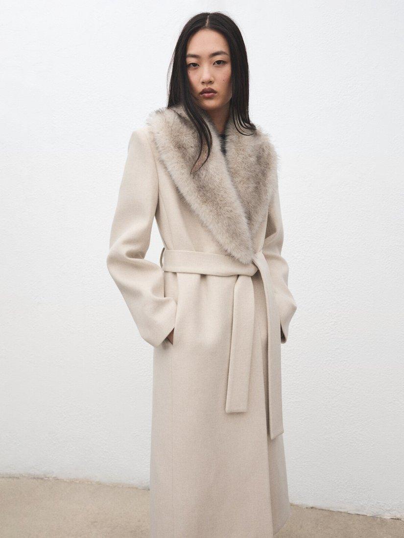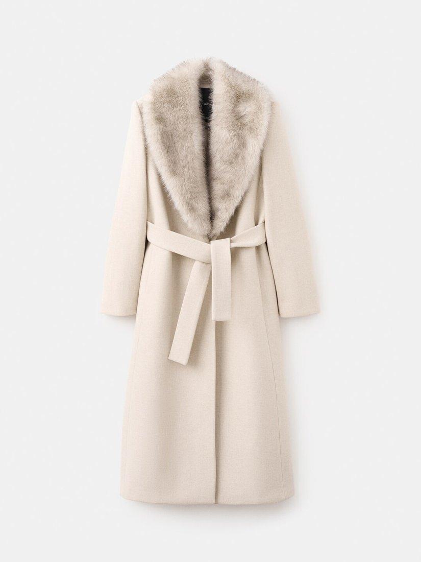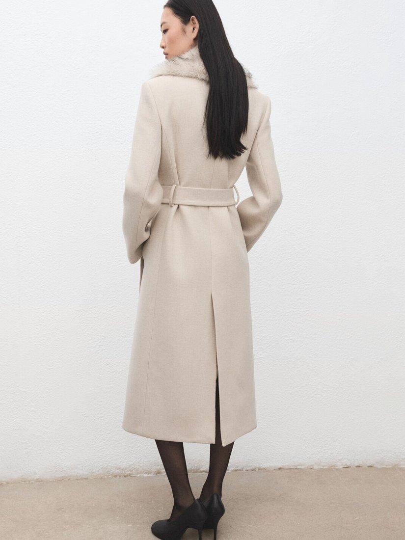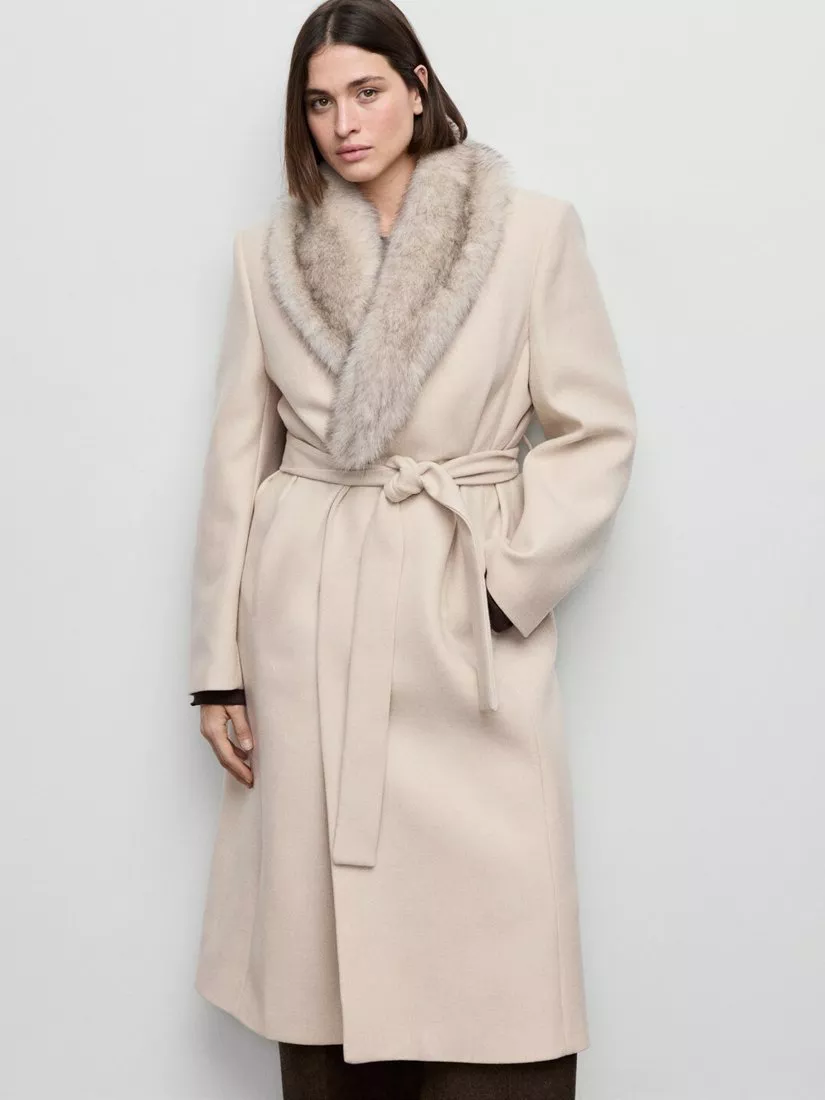An elegant wrap coat that sculpts the silhouette, featuring a plush shawl collar and fluid drape for city-to-evening sophistication.