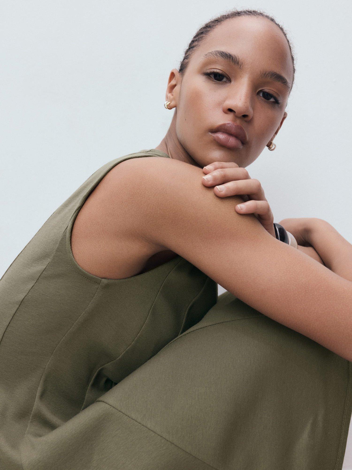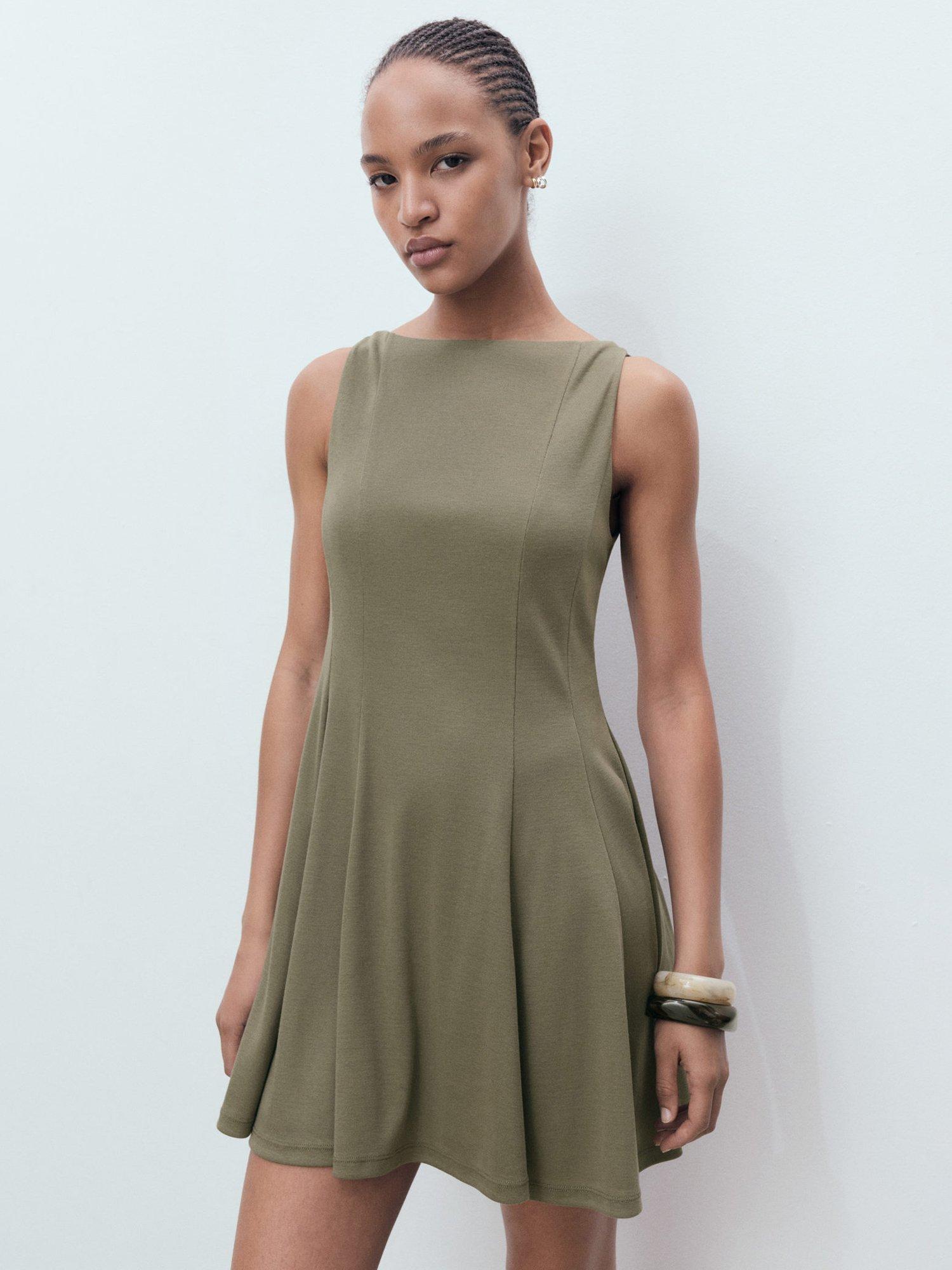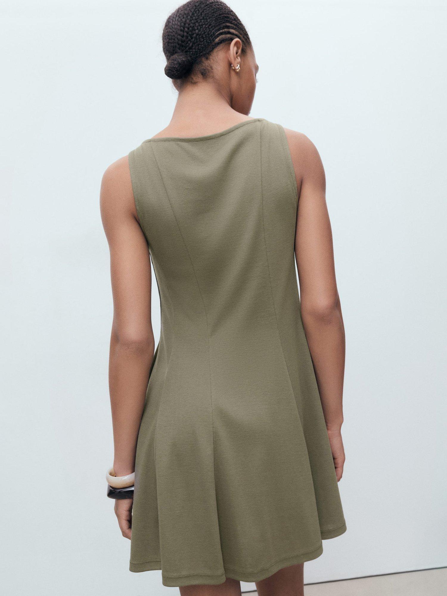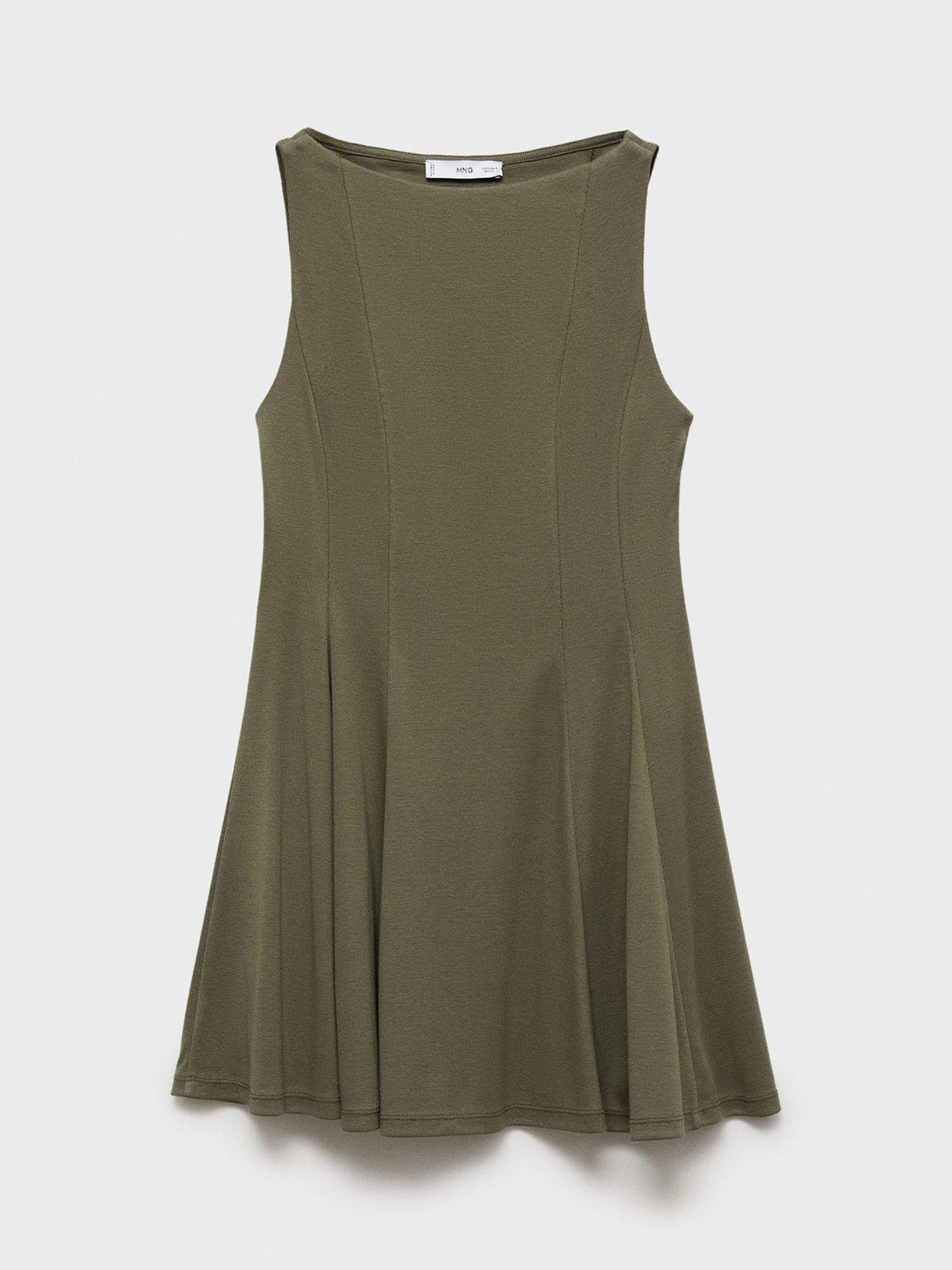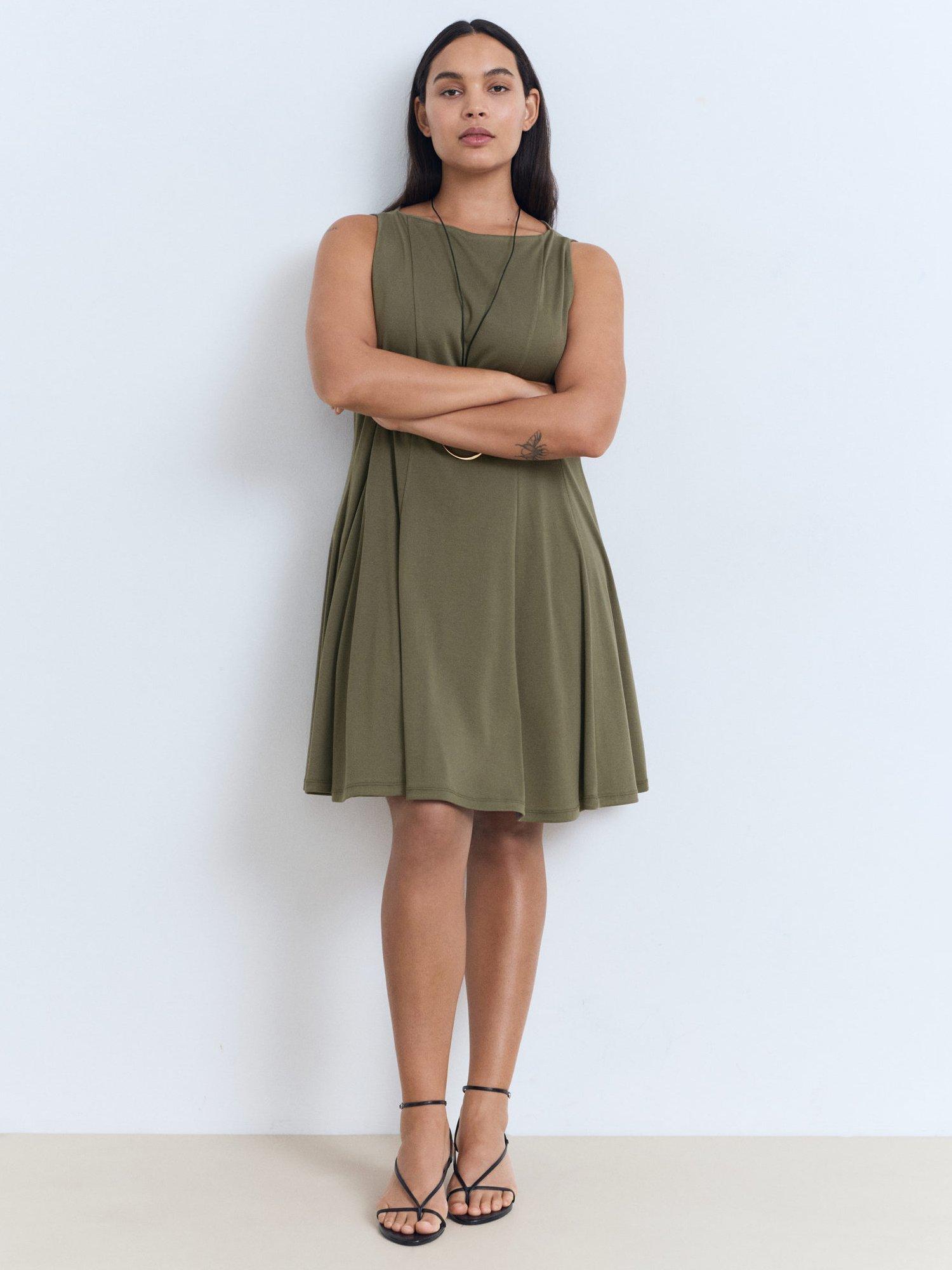 This sleeveless mini dress features a pleated flared silhouette and boat neckline, offering comfort and freedom for your day's adventures. Its cotton blend feels soft while the swing shape keeps you moving easily wherever the occasion takes you.