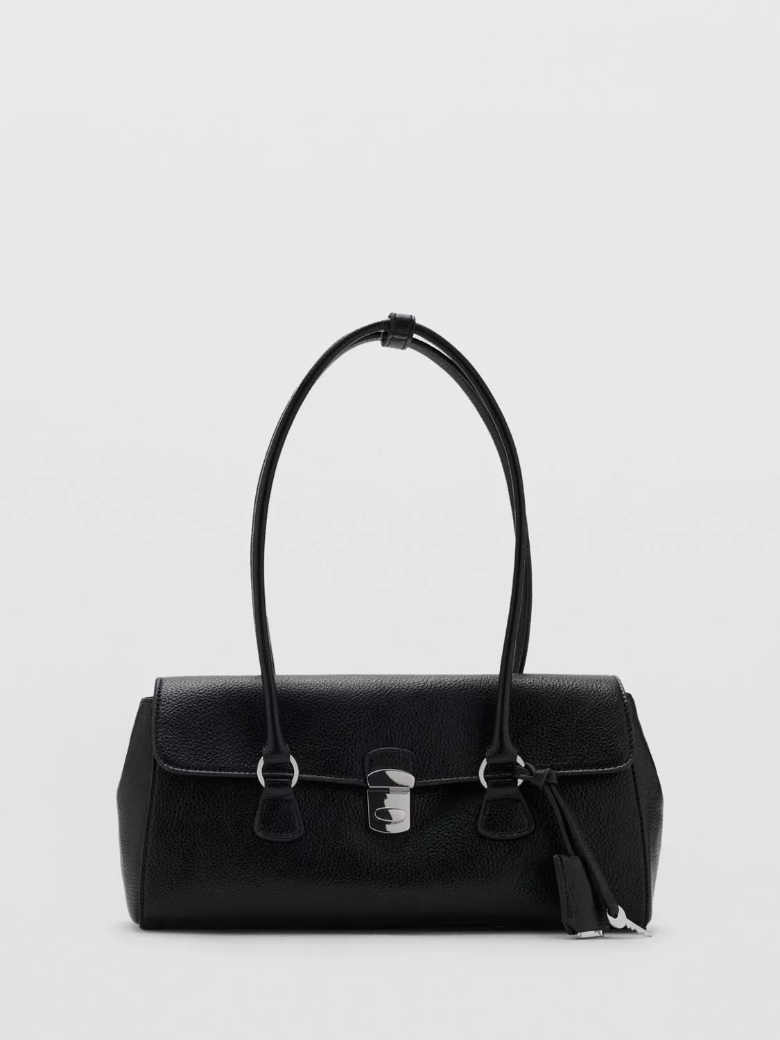 Faux leather bowling bag with flapover top and metal clip fastening.
