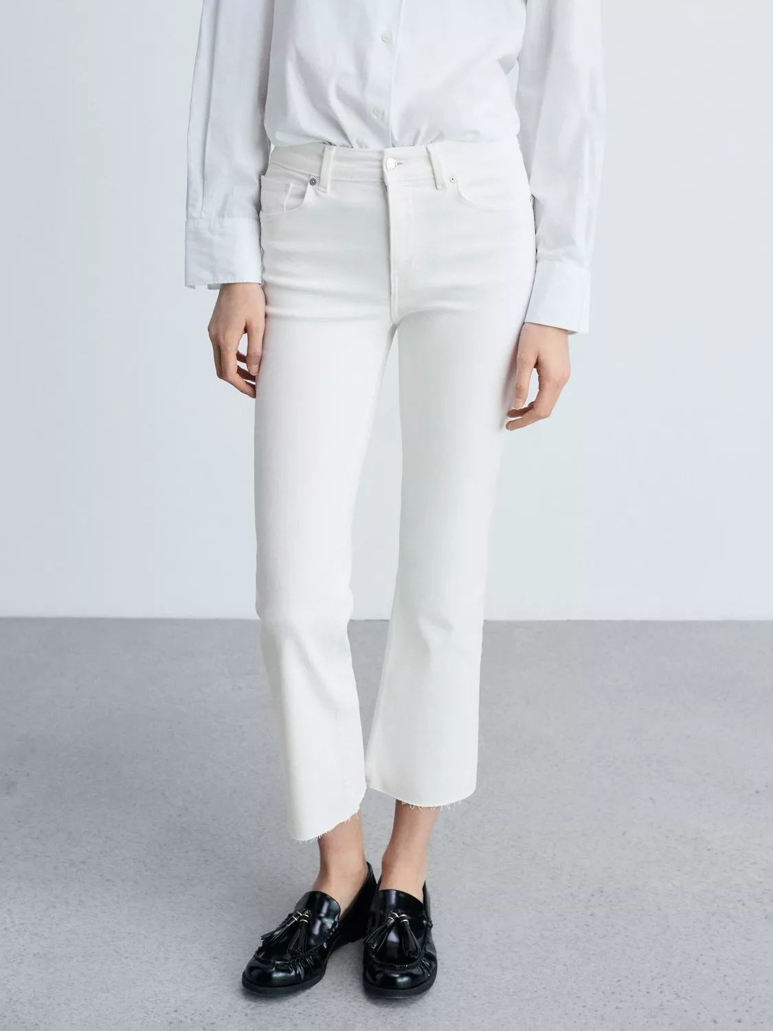 Hugging the hips and thighs before falling to flared hems, these mid rise jeans by Mango are blended with natural cotton for breathability and are cropped for a fresh look.