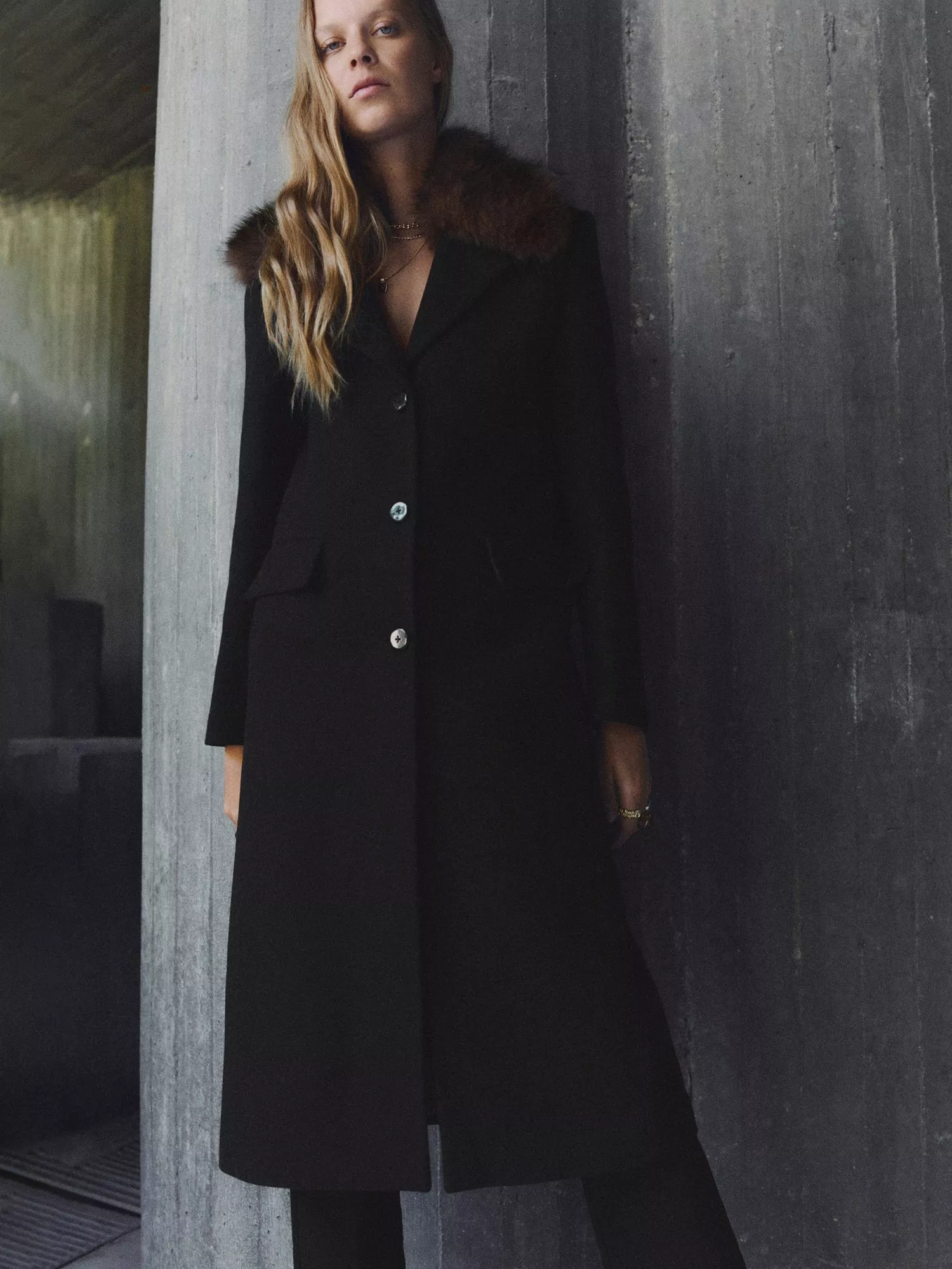 This single-breasted, longline overcoat keeps you warm on winter days without the need for aesthetic compromise. Rendered from a wool-blend fabric and detailed with a faux fur collar, it adds a polished touch to daily plans.