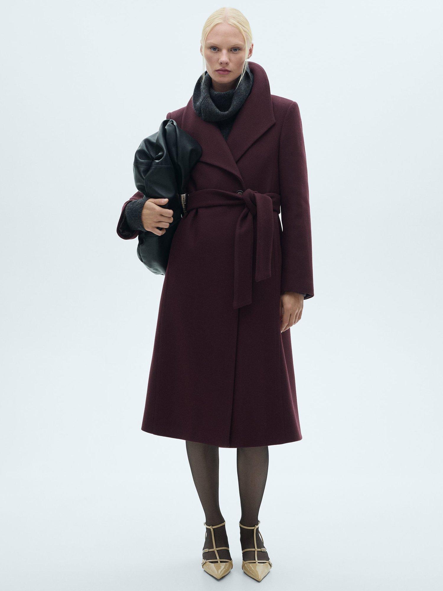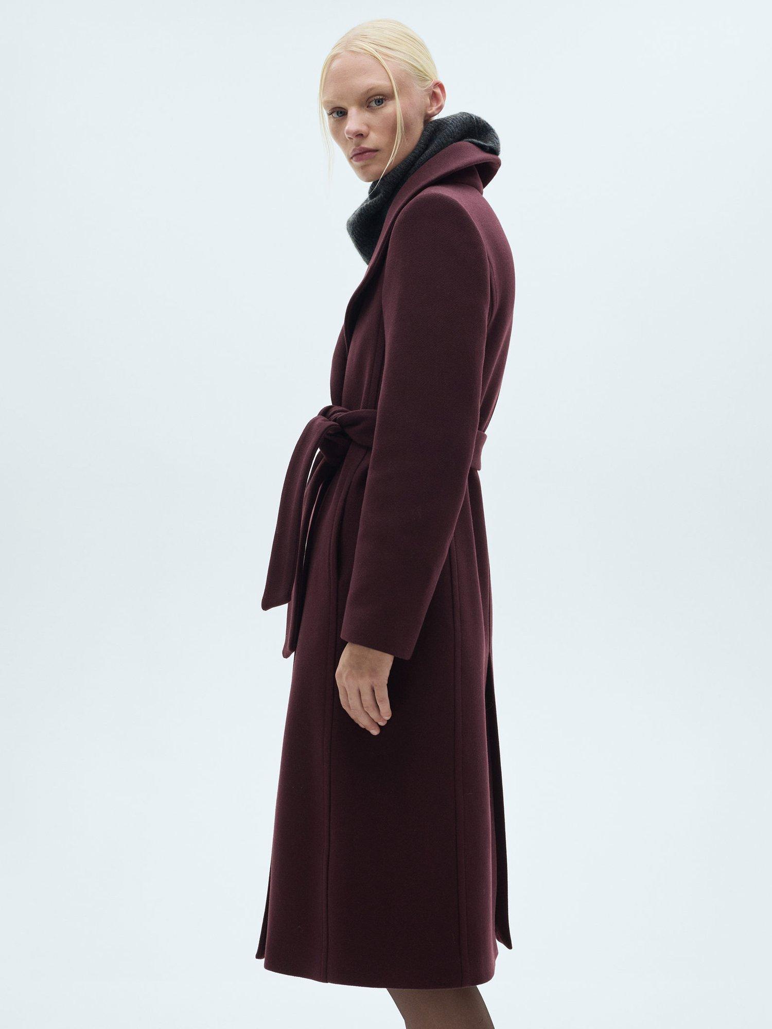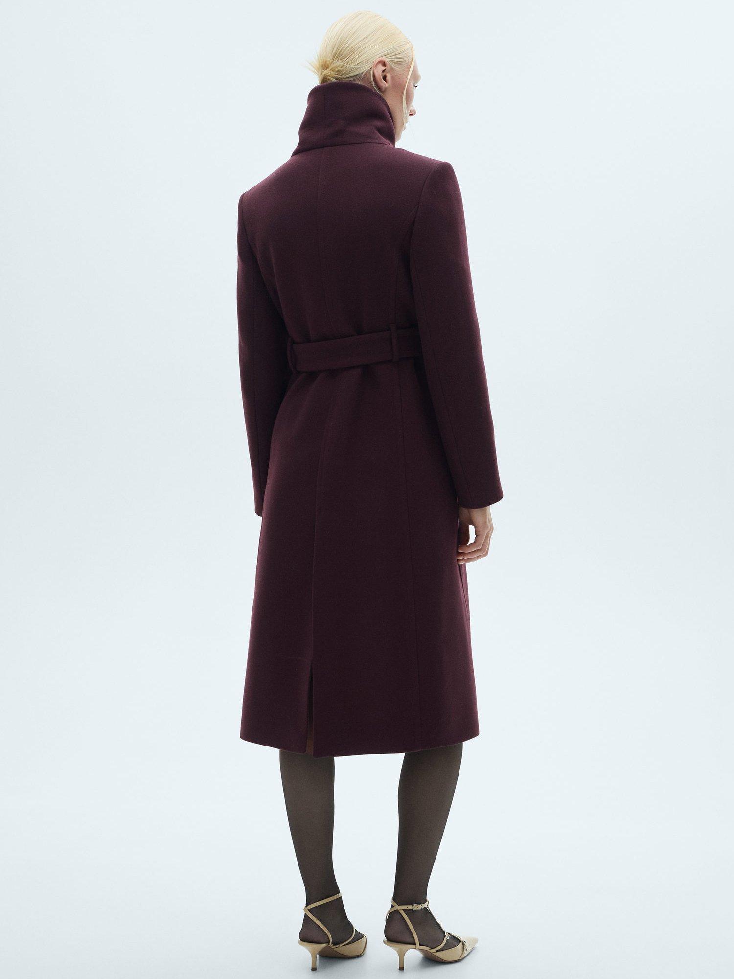 Framed with a refined funnel neckline and a belted waist detail, it is made from a luxury wool blend.