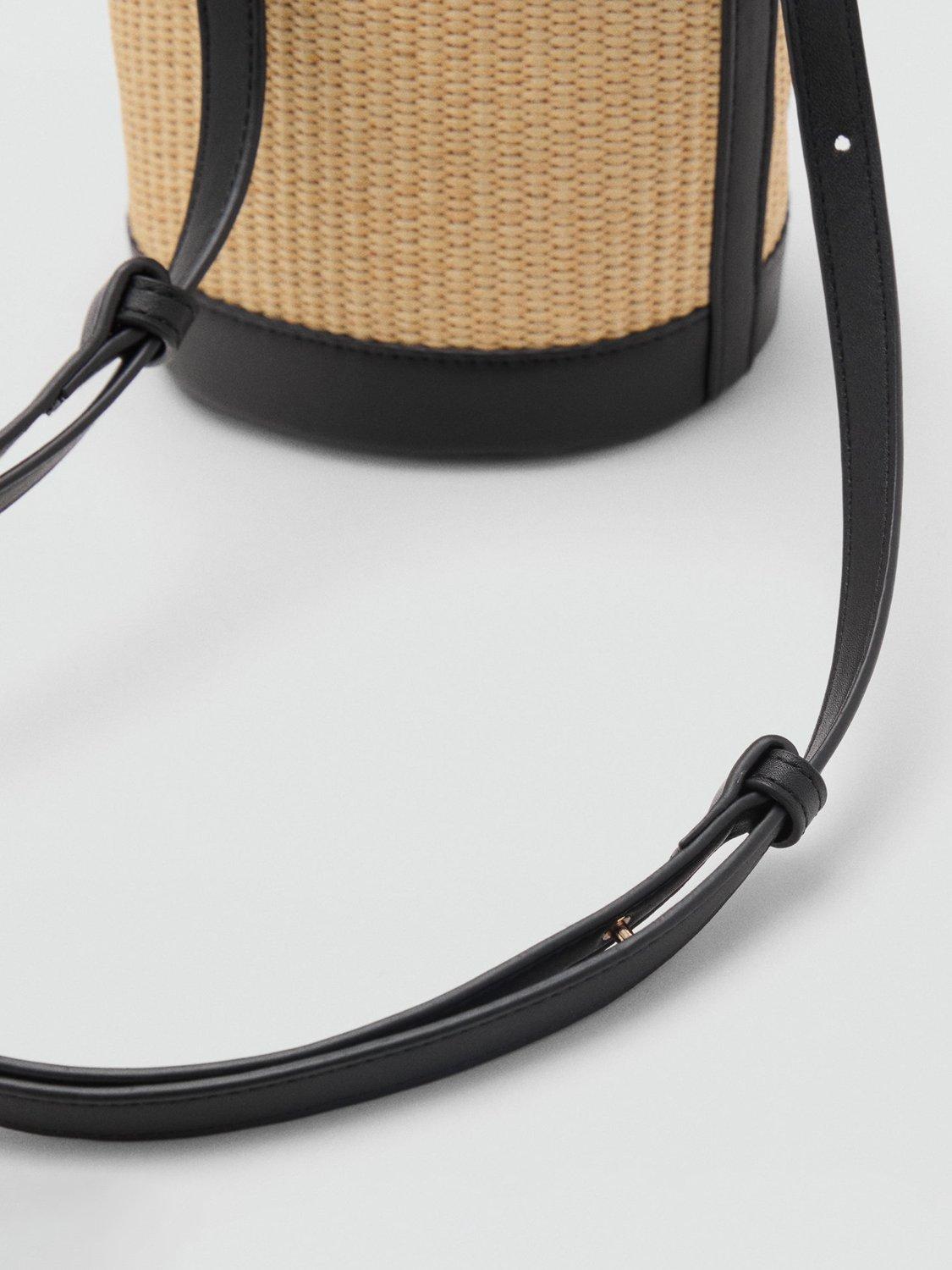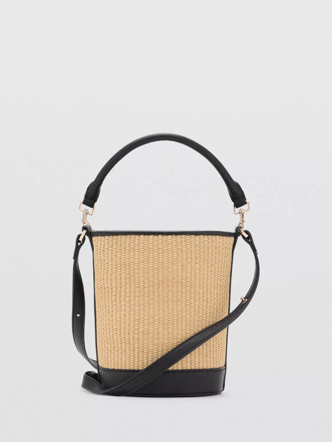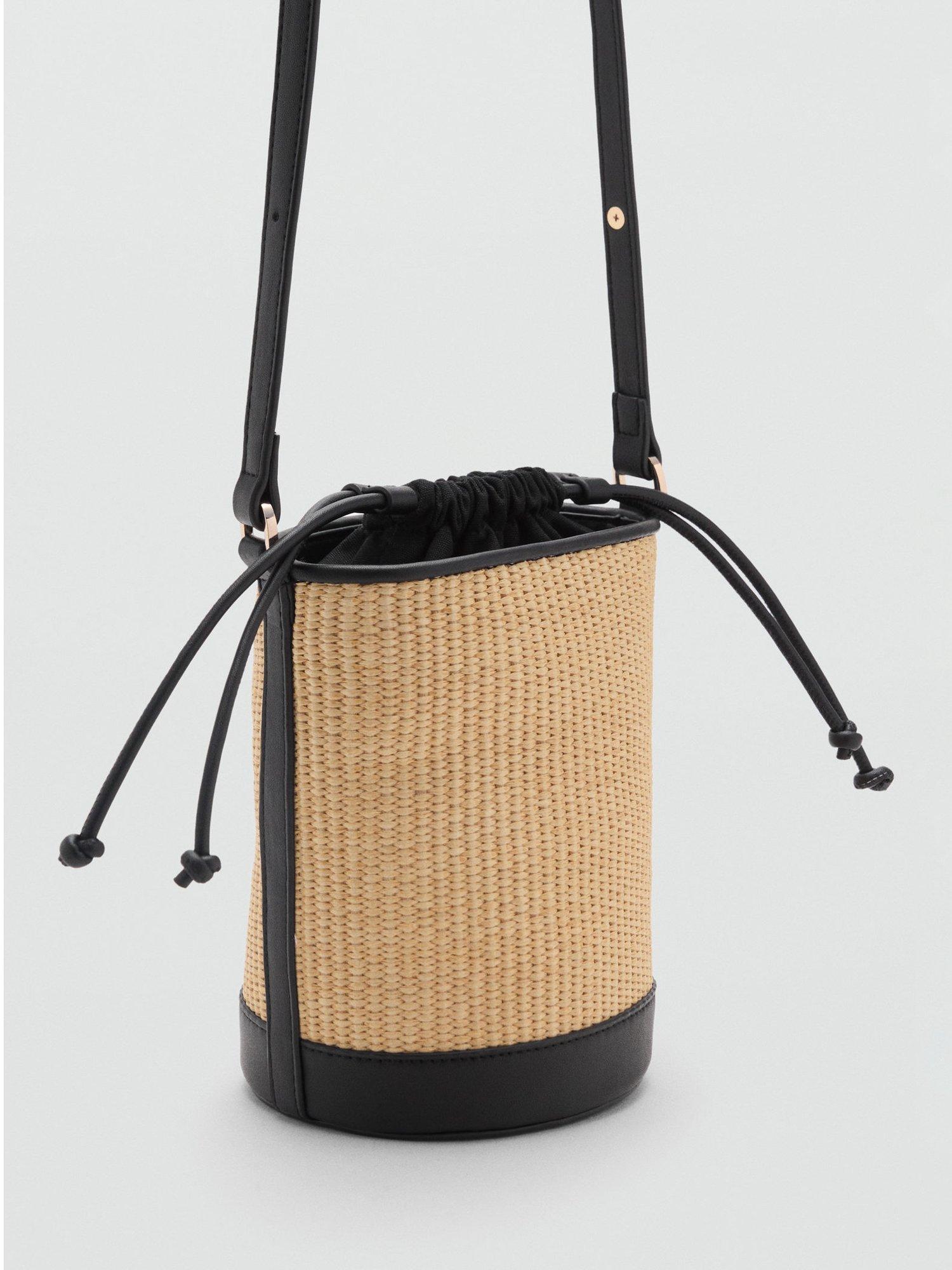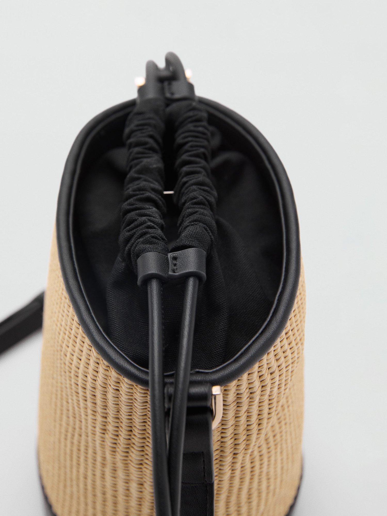 Small raffia-effect fabric bucket bag with a long adjustable strap. An inner fabric bag with a drawstring closure keeps essentials together. Finished with contrasting faux-leather trim and gold-toned hardware.
