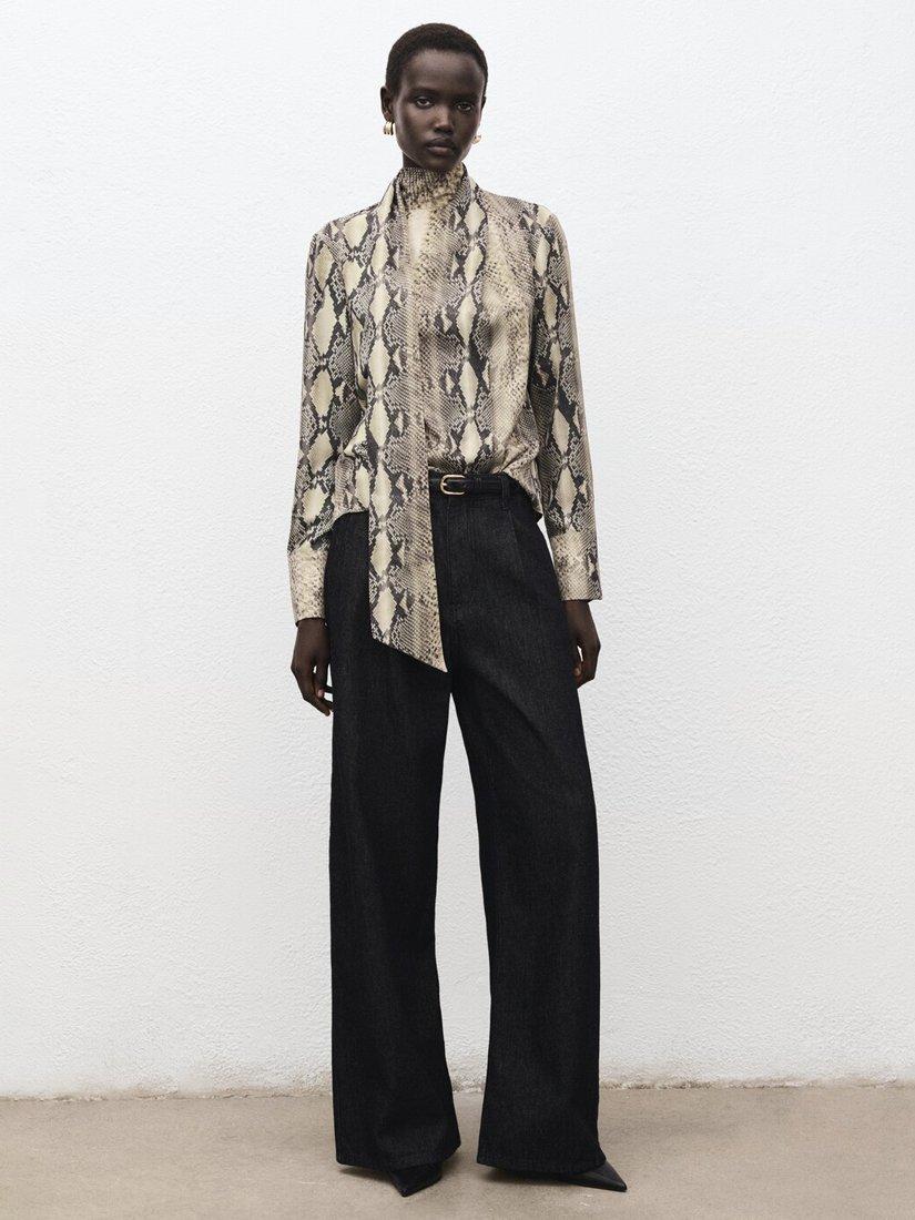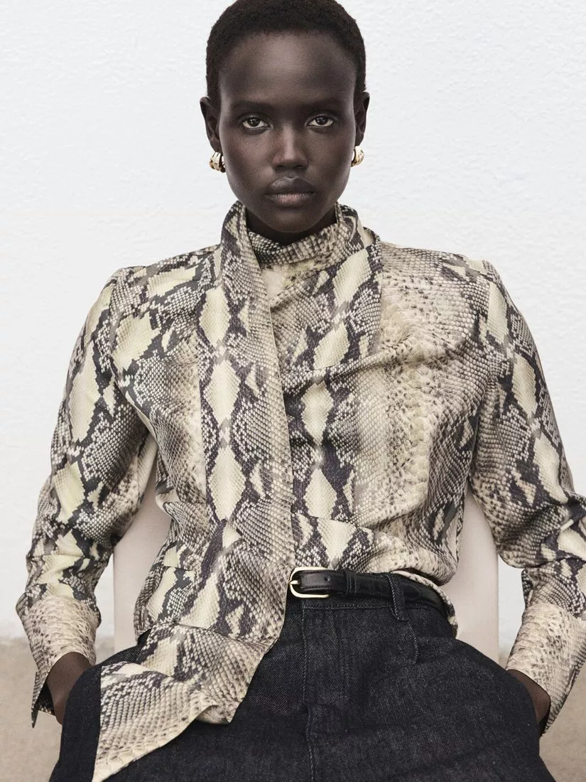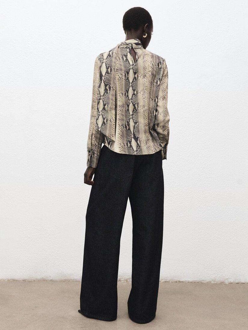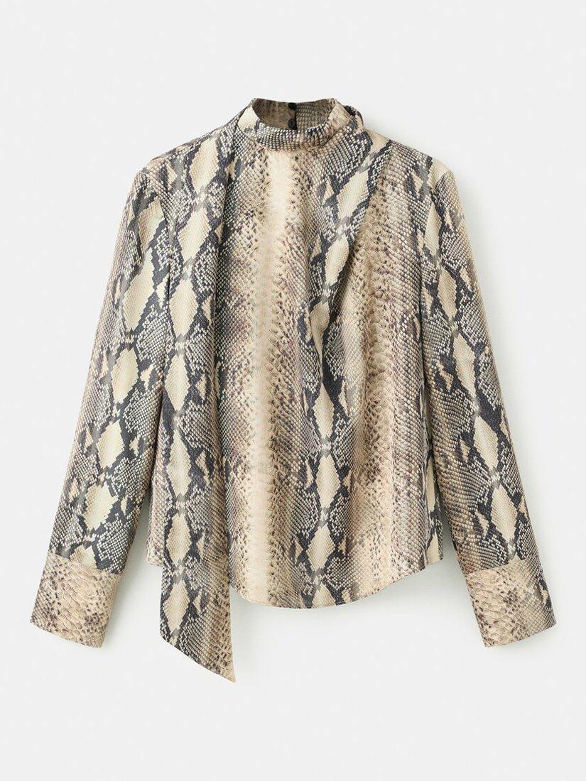 A tie-neck blouse by Mango, designed with comfortable long sleeves in vibrant snake print. A wear-everywhere essential.