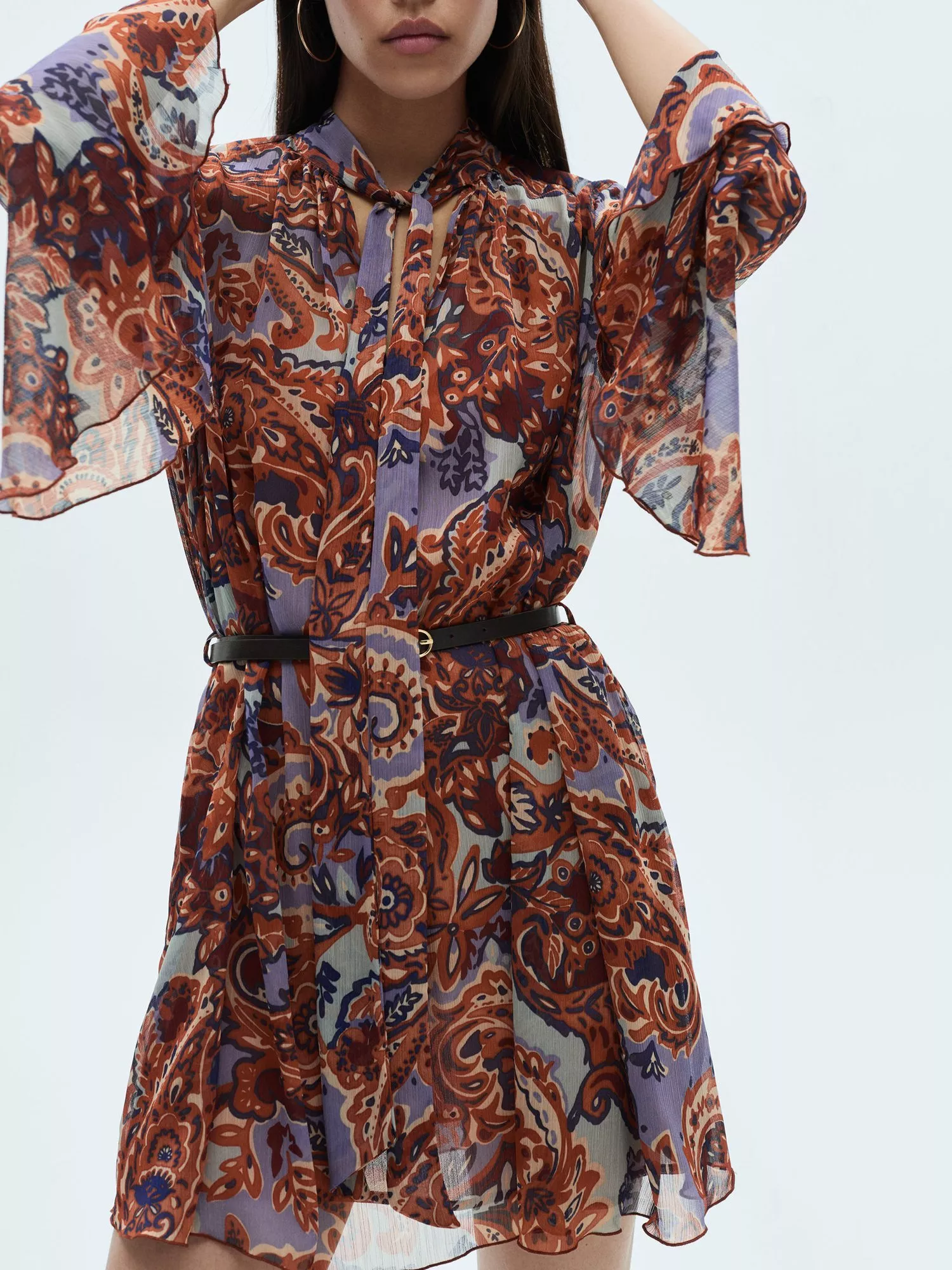 Effortlessly flattering thanks to the fit and flare cut, this thigh-grazing dress from Mango is made from a lightweight fabric. With a tie neckline and full-length ruffled sleeves, this style has signature swirls splashed across its canvas.