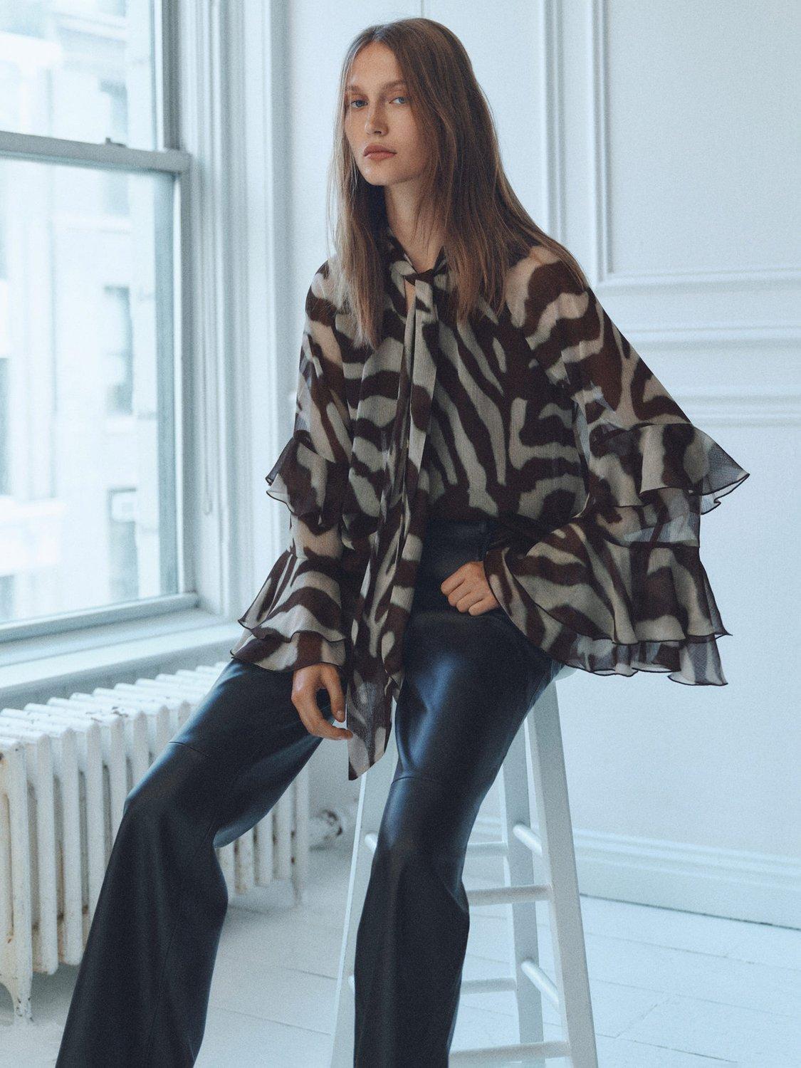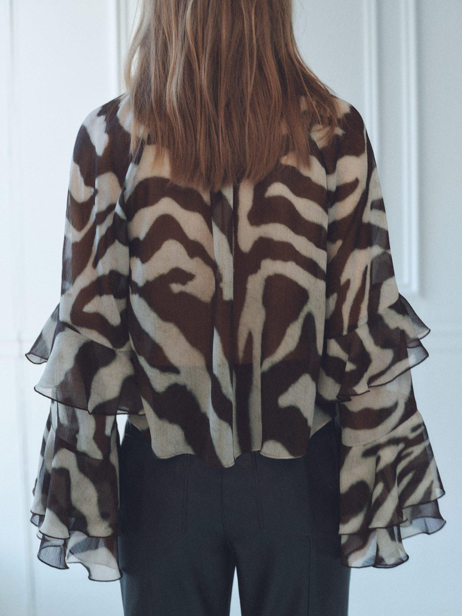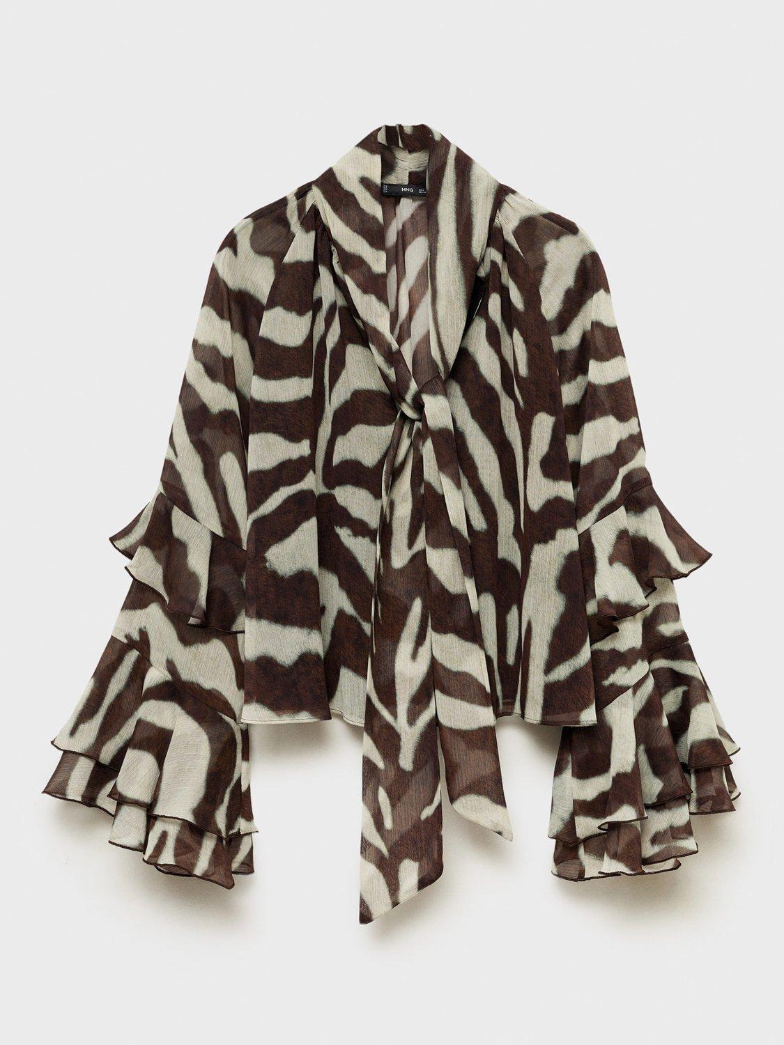 Detailed with ruffles, this tie neck blouse from Mango features an all-over animal print and long sleeves.