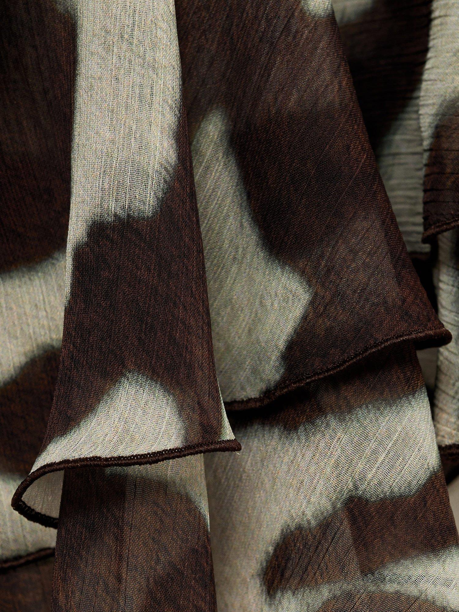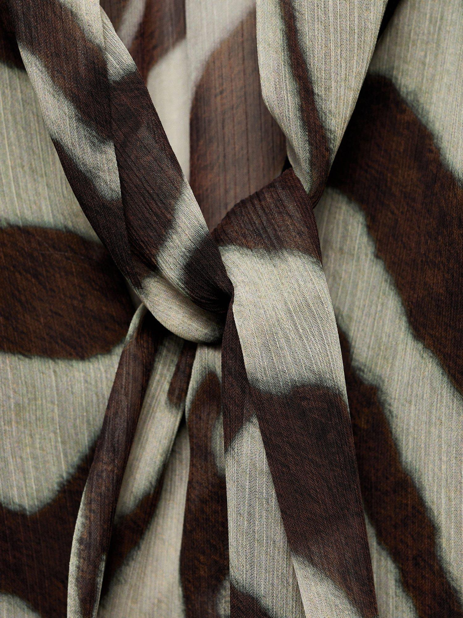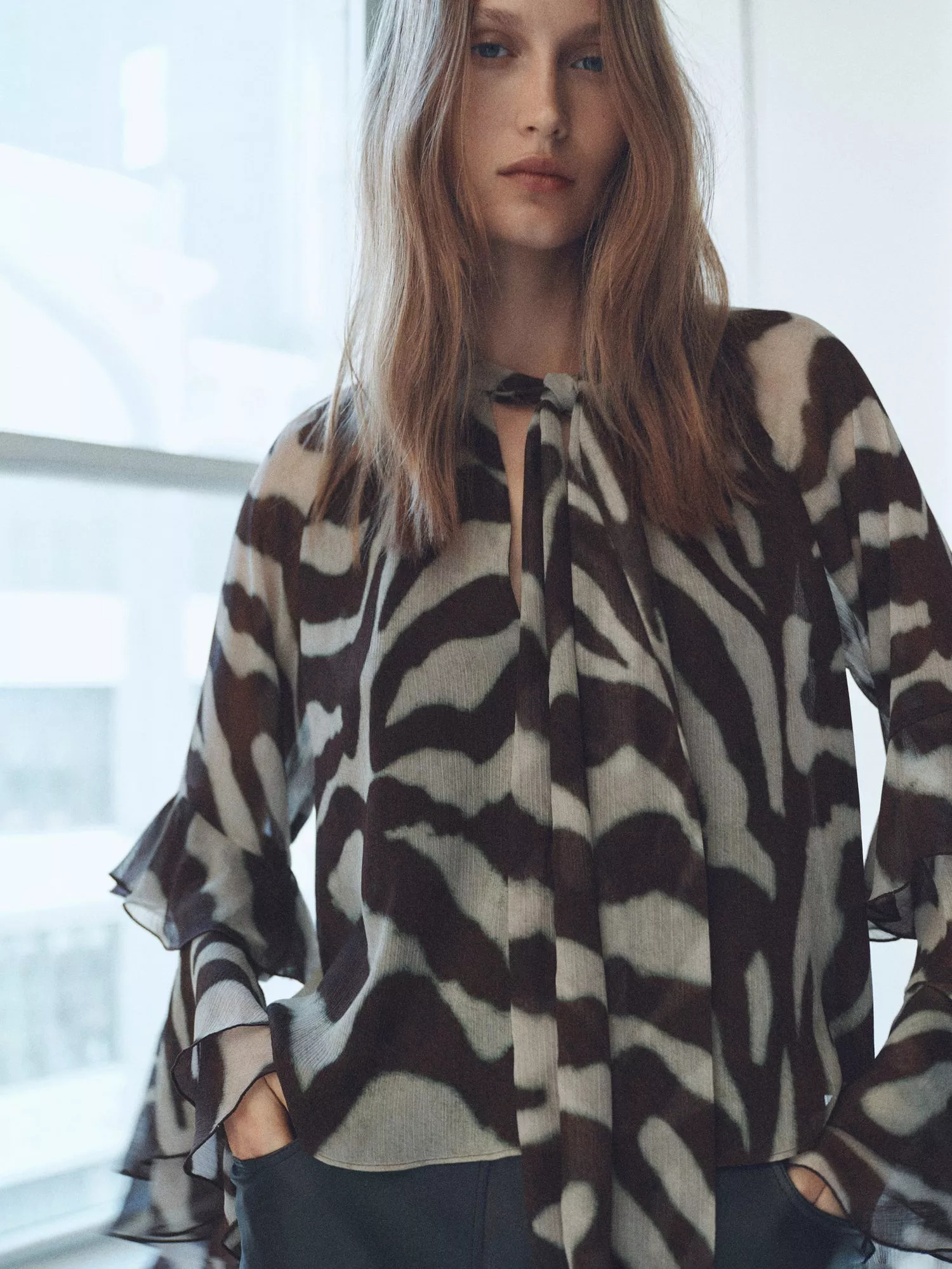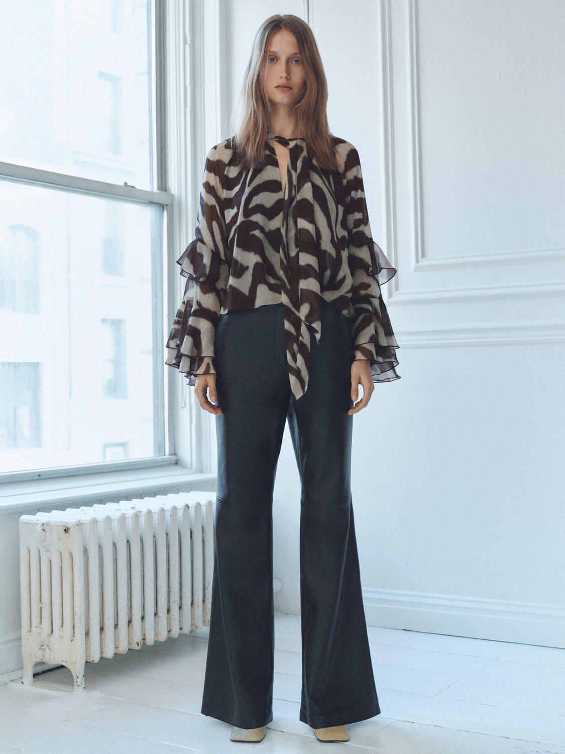 Detailed with ruffles, this tie neck blouse from Mango features an all-over animal print and long sleeves.