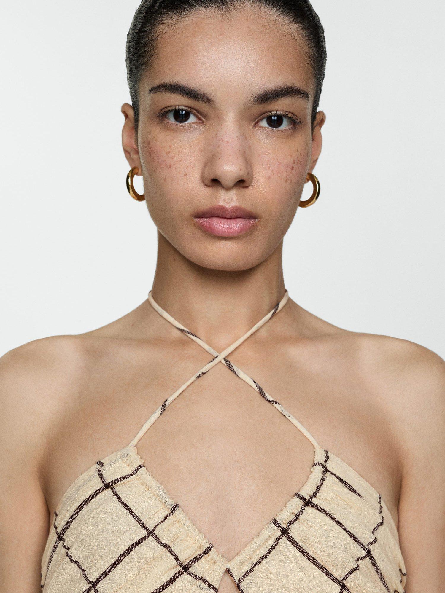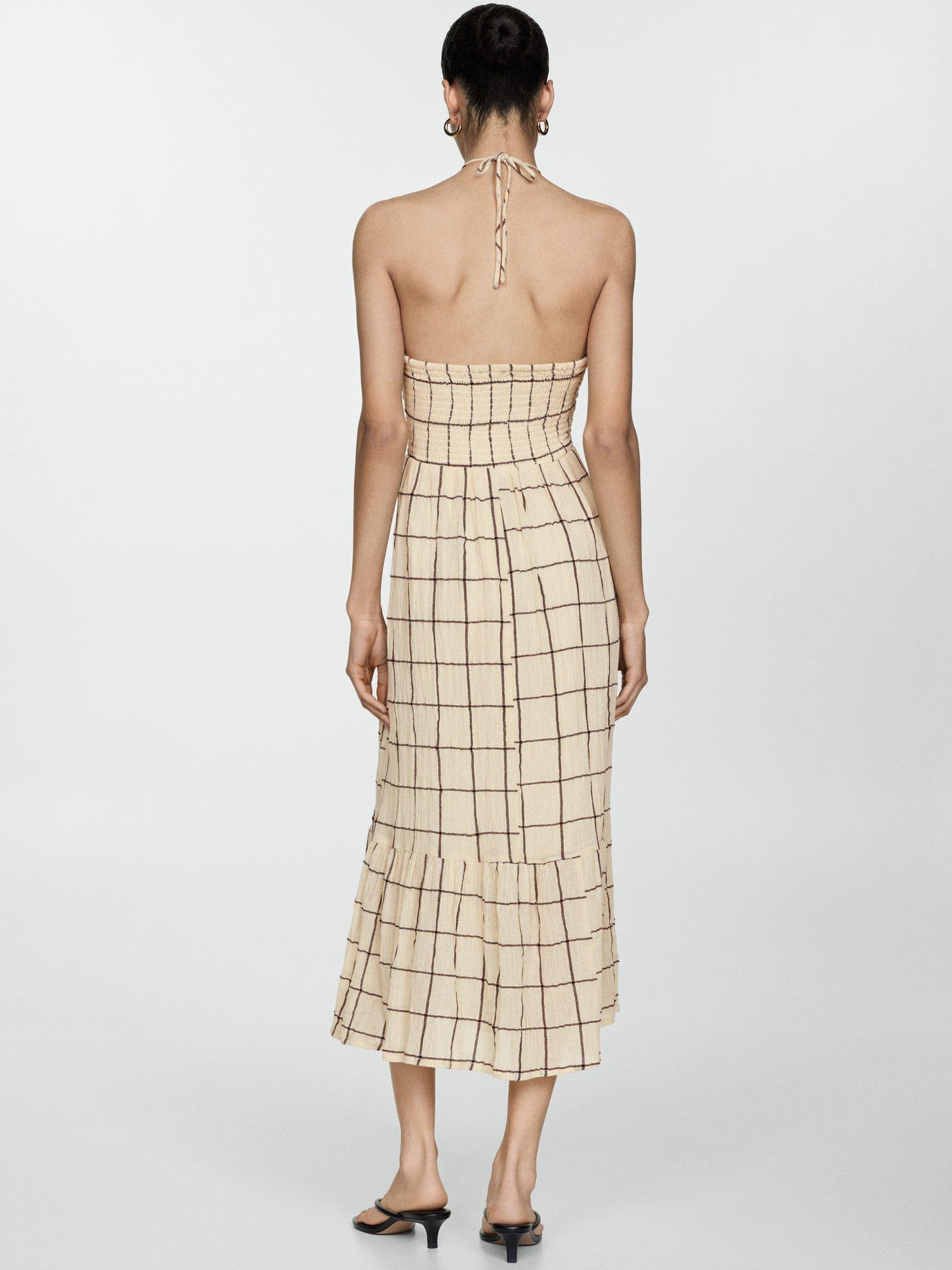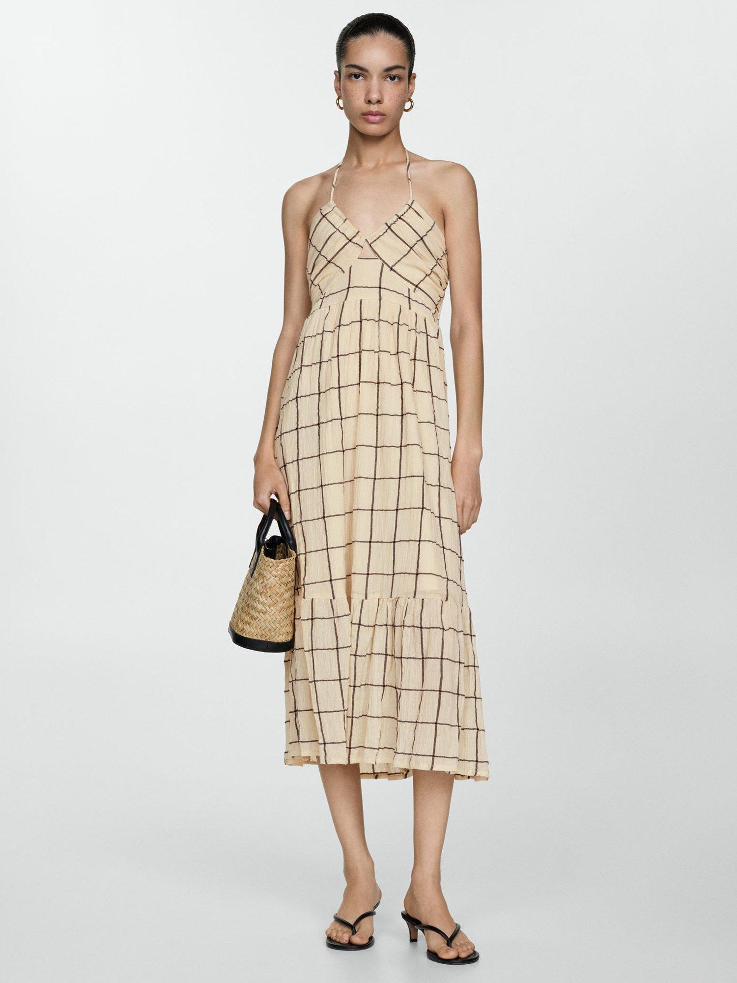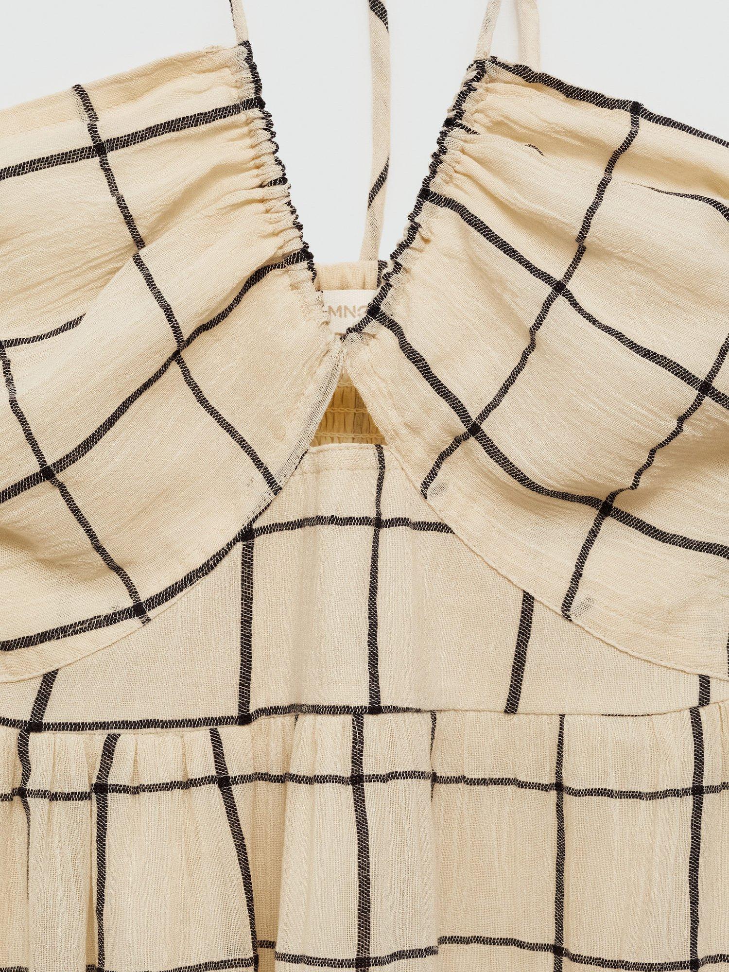 MangoSquare Check Strappy Dress, Light Beige