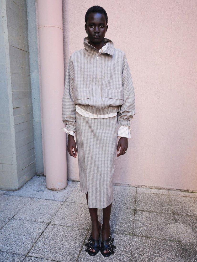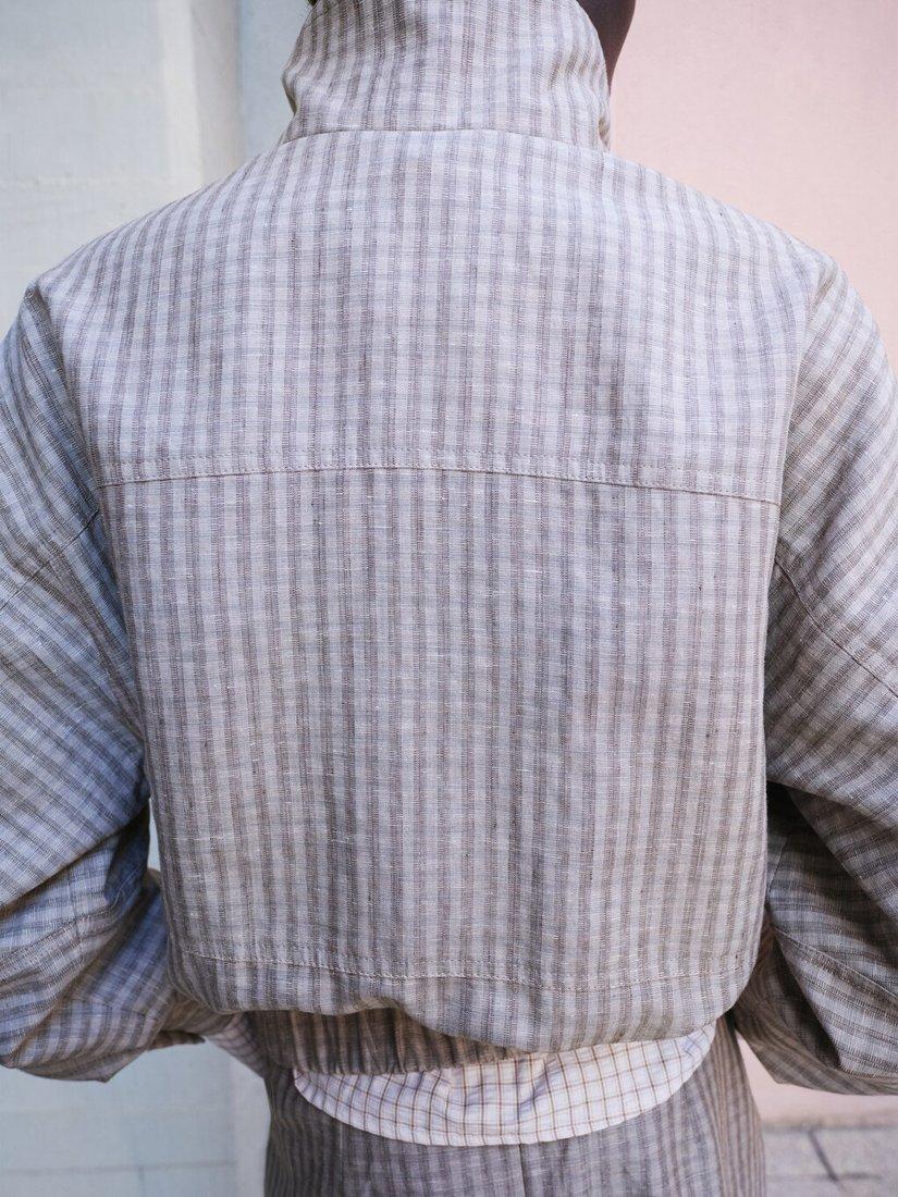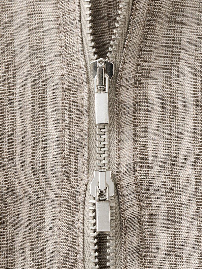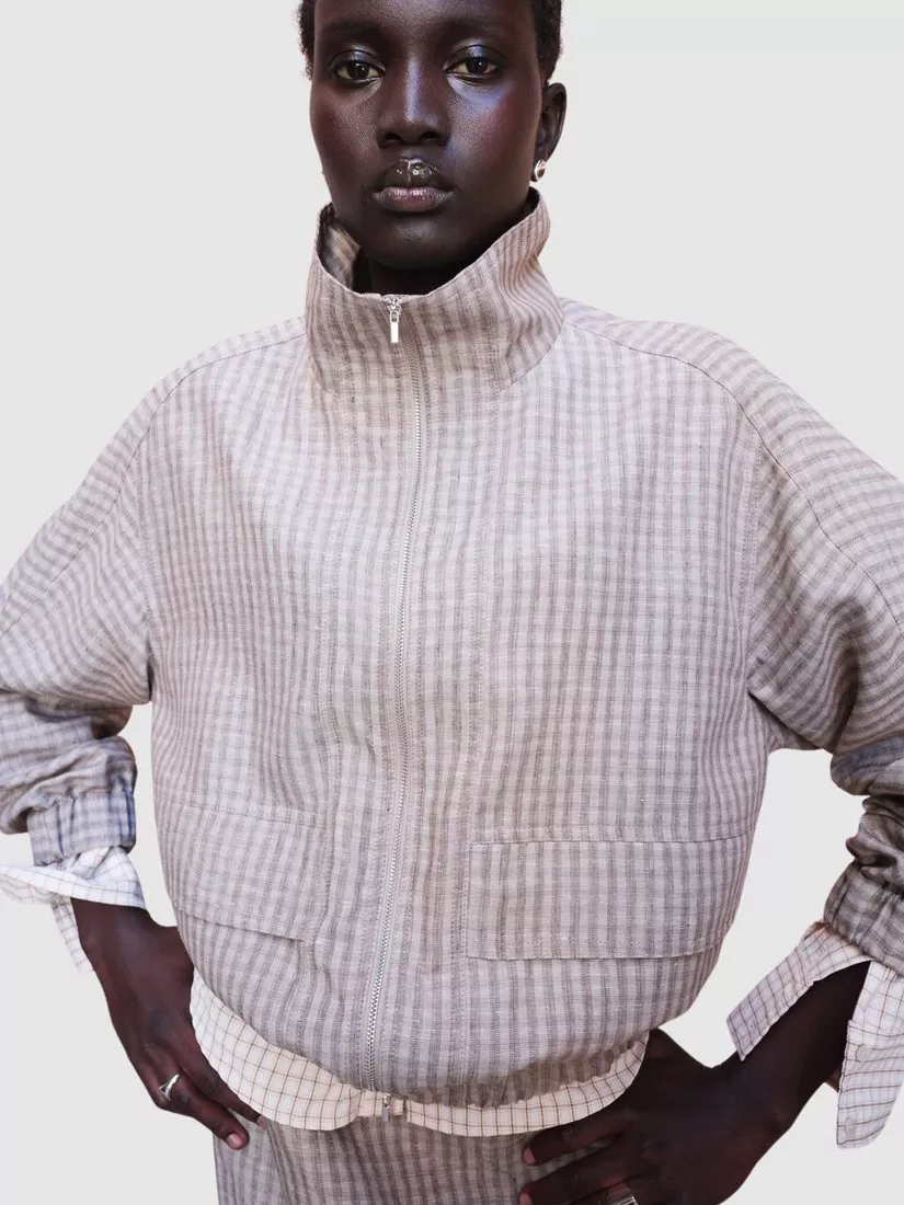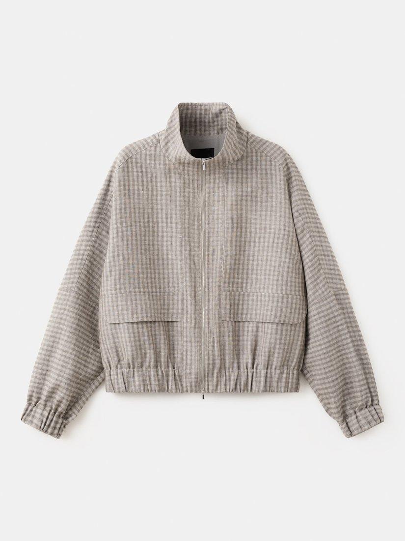 A structured zip bomber jacket cut to a regular fit, crafted from a breathable linen blend with a subtle check pattern and soft linen for lighter layering across shifting spring days.