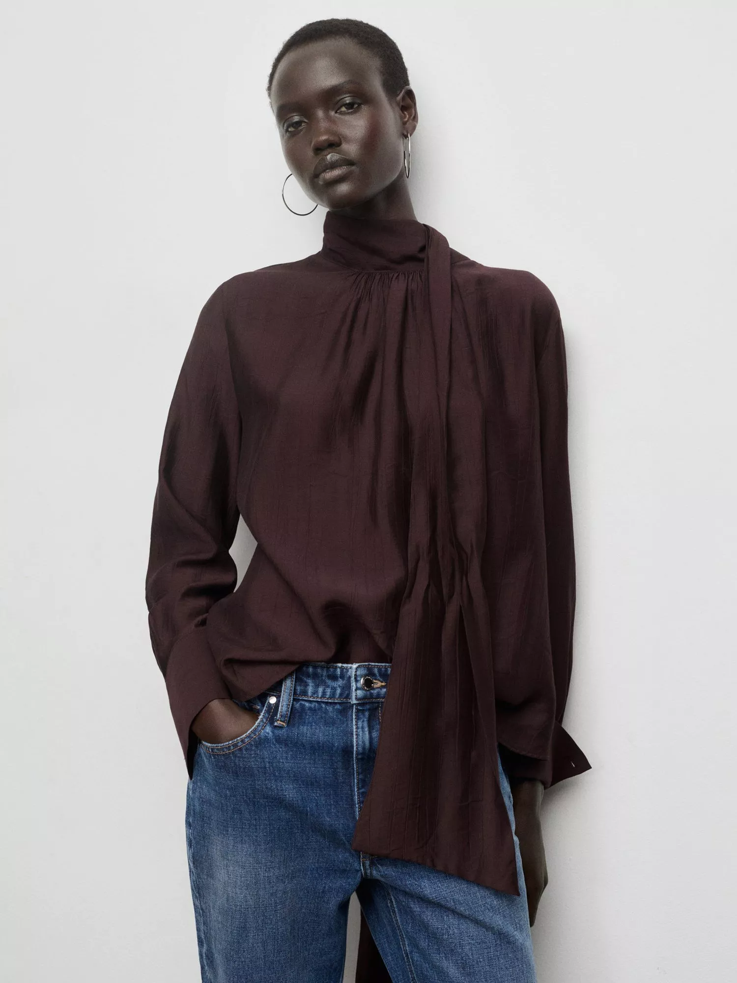 A scarf detail blouse by Mango, made from a soft viscose blend. With a tie neck and long sleeves, it comes in a versatile, plain design. Perfectly polished for daily wear.