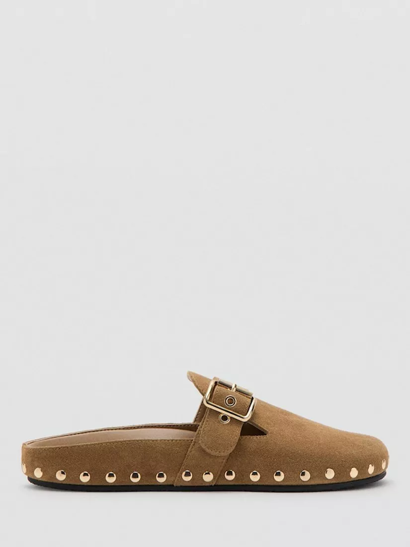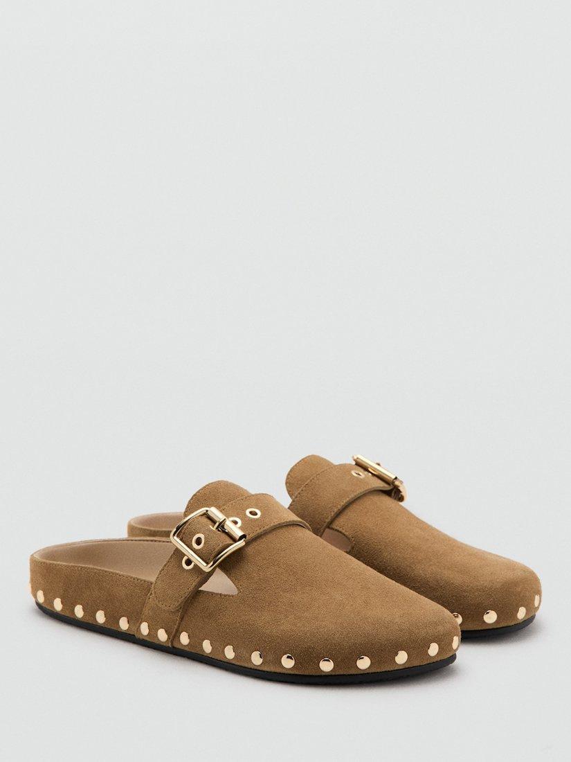 Suede leather mules by Mango with polished stud detailing. Sitting on a flat heel, they are shaped with a comfortable, round, closed toe. Decorative buckle. No Fastening.