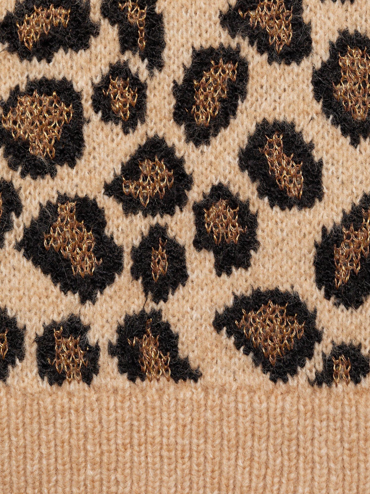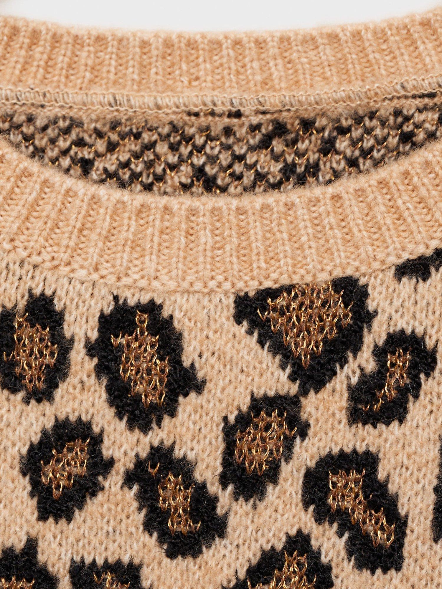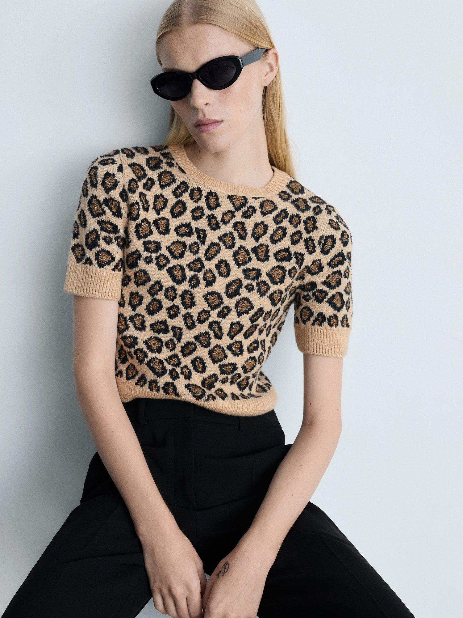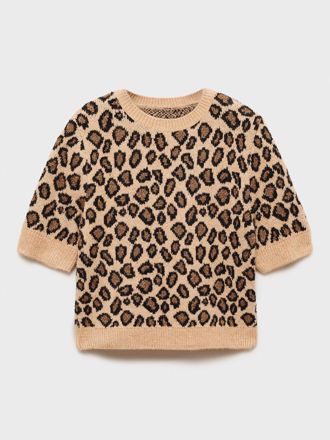 Simple and sweet with its round neckline and short sleeves, this light knit jumper by Mango draws the eye with its leopard print.