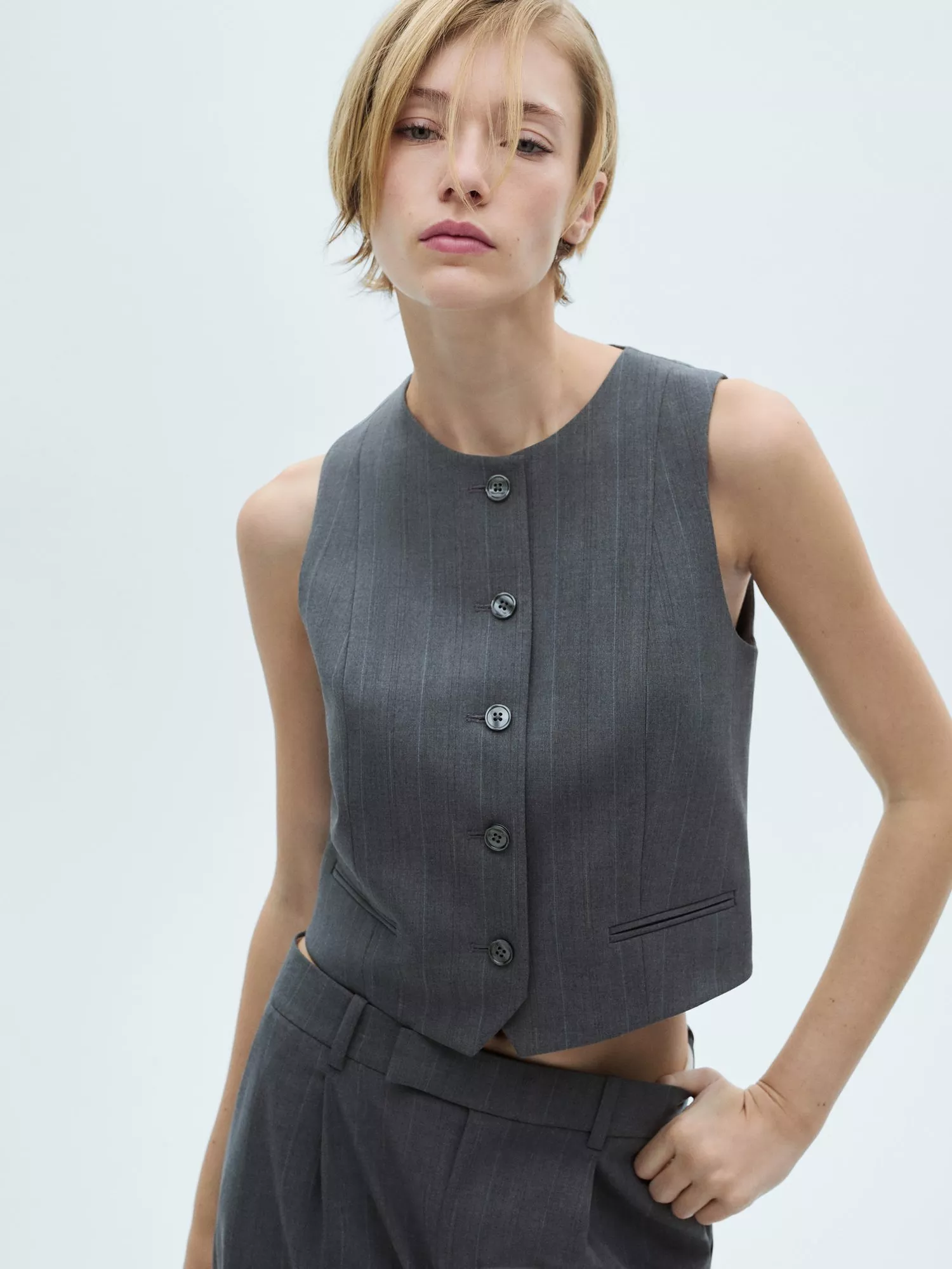 In pinstripes, this v-neck waistcoat by Mango is the ideal way to smarten your looks. Wear alone or over classic shirting.
