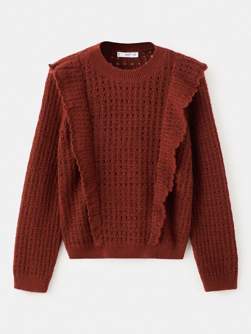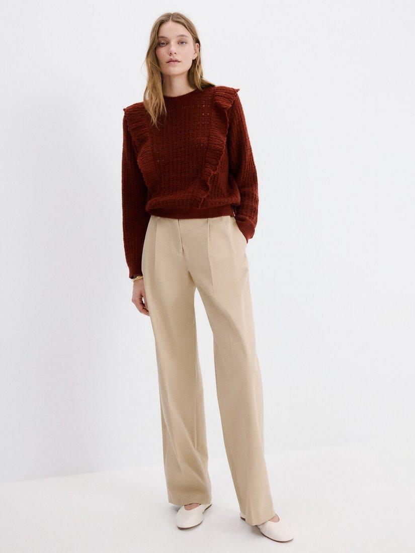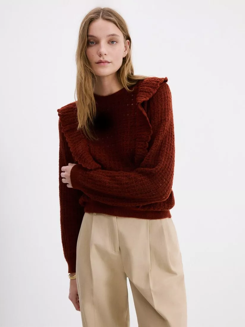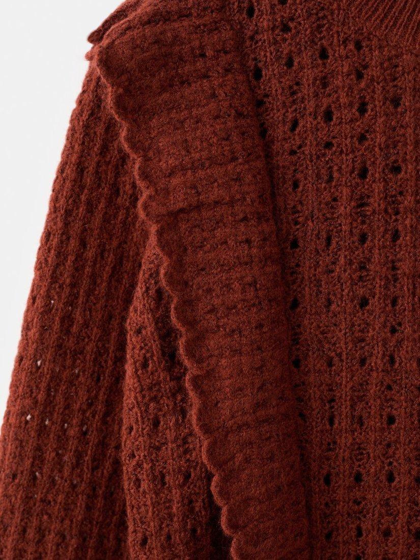 Medium knit jumper with a ruffle detail, round neck and simplistic details that will stand out with a pair of jeans or smart trousers.