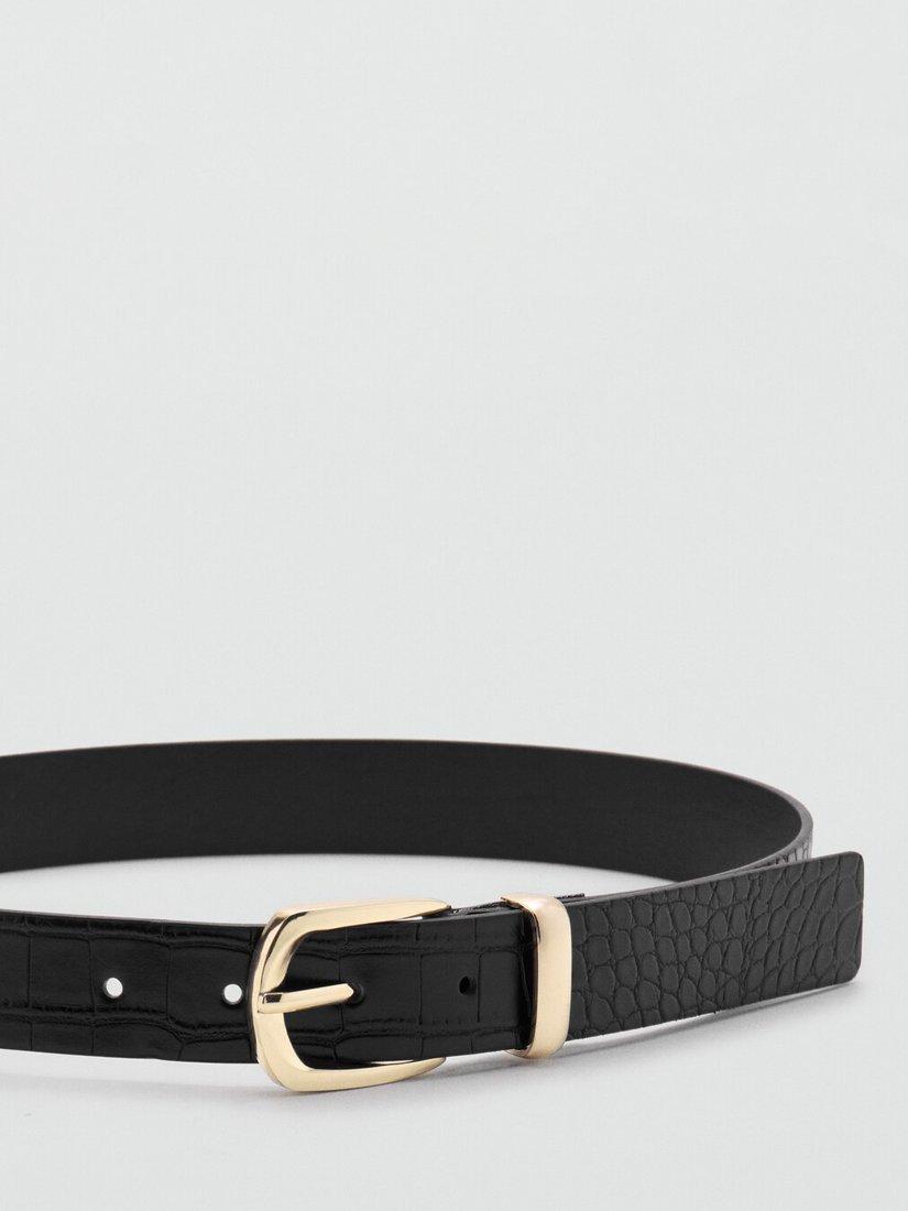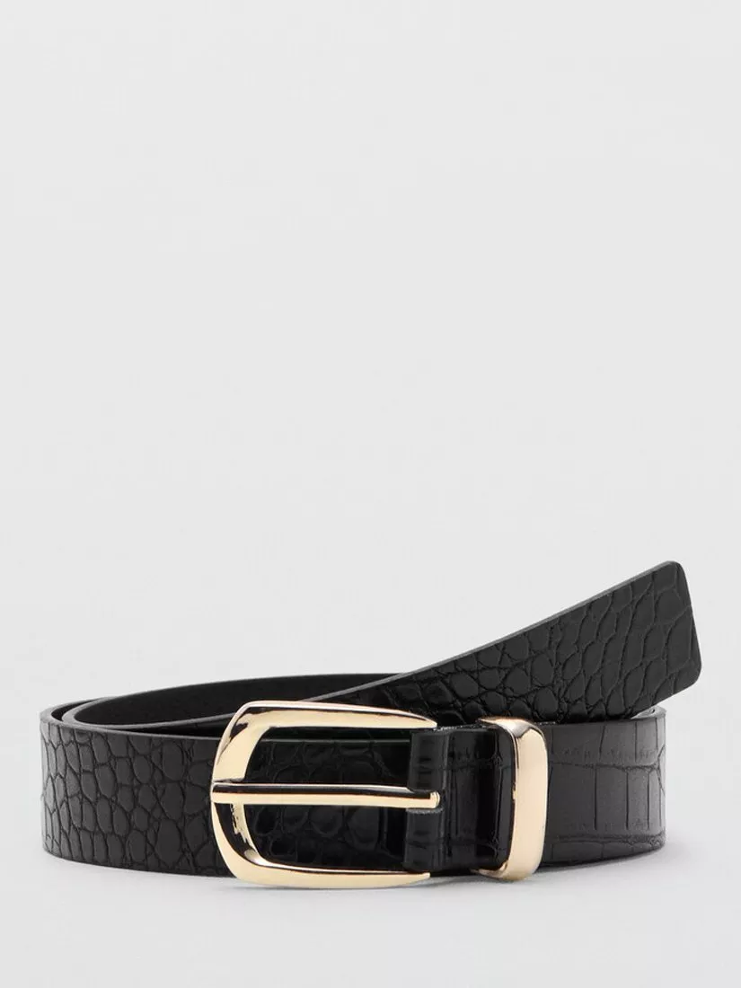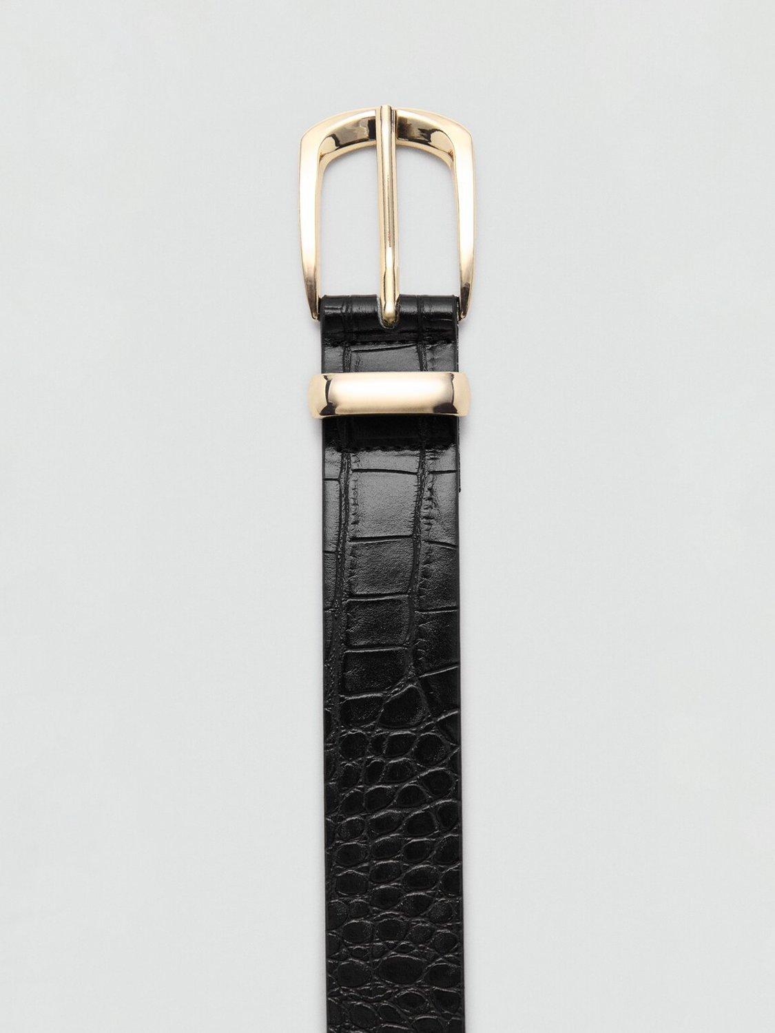 A sculpted buckle and textured strap define a sleek silhouette, adding statement sheen to tailored suiting or evening attire.