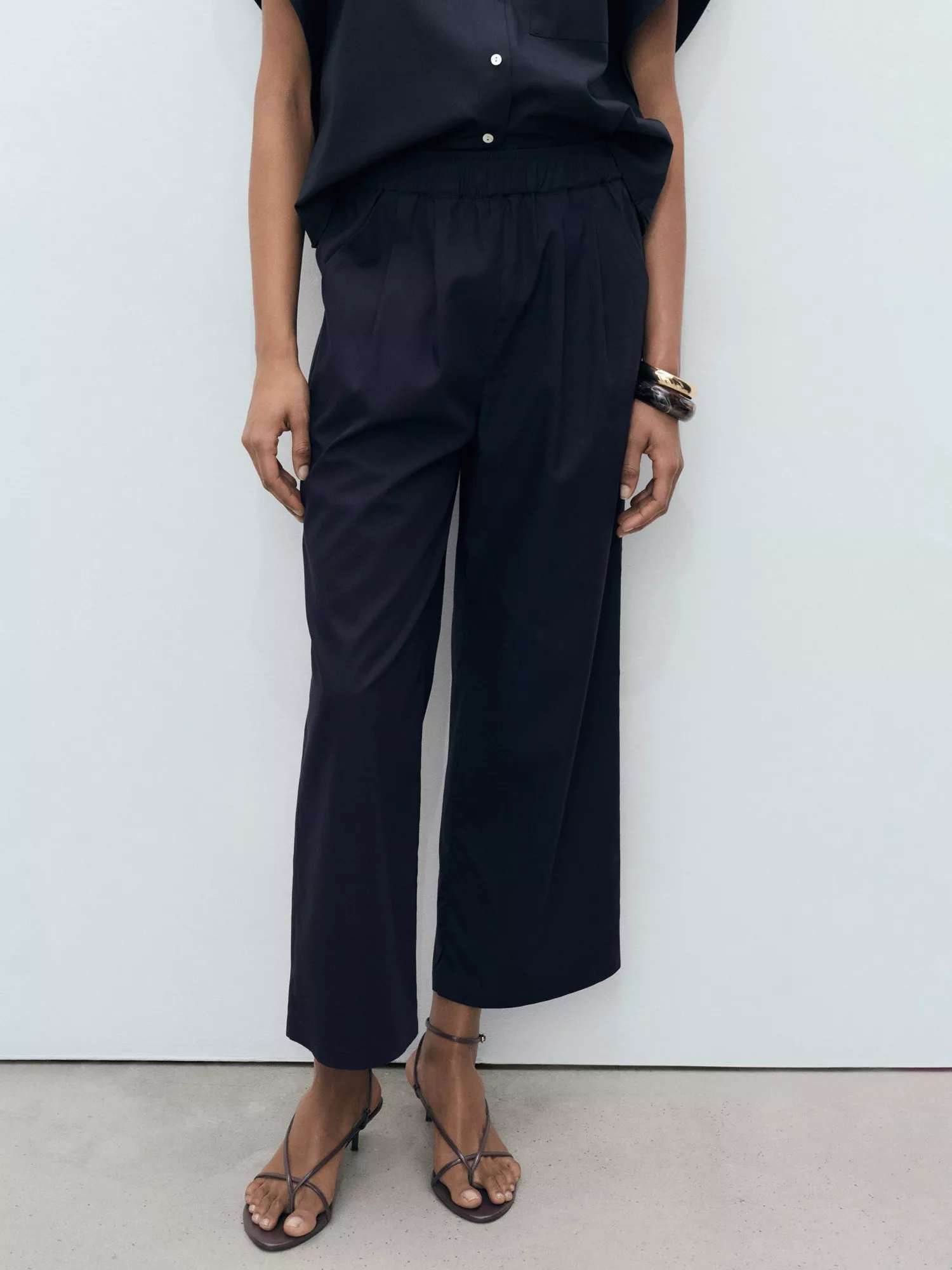 A pair of clean lined, no-nonsense straight-leg trousers by Mango with a cotton blended base. They feature a mid rise with an elasticated waist and a neatly cropped length.
