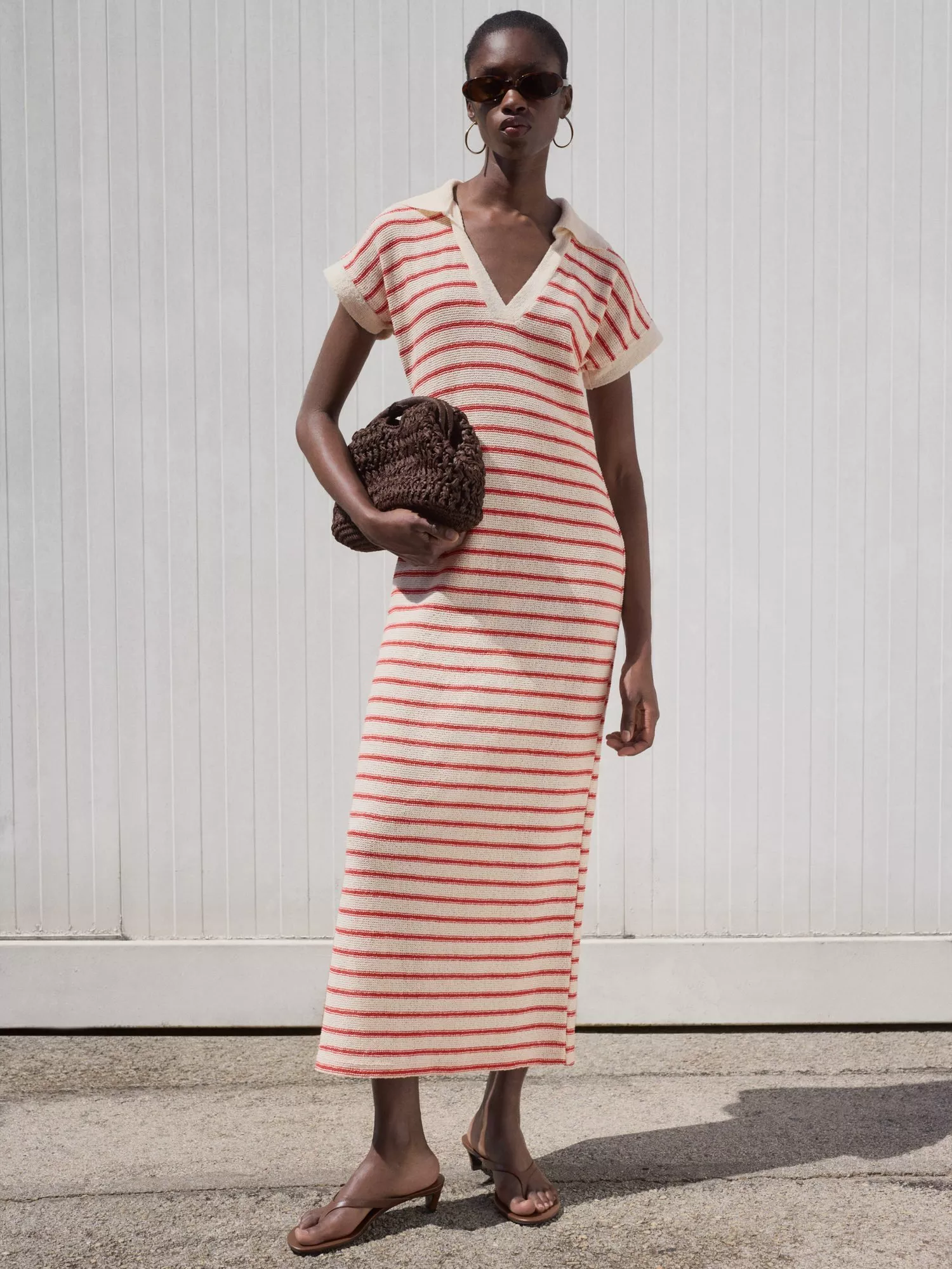 This striped midi dress combines playful lines with a clever V-neck for everyday comfort. Its straight fit works for any occasion, giving you confidence and ease wherever you go.