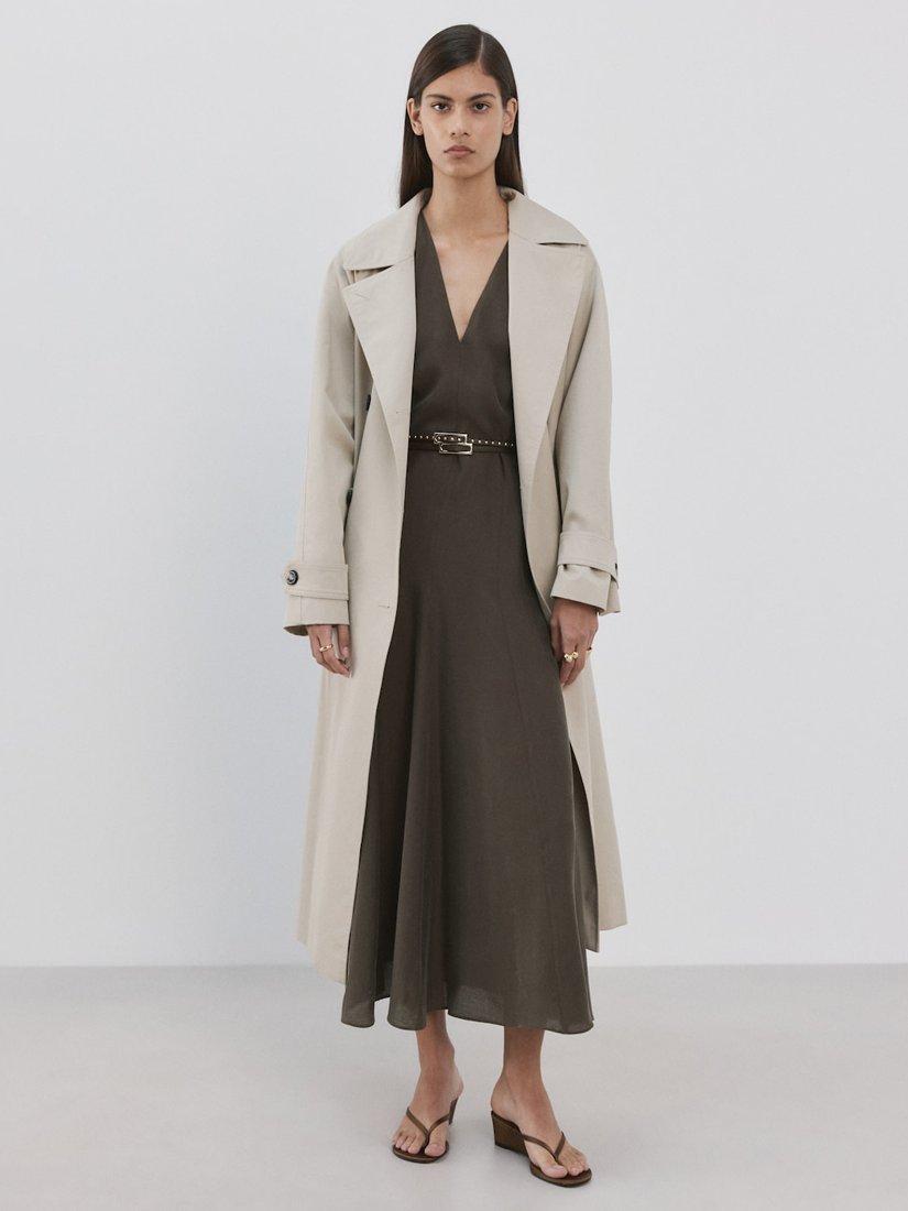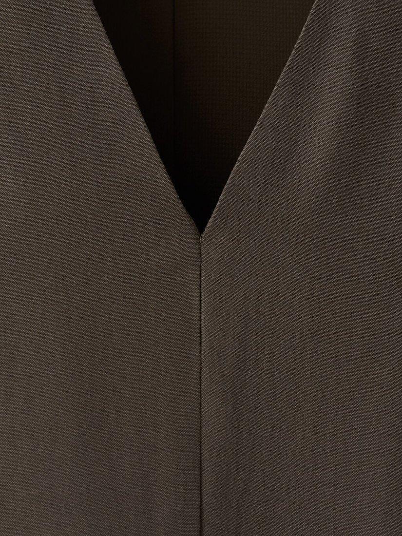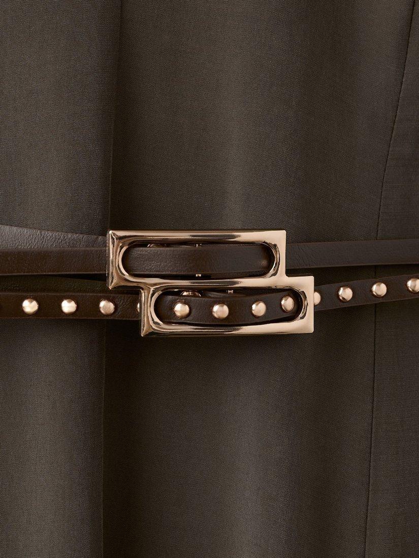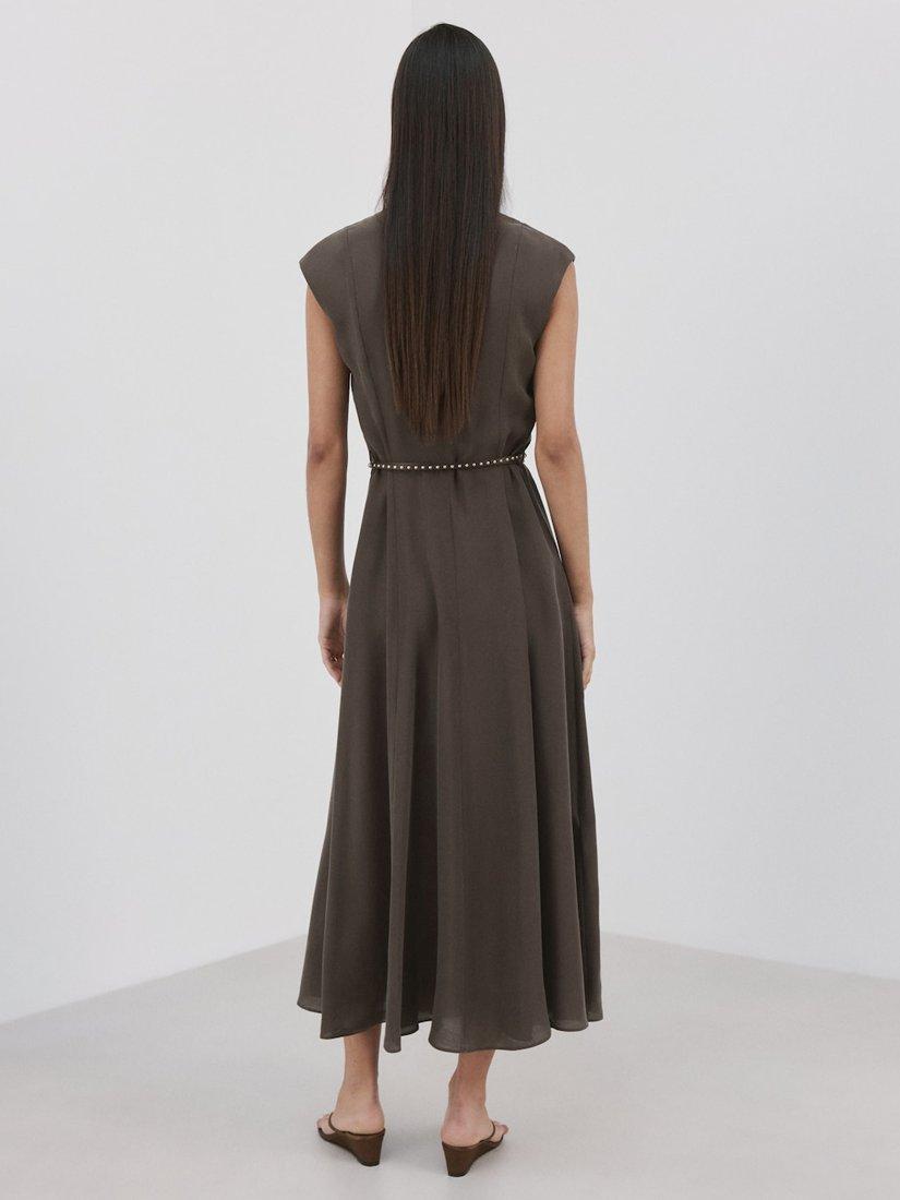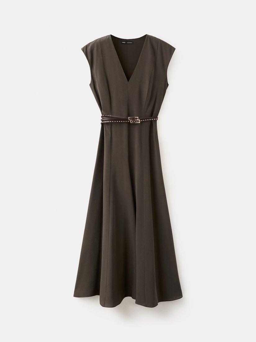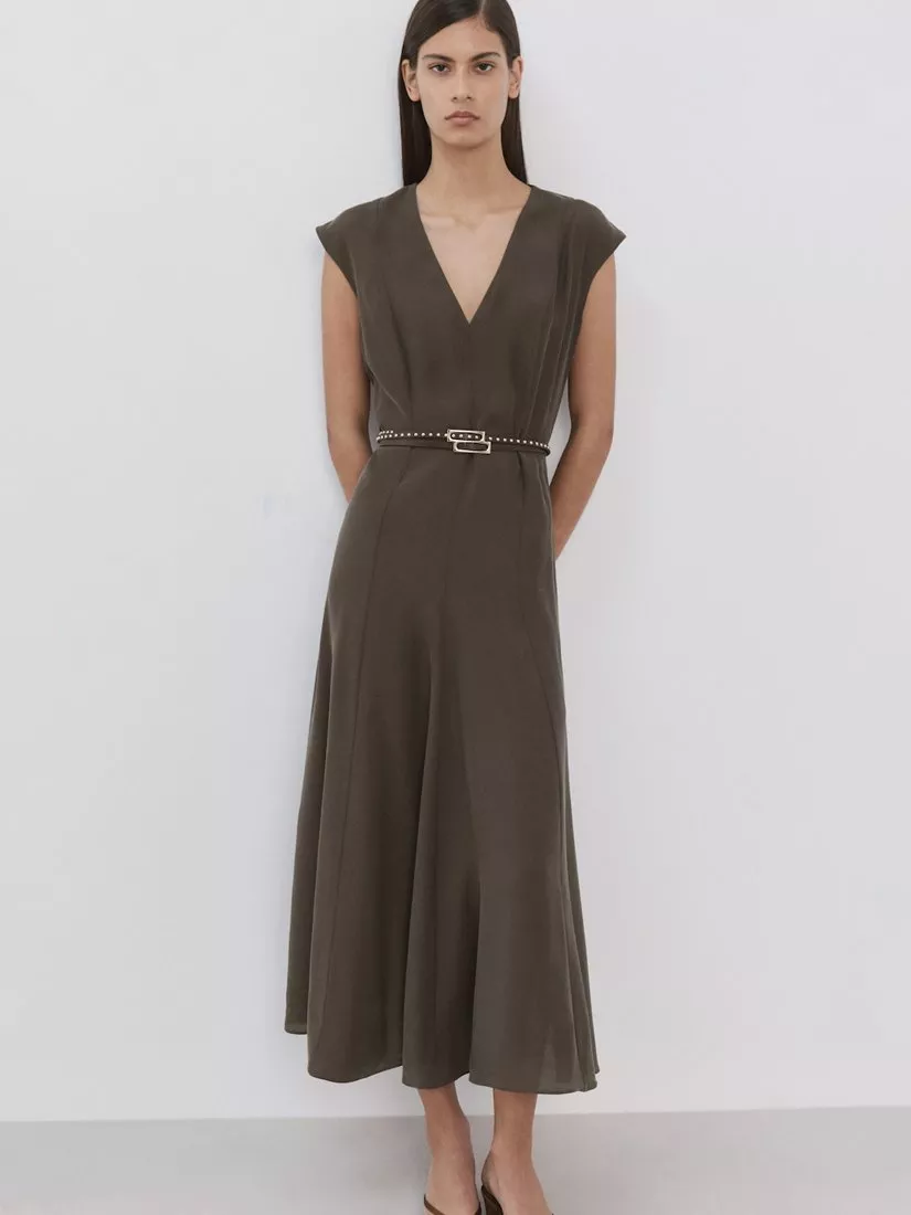 A sculpted V-neck silhouette that skims the waist and falls into a flowing midi skirt, cinched by a slim belt for confident day-to-night allure.