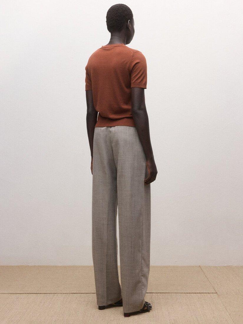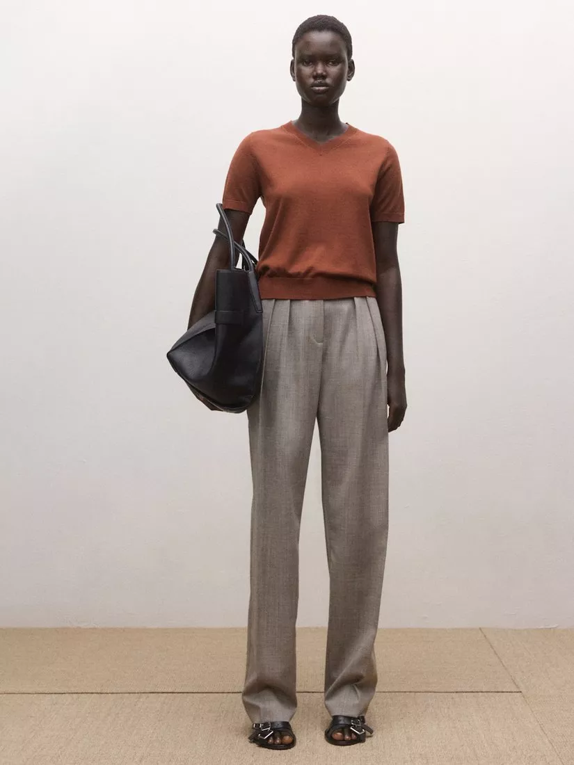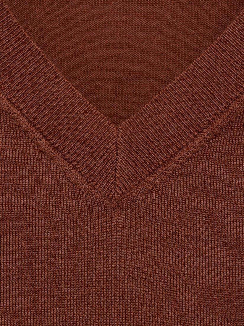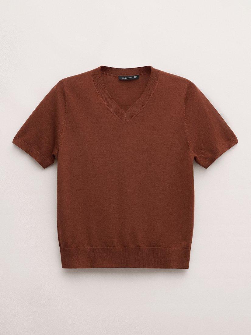 This pure wool knit top features a sharp V-neck and short sleeves, making it easy to layer or wear alone.