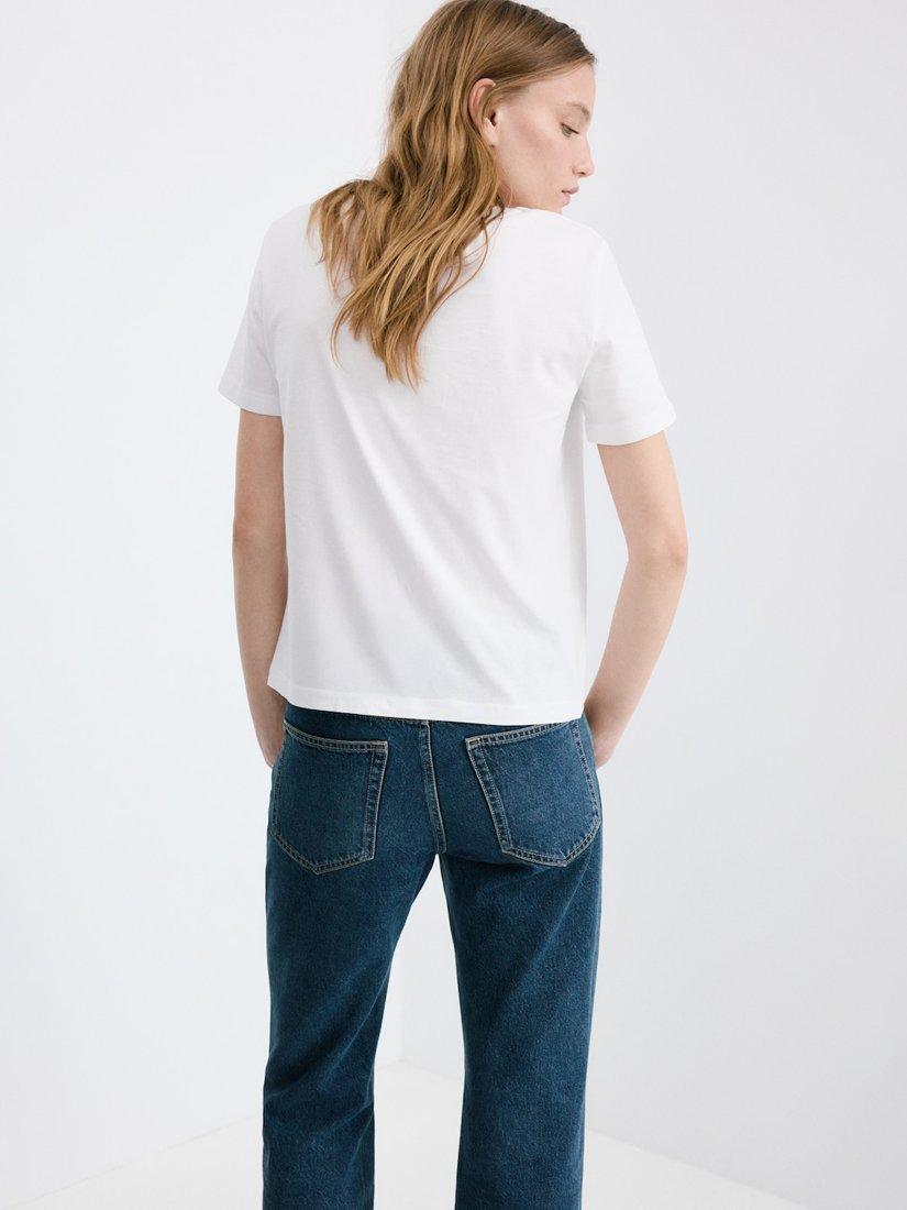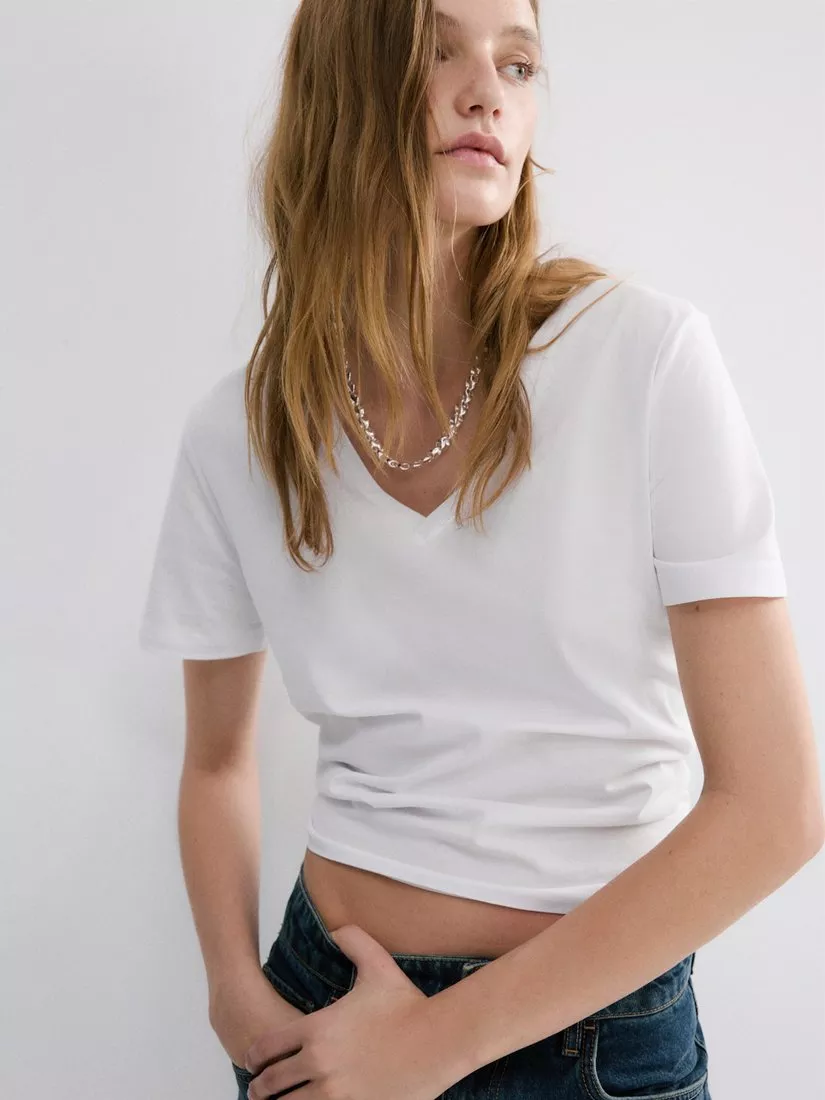 A relaxed T-shirt in breathable cotton, designed with a V-neck and loose fit for warm days. Short sleeves offer comfort, making it a practical choice for summer outings or everyday layering.