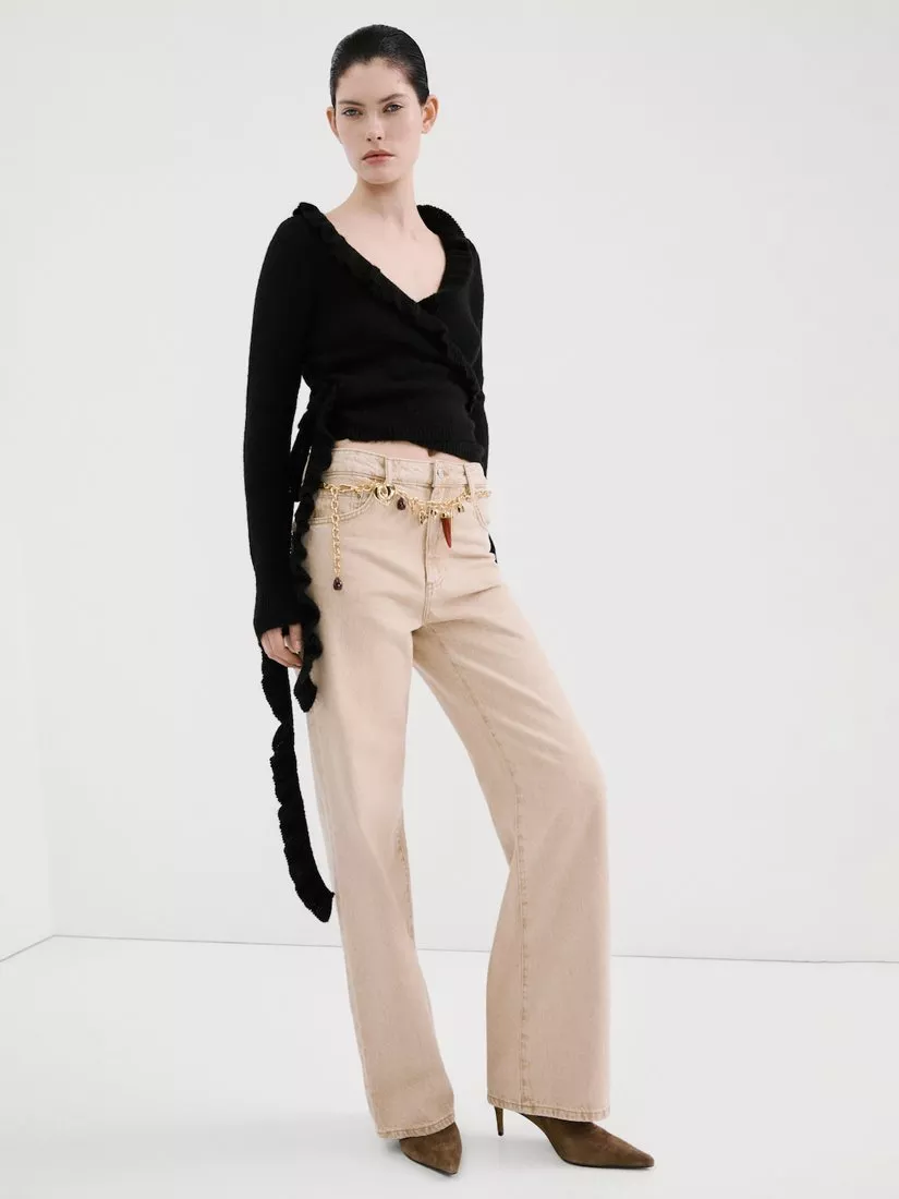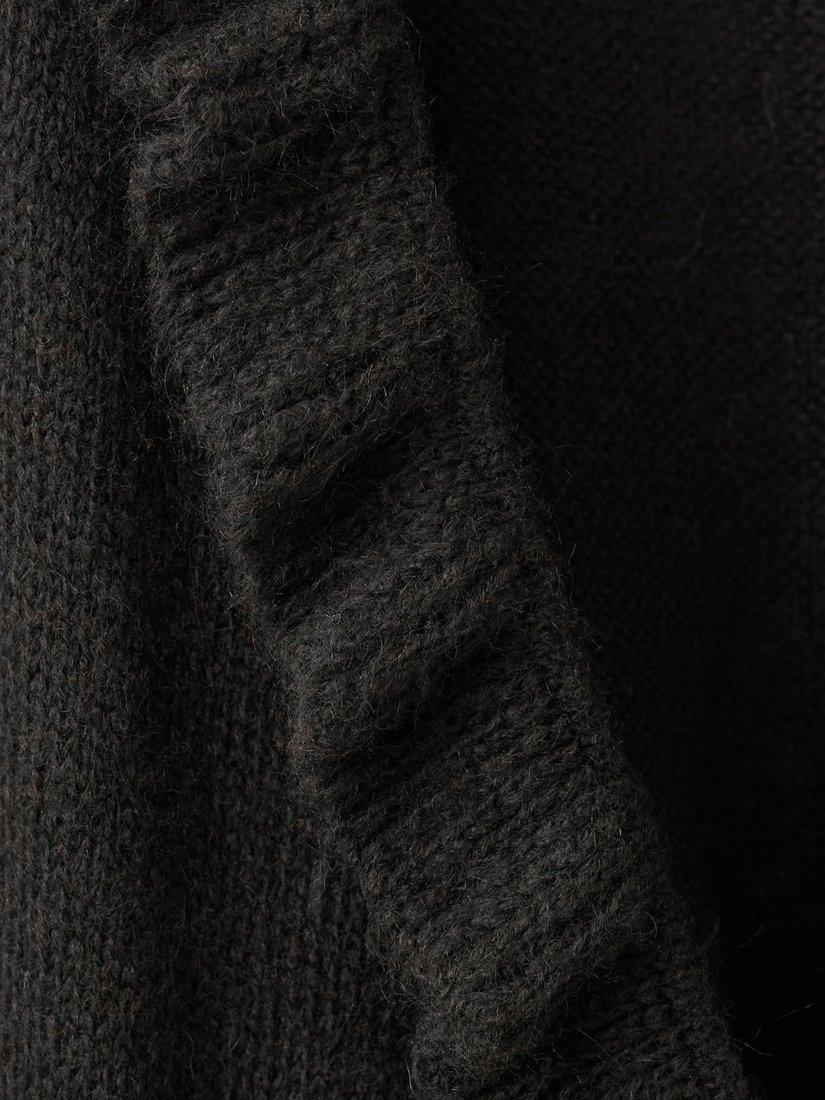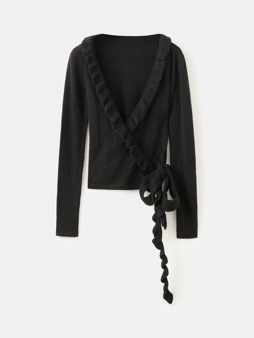 This ruffle knit cardigan features a straight silhouette with a V-neck, long sleeves, and delicate ruffle detailing, finished with a stylish side knot closure for a feminine and elegant touch.