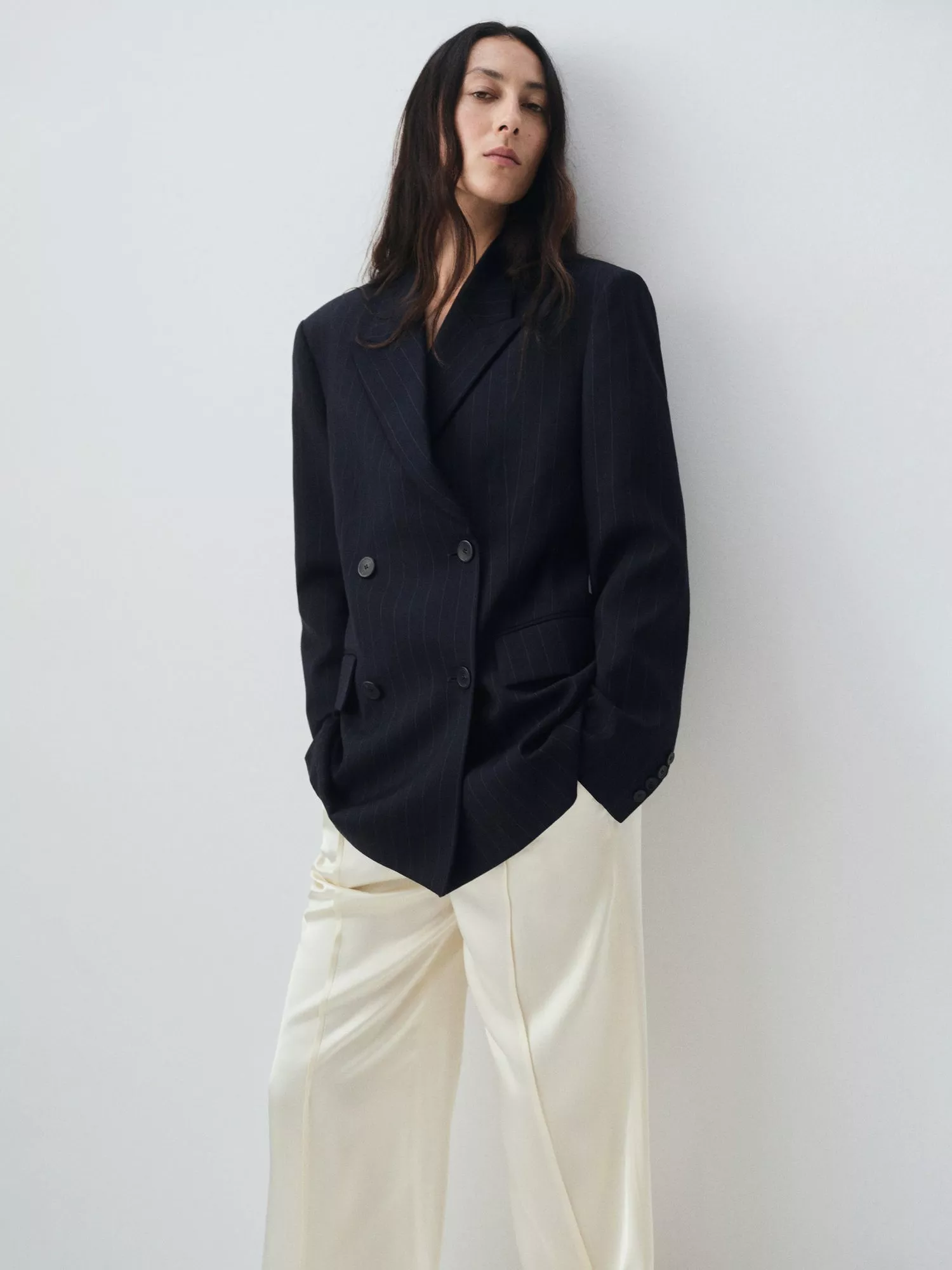 MangoVarsovia Pinstripe Double Breasted Blazer, Navy