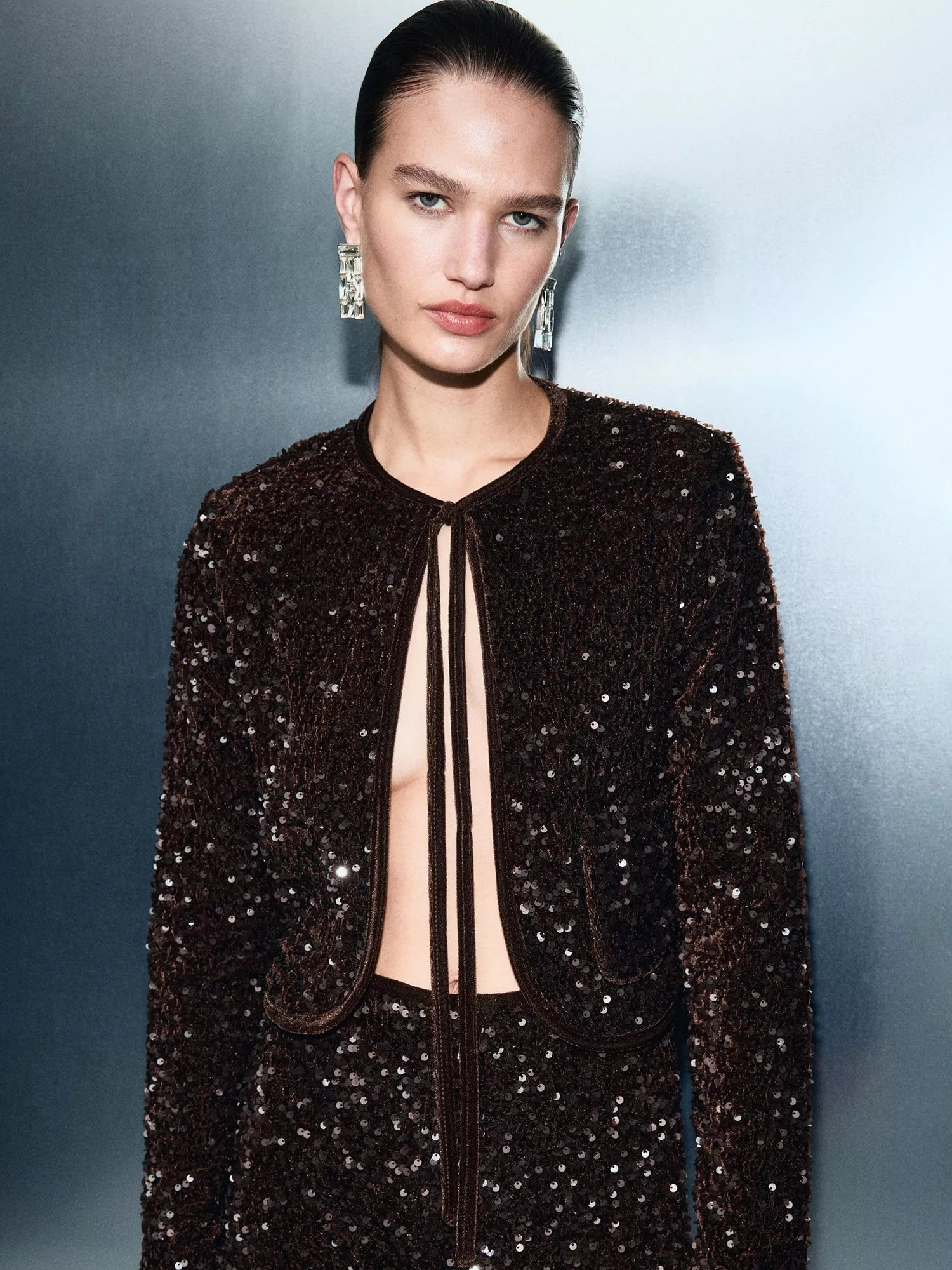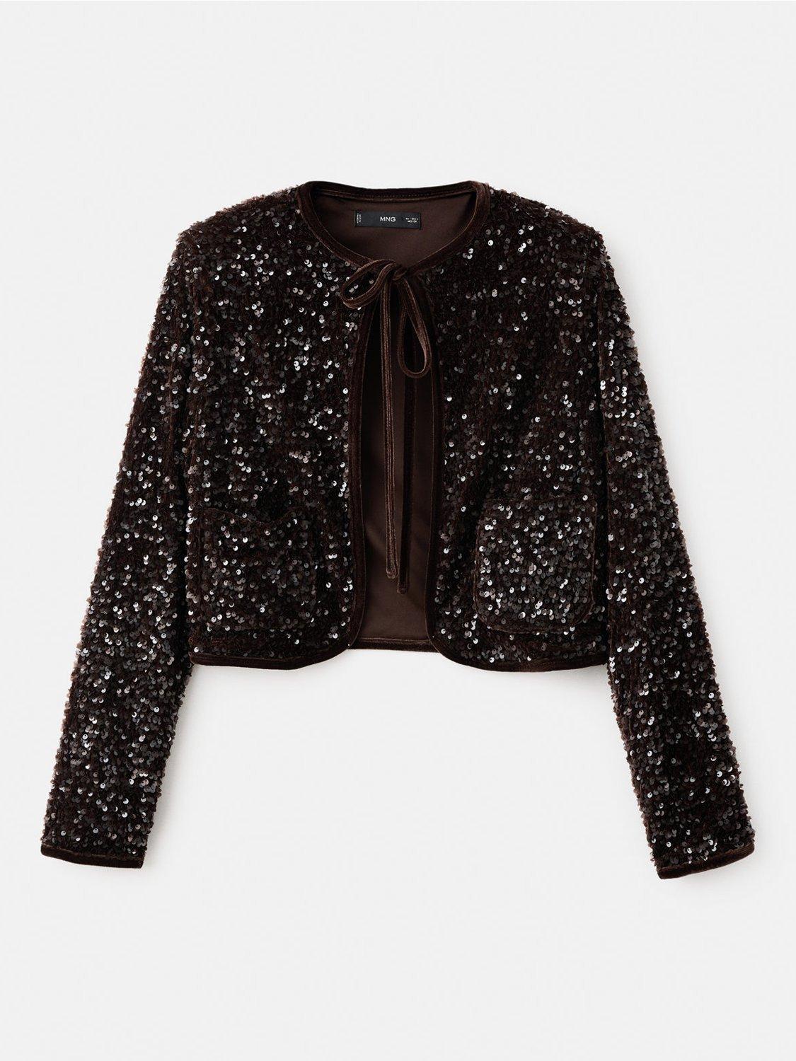 A party-ready piece, this regular-cut jacket is heavily embellished with sequins bringing flair to any occasion. Finished with a smooth lining and a tie detail at the neck.