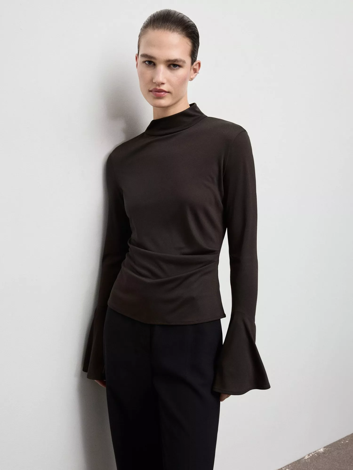 Long flared sleeves add a touch of drama to this top, featuring side ruffles, an on-trend detail we love. A fitted design with a high collar, it has a zip fastening on the back section.
