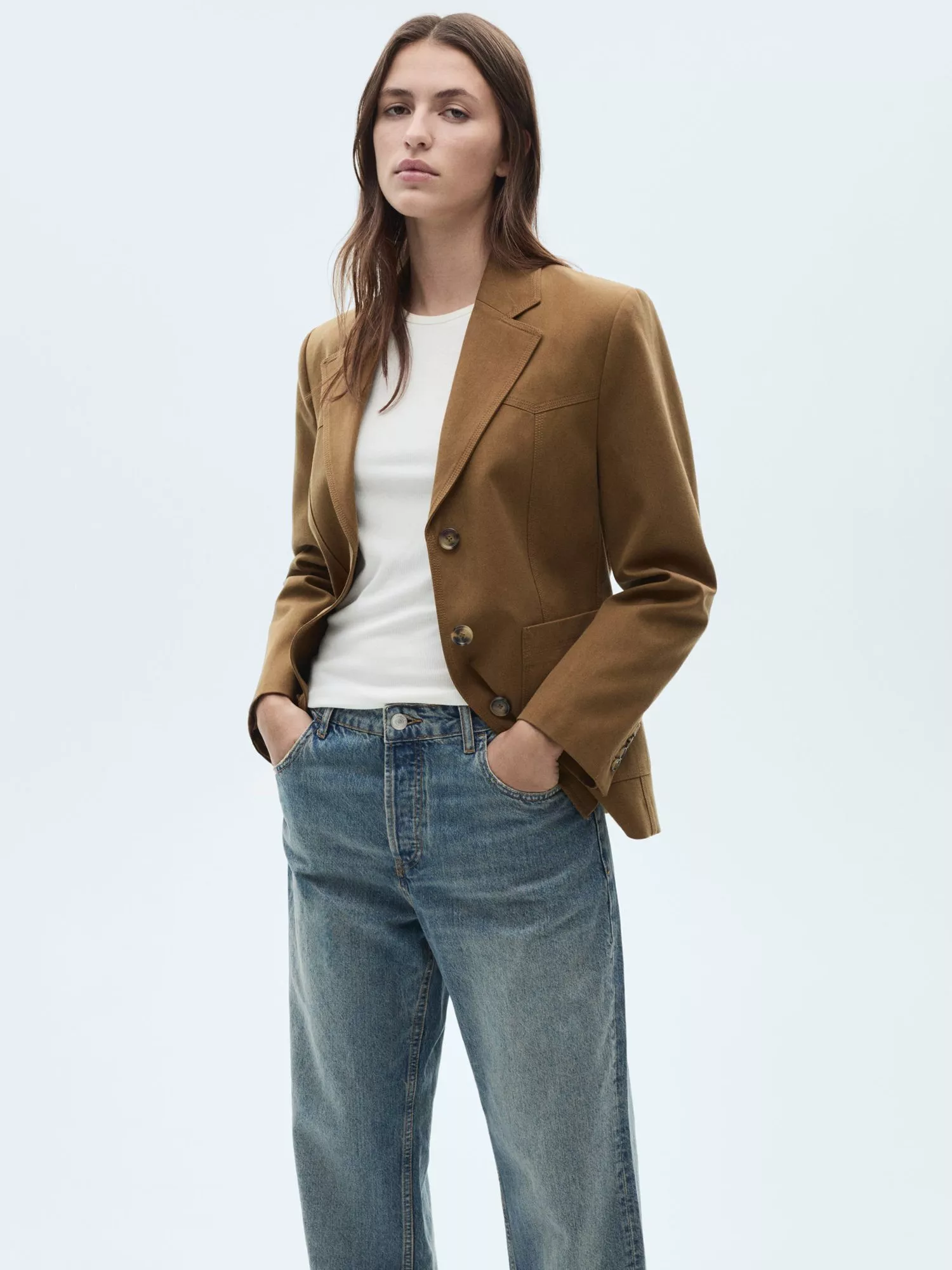 - 50% lyocell, 50% cotton. Lining: 55% polyester, 45% viscose.