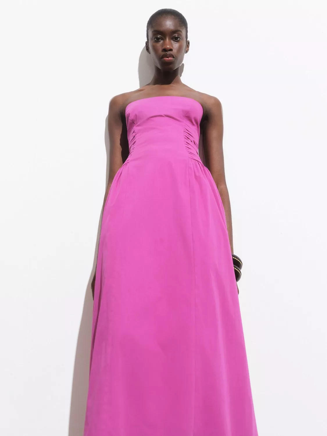 With gathers through the bodice and a full skirt, this midi dress from Mango is rendered in a cotton blend with a bandeau neck.