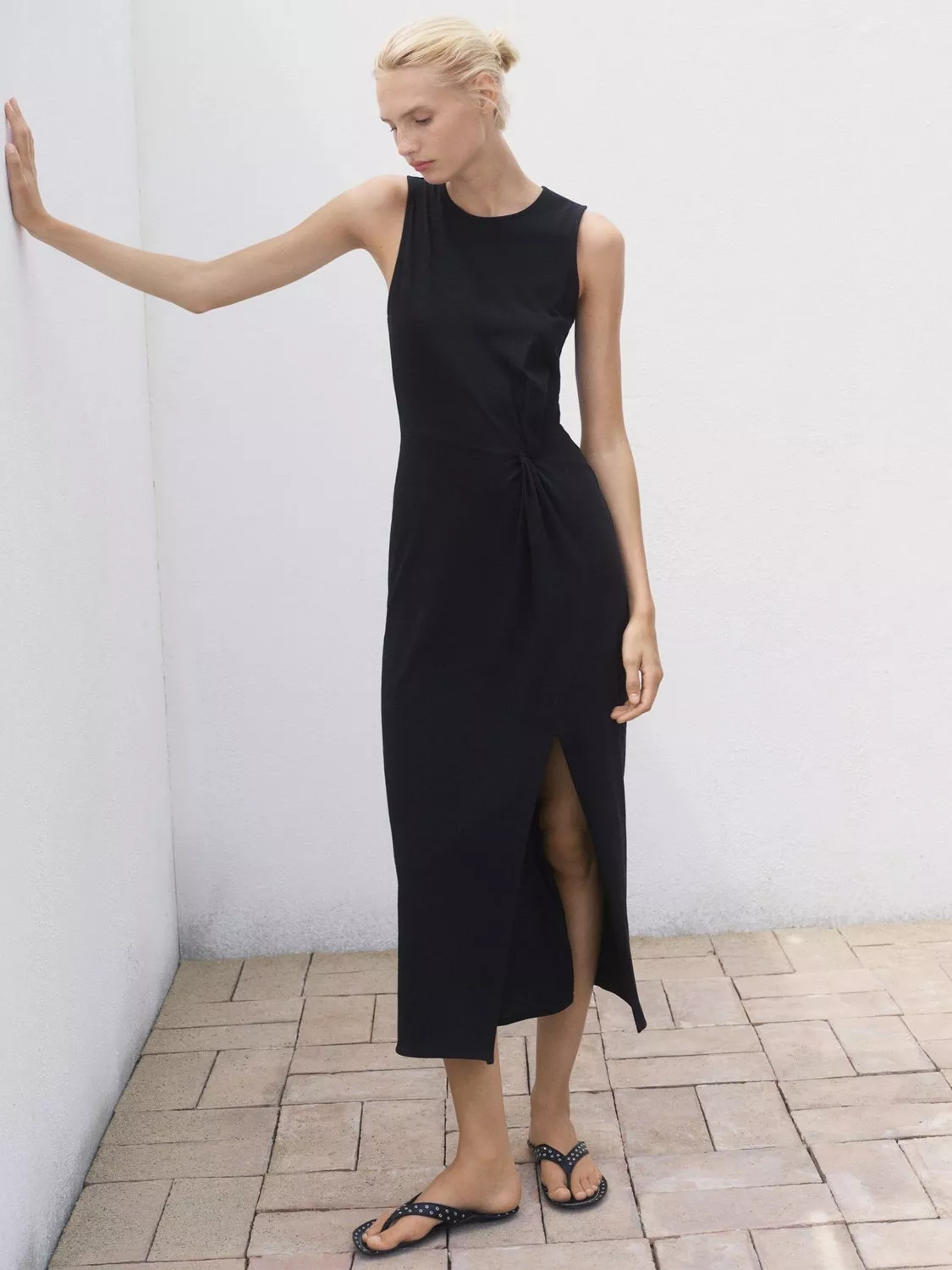 This sleeveless midi pencil dress in breathable cotton. The crew neck and simple design make it easy to style, ensuring you feel comfortable, capable, and ready for whatever comes your way.