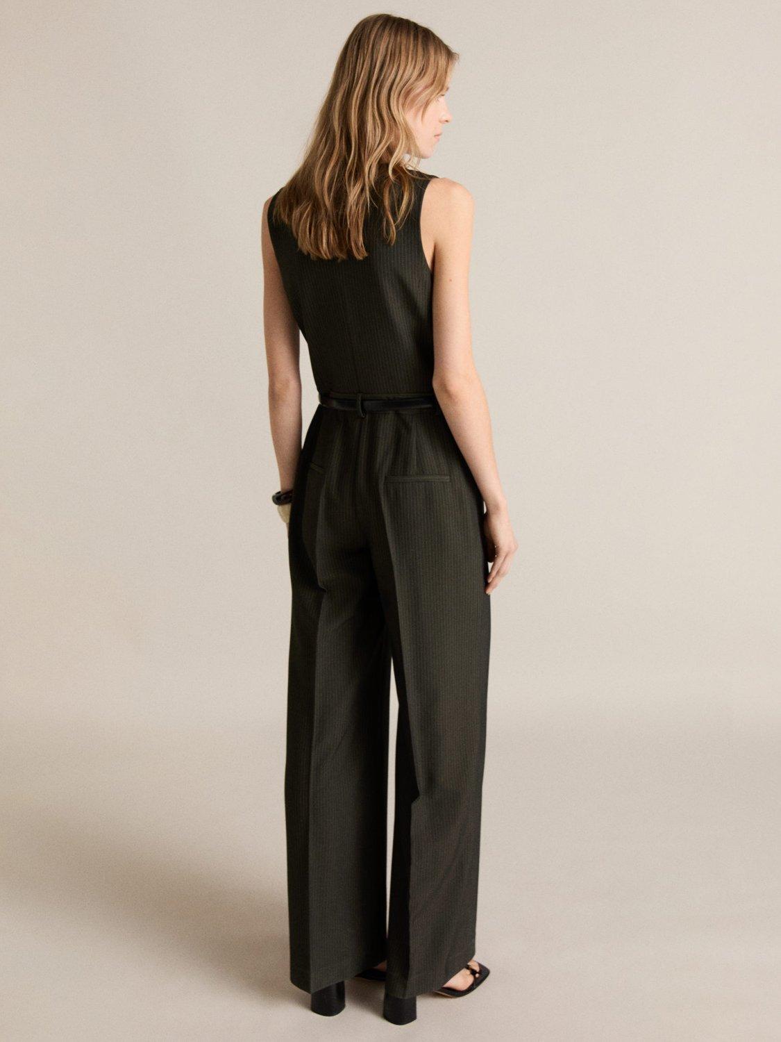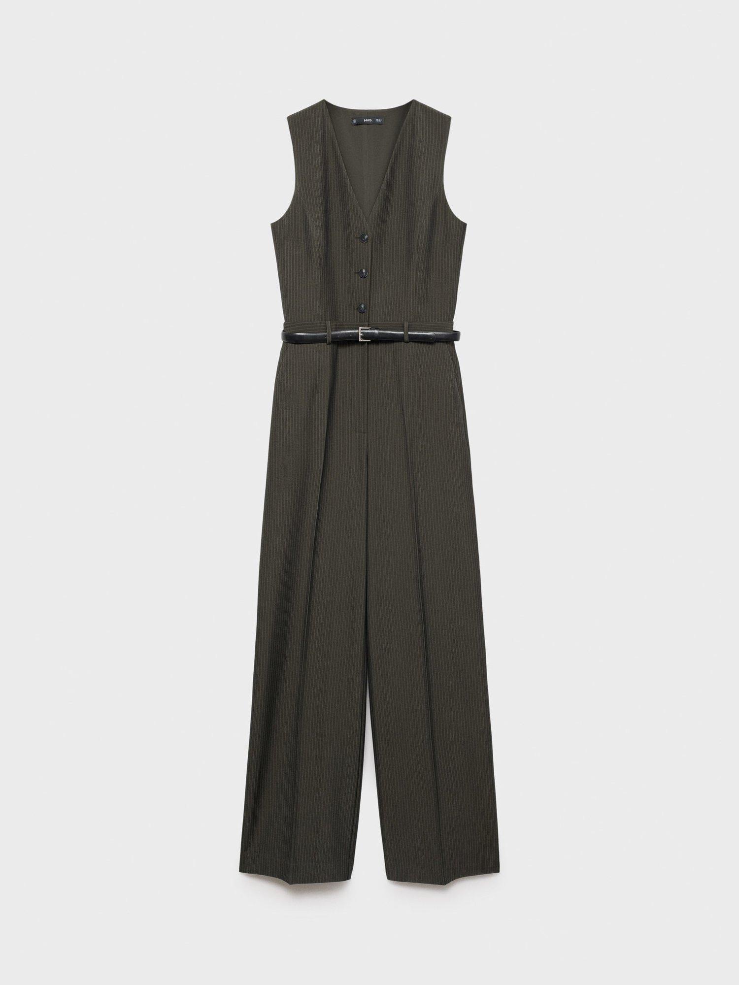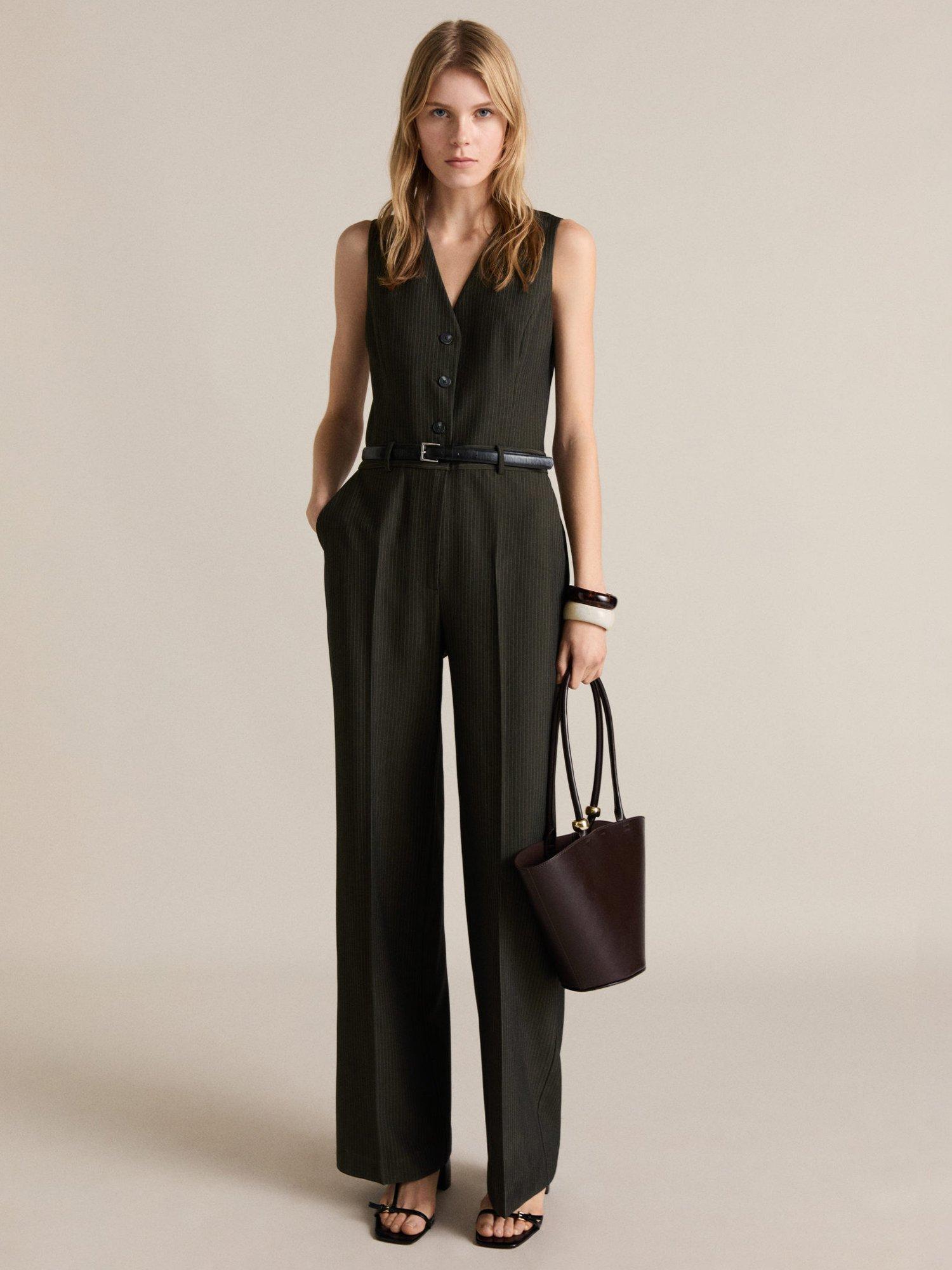 Kept refined with a v-neckline, this sleeveless jumpsuit from Mango falls to a flattering wide leg silhouette and is streaked with pinstripes.
