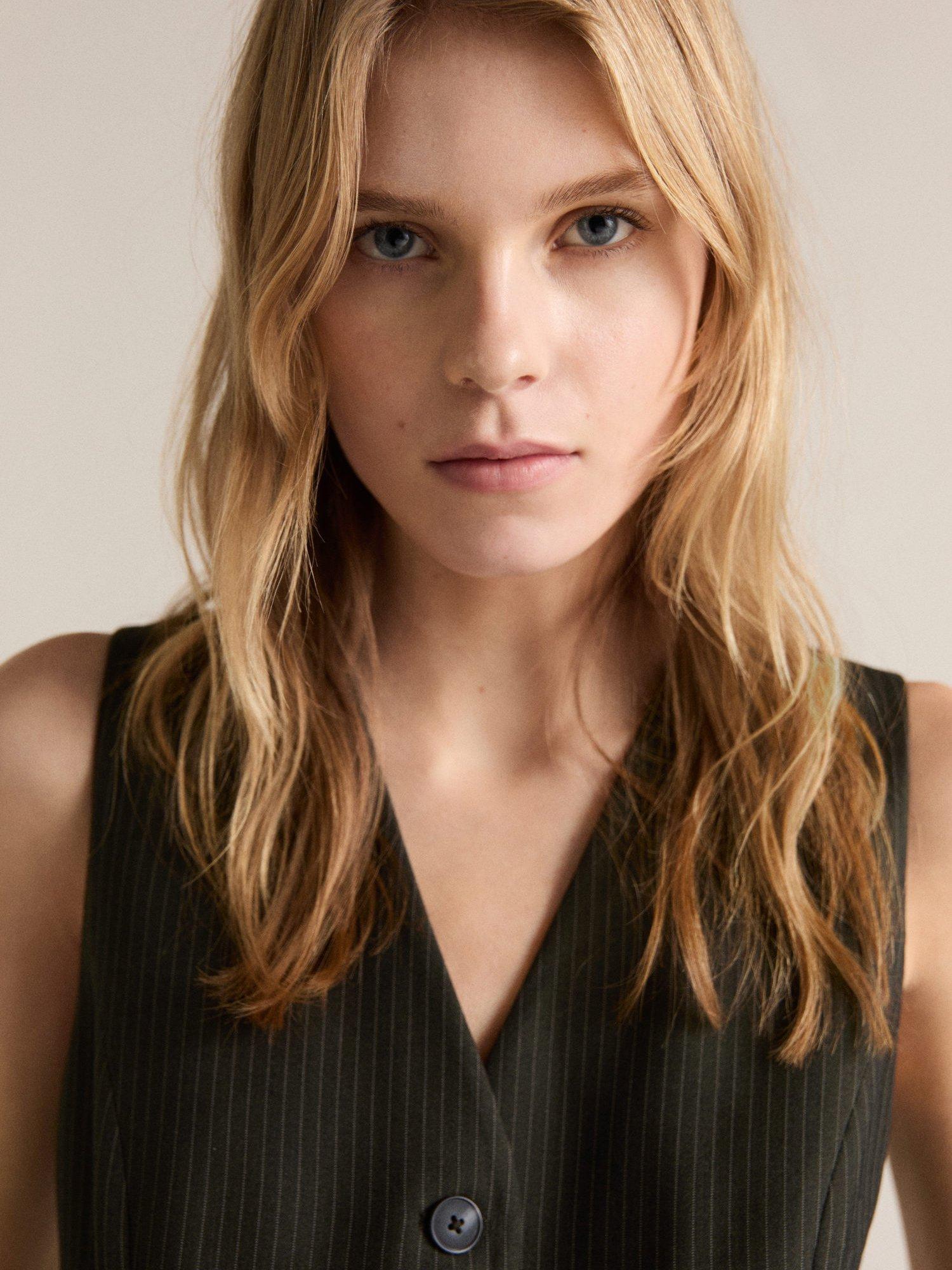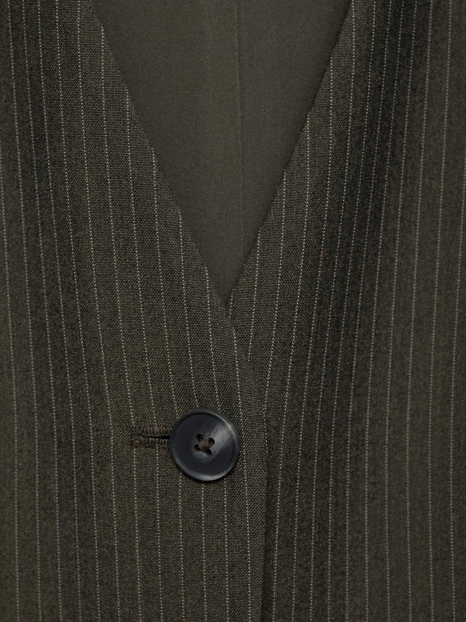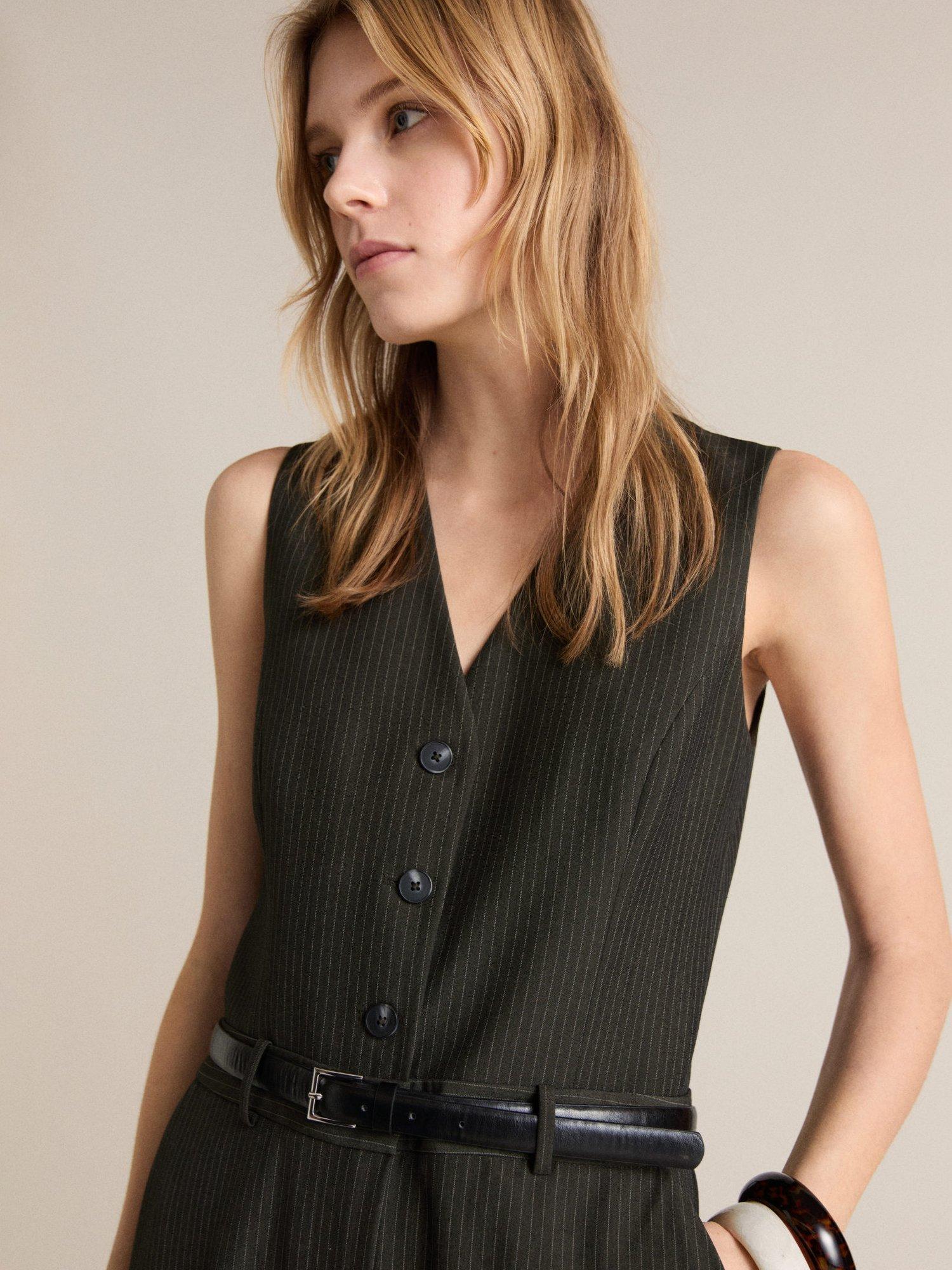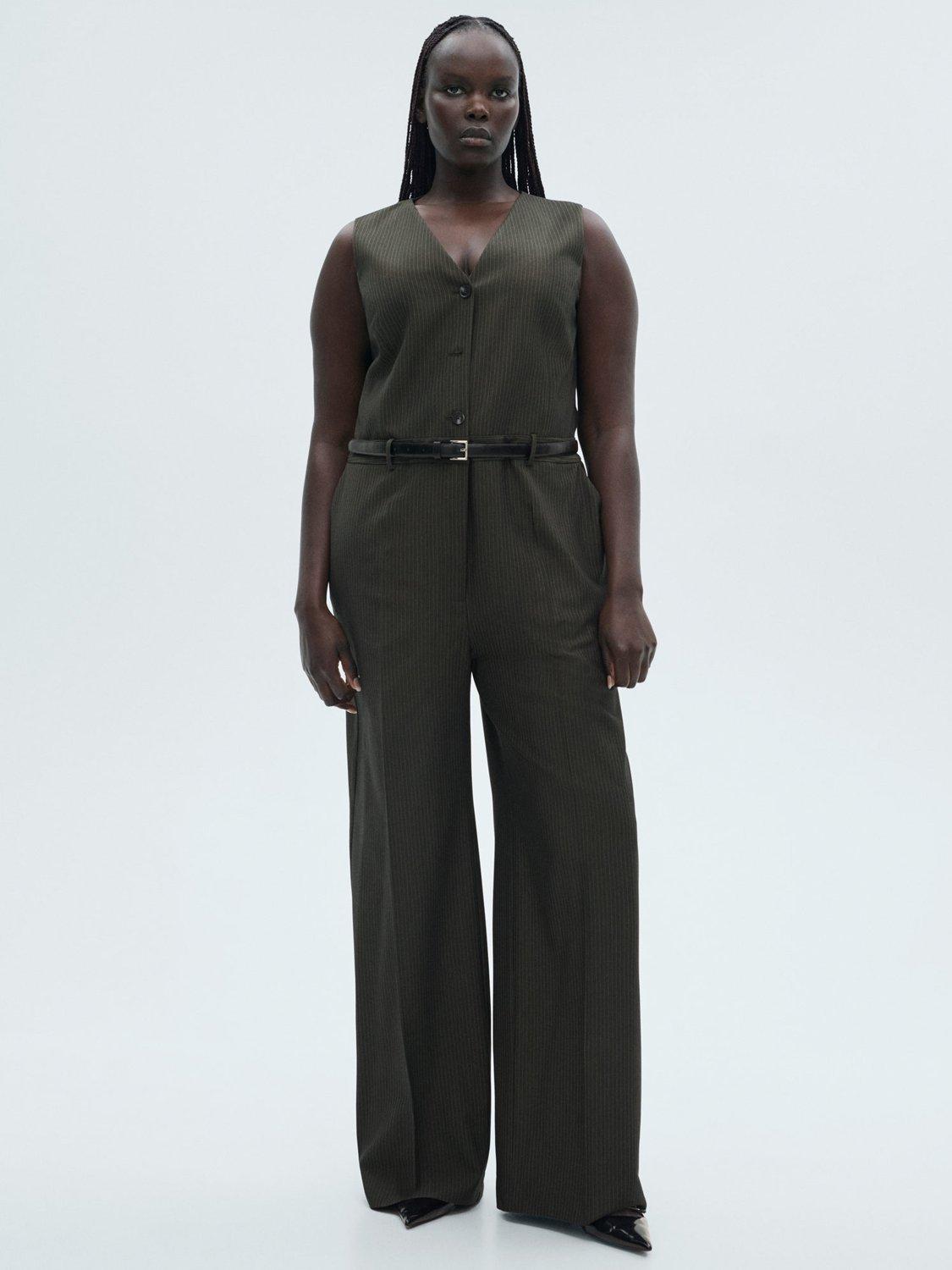 Kept refined with a v-neckline, this sleeveless jumpsuit from Mango falls to a flattering wide leg silhouette and is streaked with pinstripes.