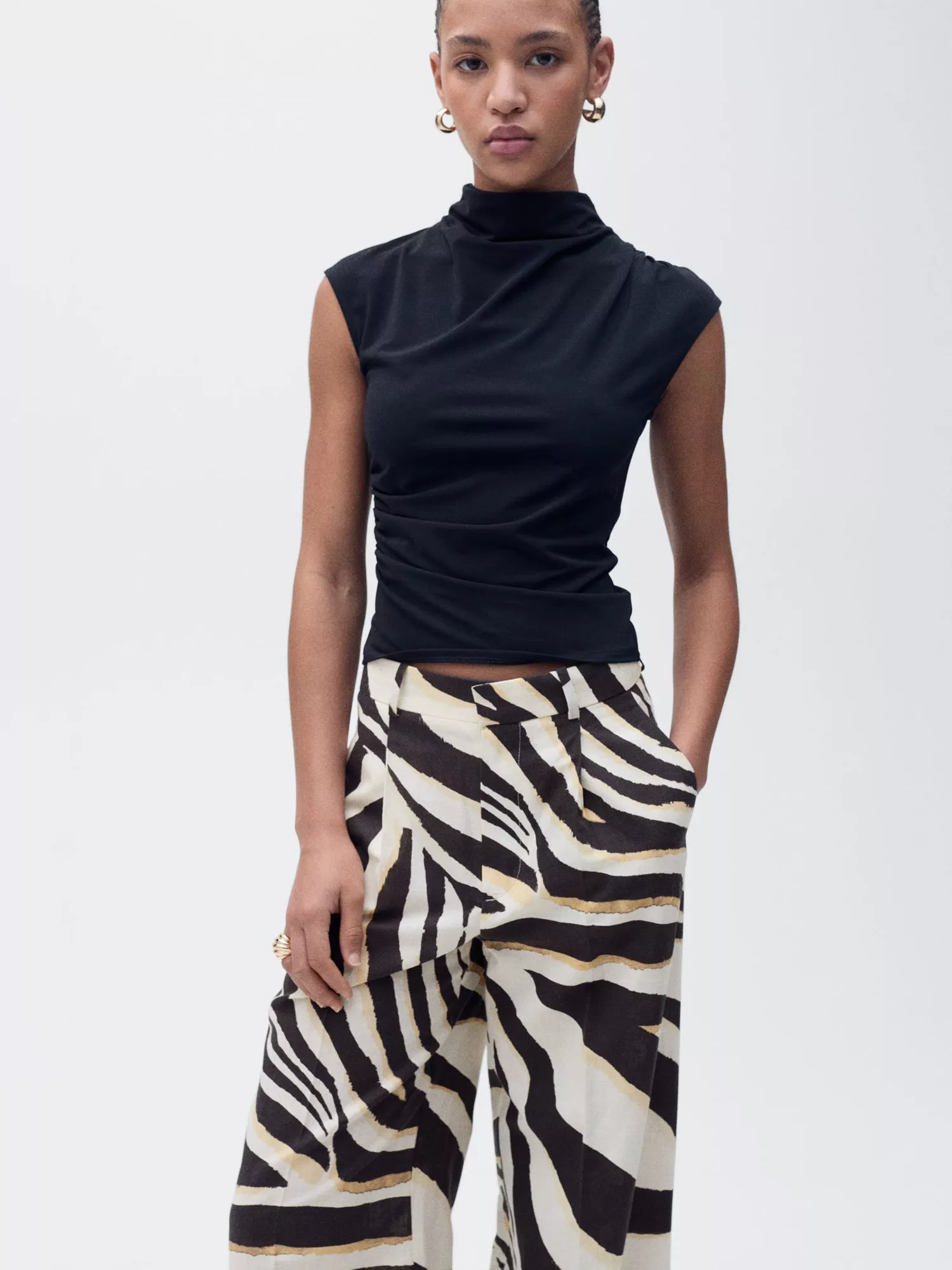 Soft and lightweight in a linen-cotton blend, this pair of trousers from Mango sit high on the hips and come in a wide-leg cut with a striking zebra print.
