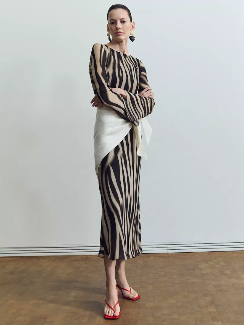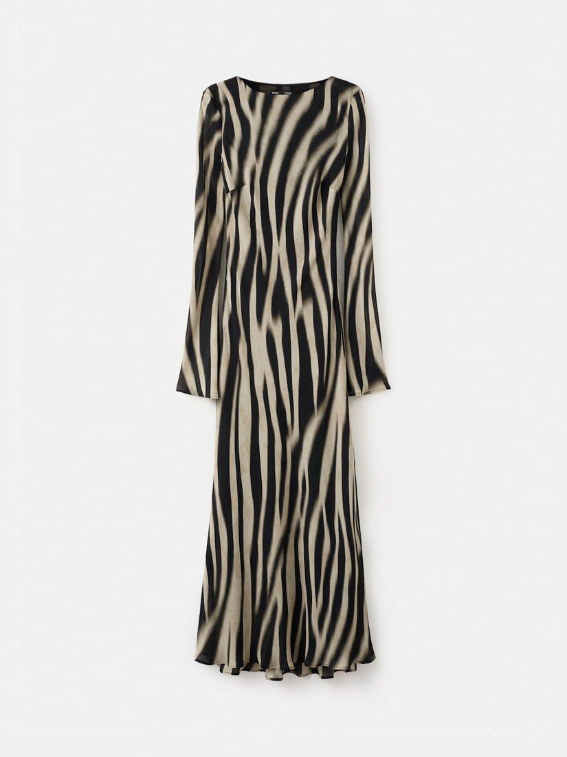 Proof that a fit and flare shape is a classic for a reason. This long-sleeved midi dress by Mango features a slash neck and eye-catching, animal print.
